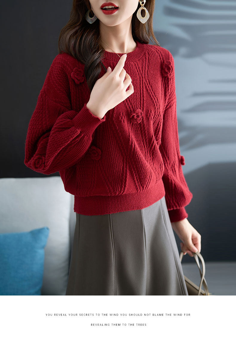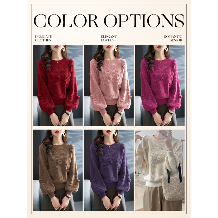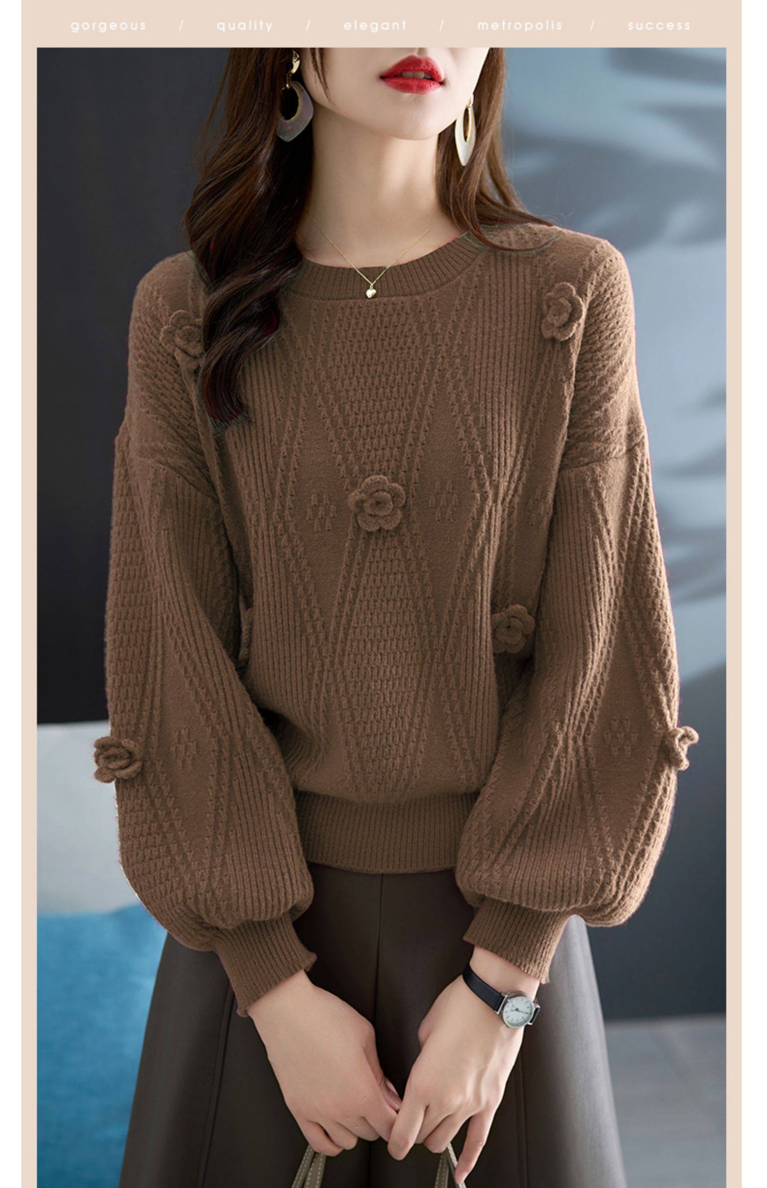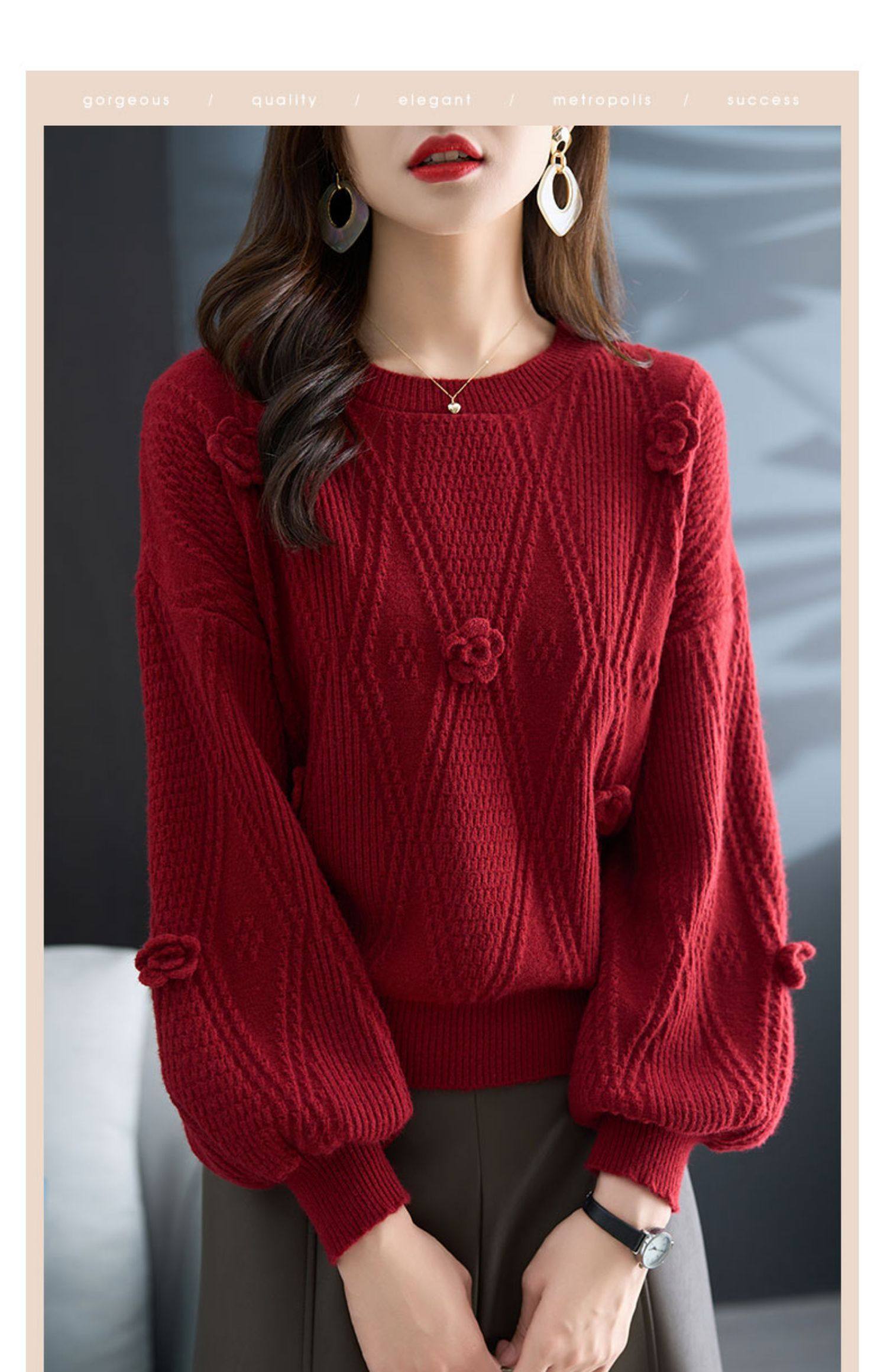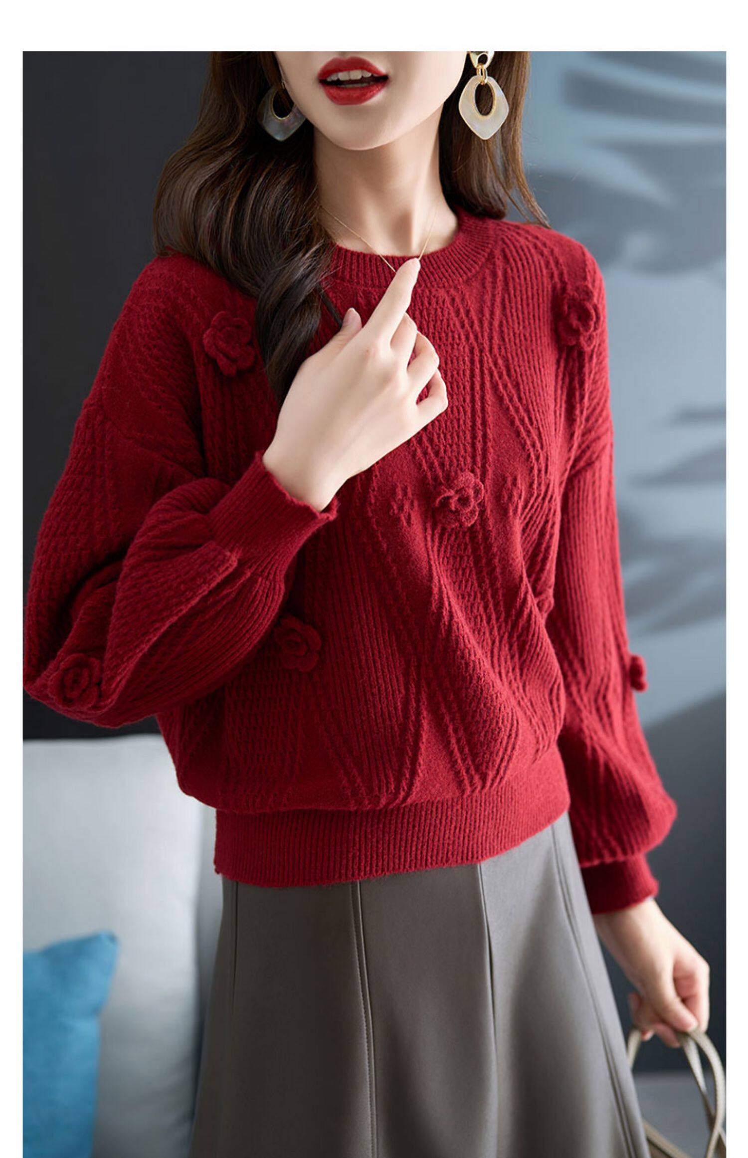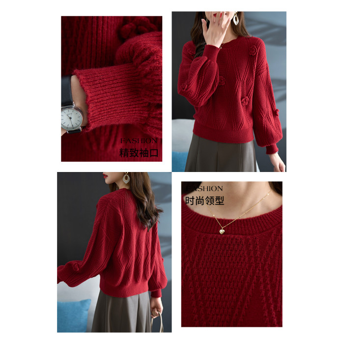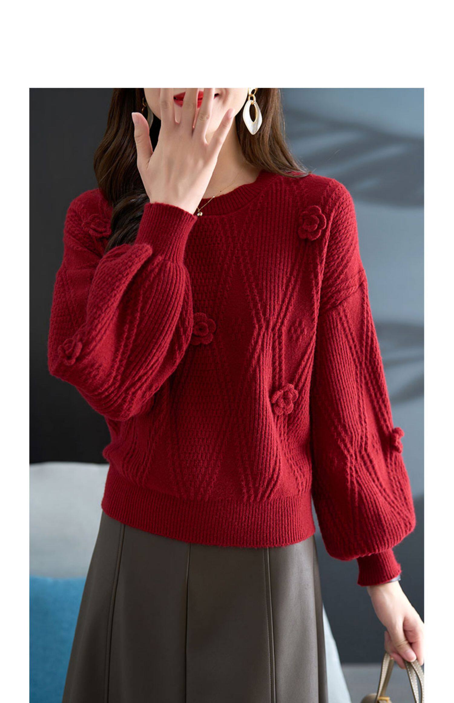 圓領針織衫上衣女秋冬胖mm寬松遮肚子燈籠袖超好看粉色毛衣打底衫