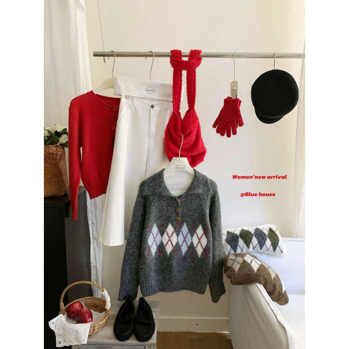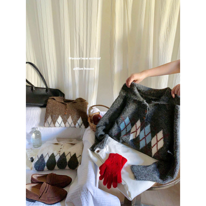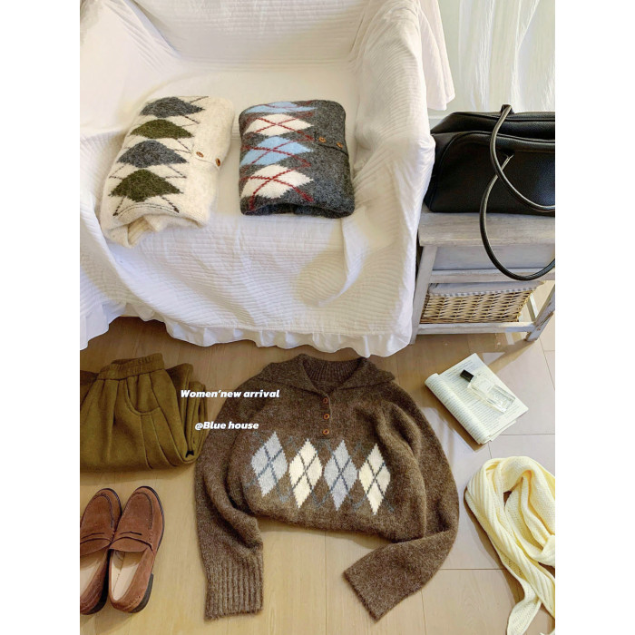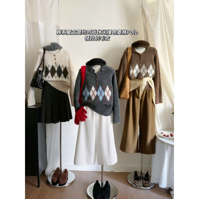 日系學院風復古撞色菱格翻領套頭毛衣女冬加厚軟糯寬松針織衫上衣