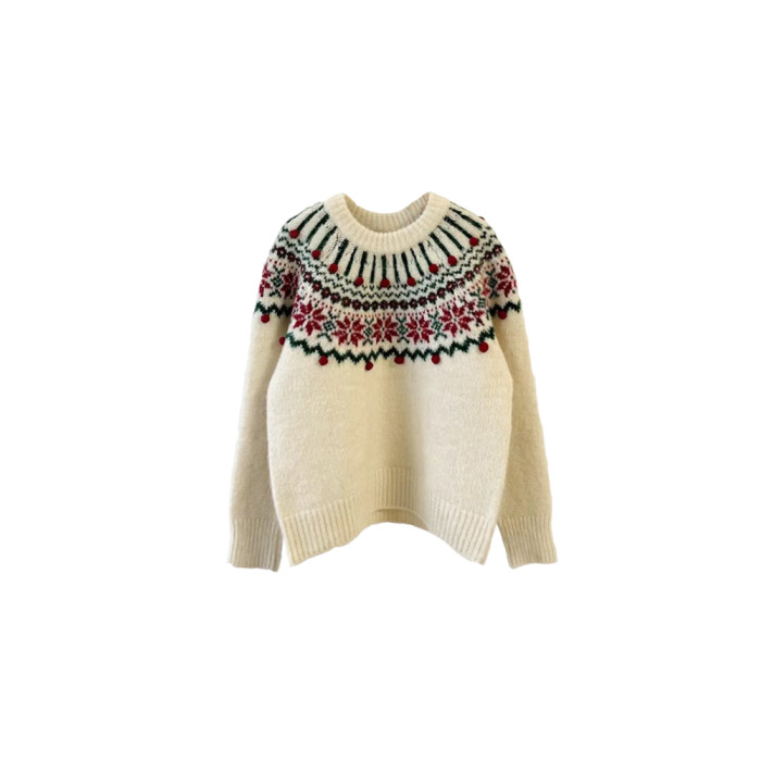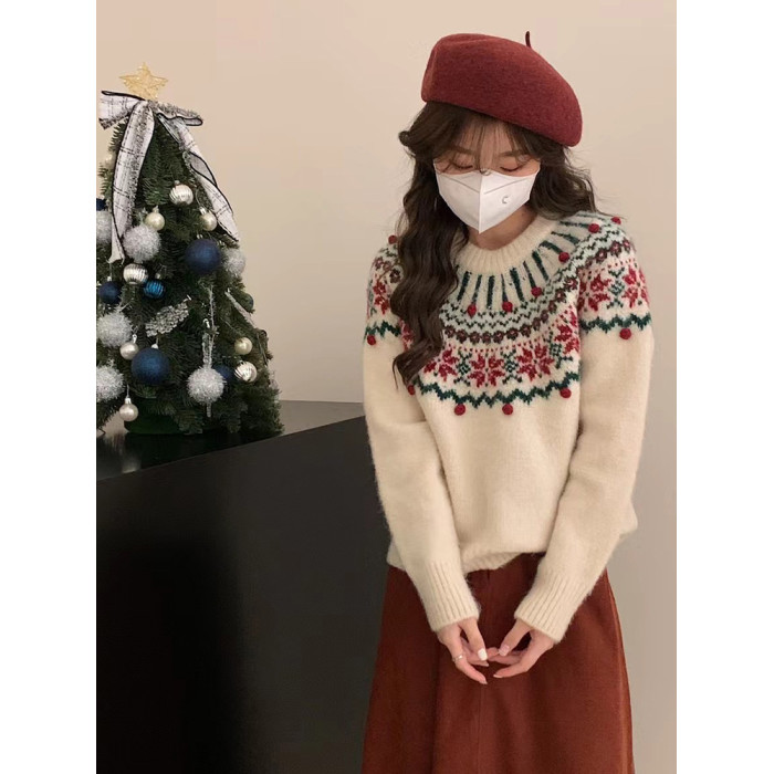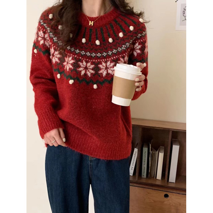 復古提花聖誕新年紅色費爾島毛衣女套頭寬松秋冬加厚內搭針織上衣