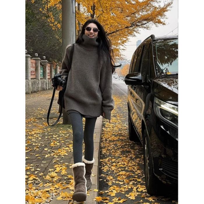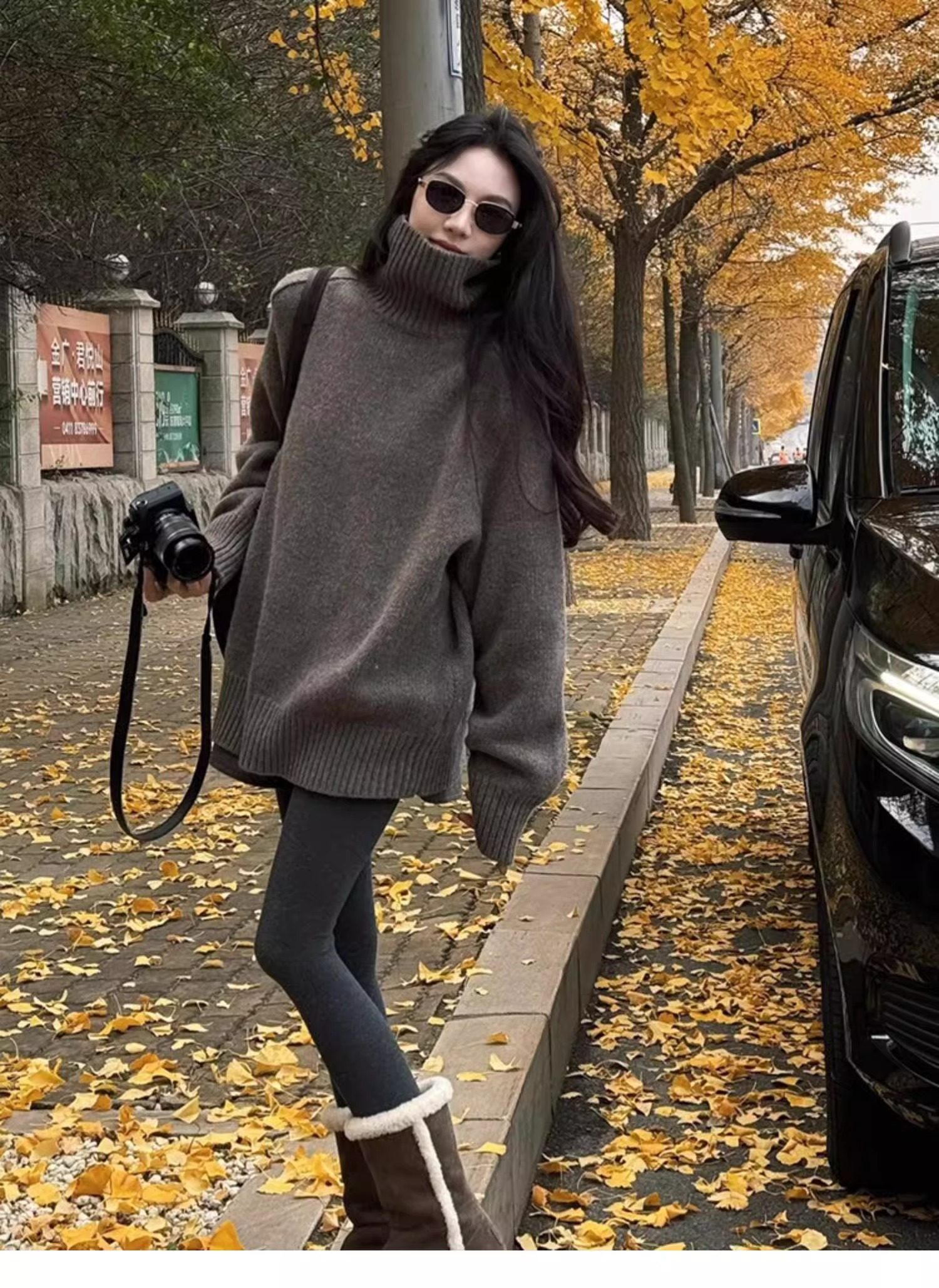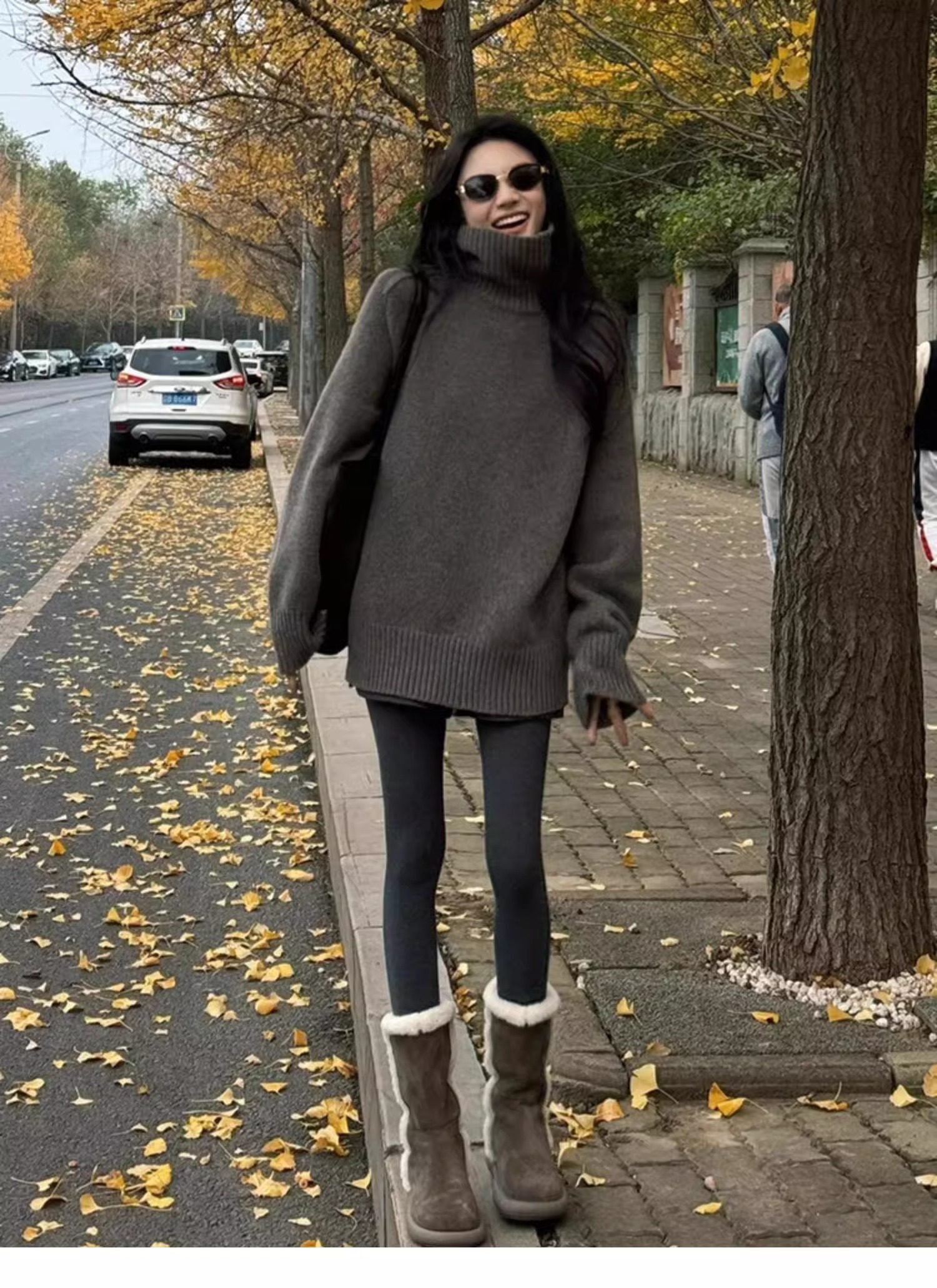 冬季高領套頭毛衣女秋冬加厚外穿慵懶風寬松中長款遮屁股針織上衣