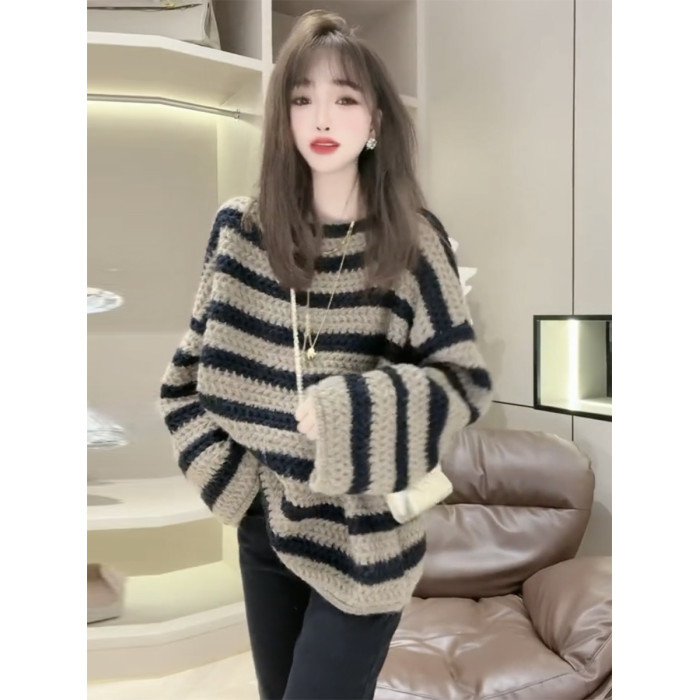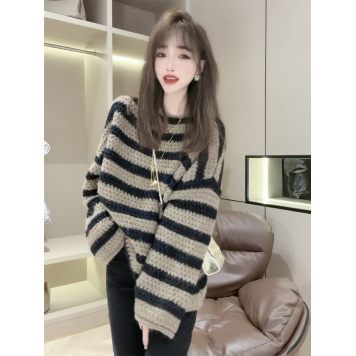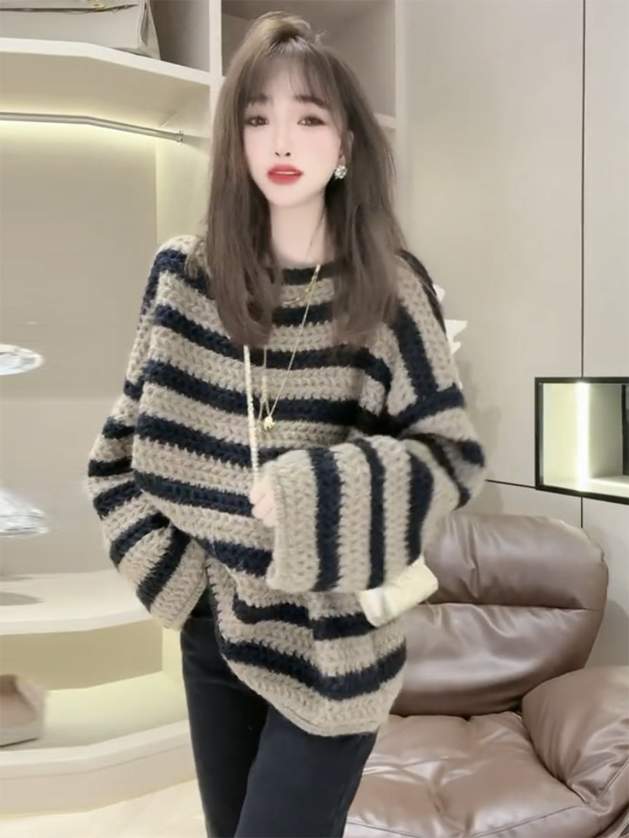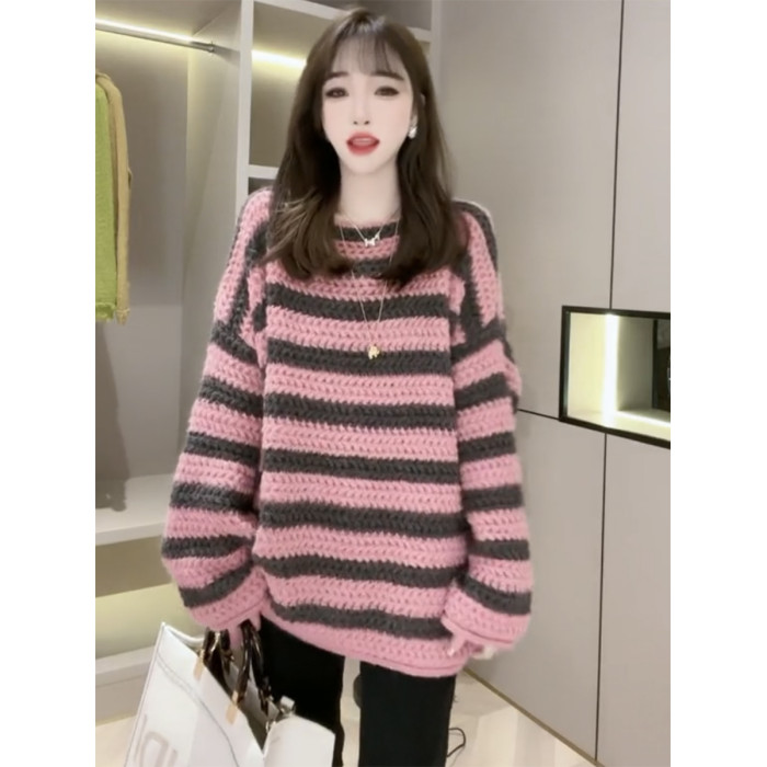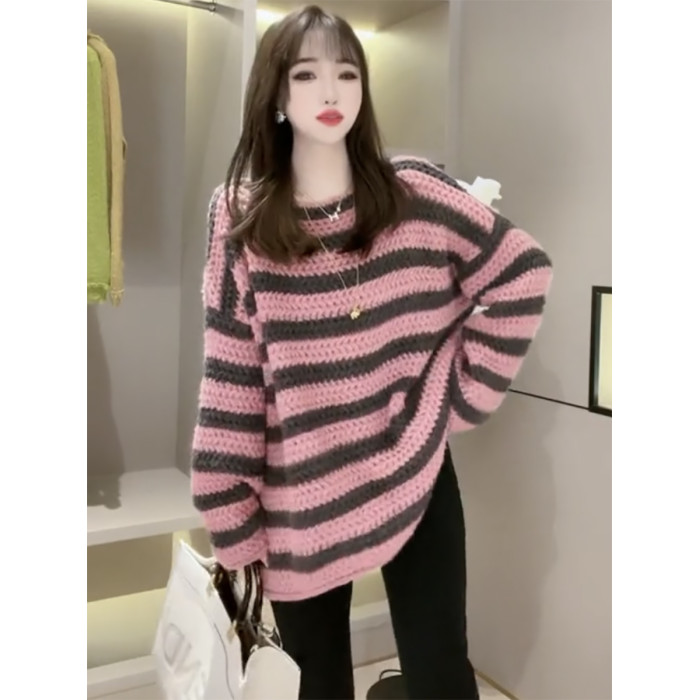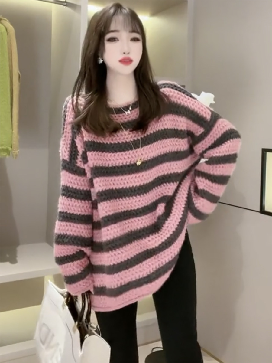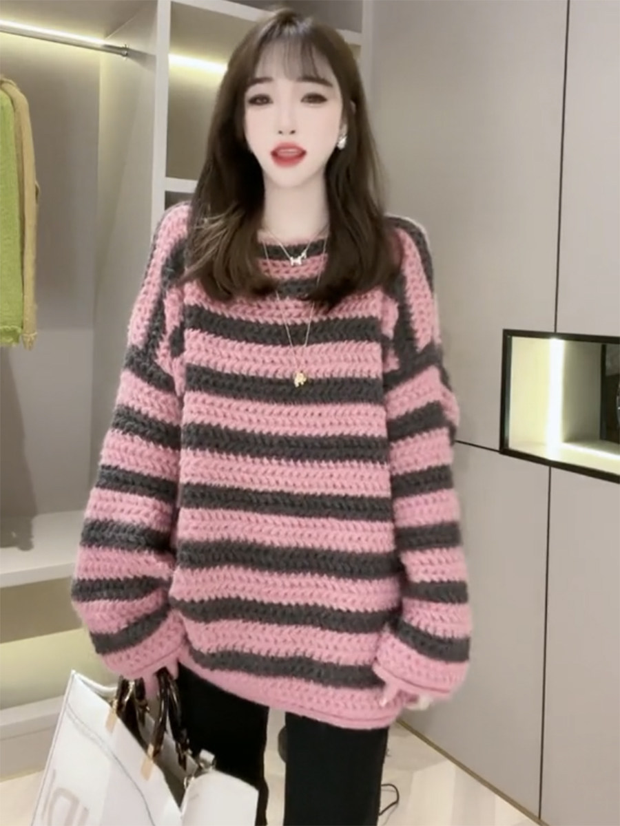 歐貨慵懶風一字領粉色條紋毛衣女秋冬季2025年新款復古加厚針織衫