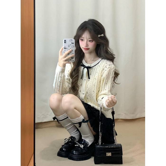 小香風蝴蝶結麻花針織開衫上衣女設計感白色甜美氣質毛衣外套秋冬