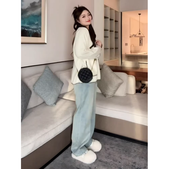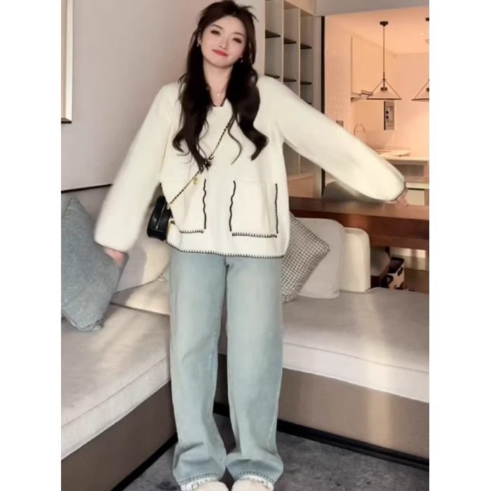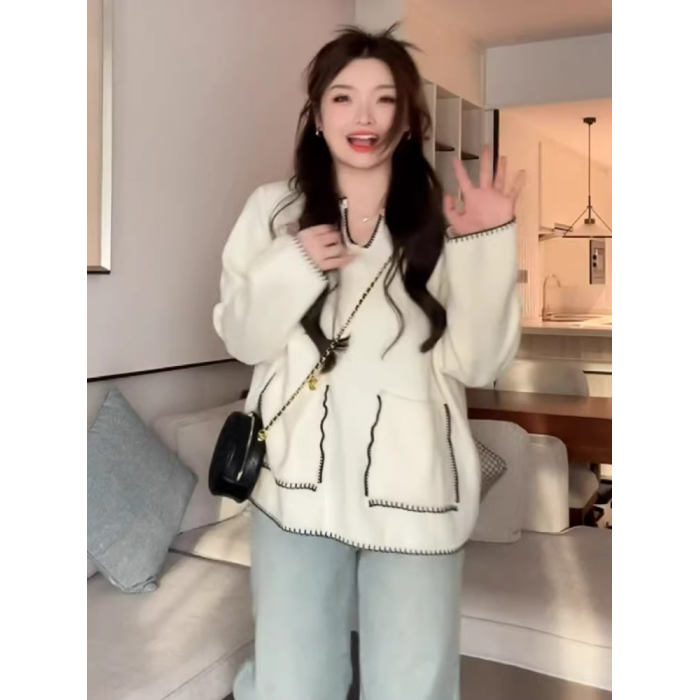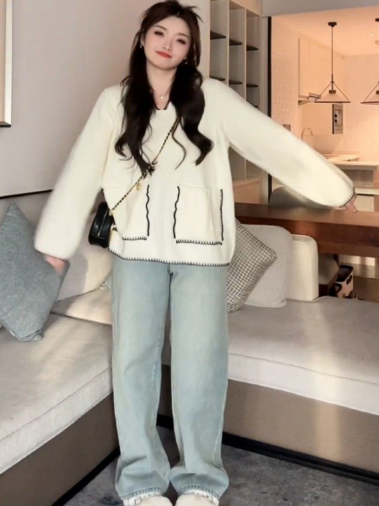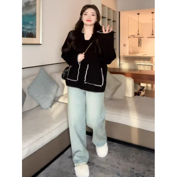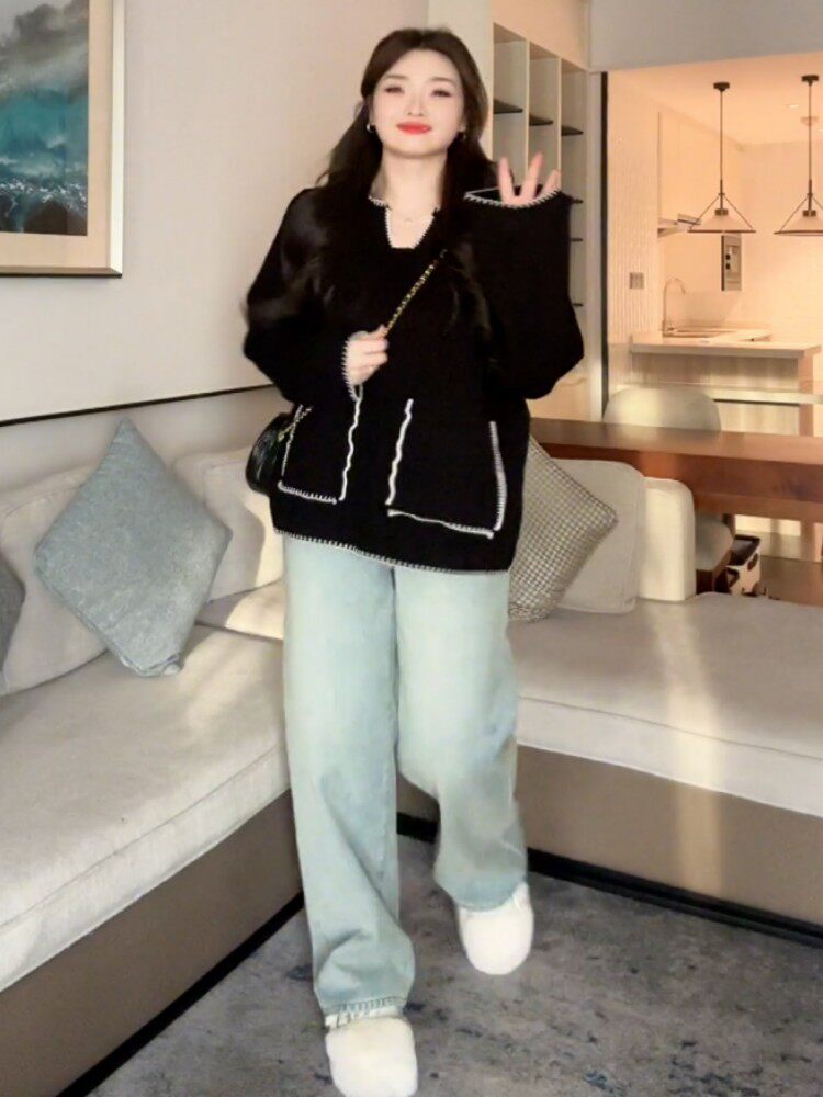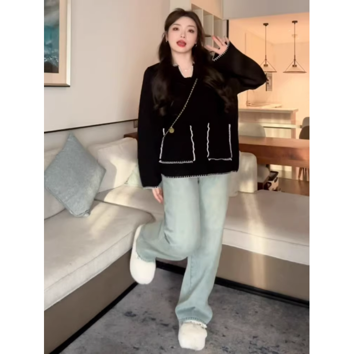 大碼慵懶風v領寬松內搭針織衫毛衣秋冬胖mm顯瘦小香風外套上衣女