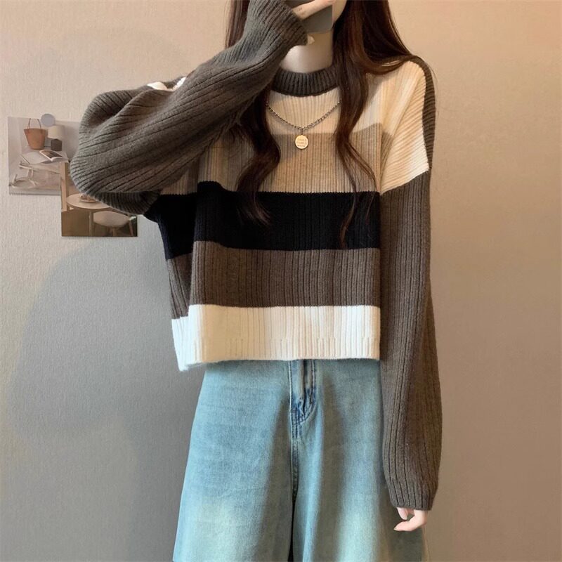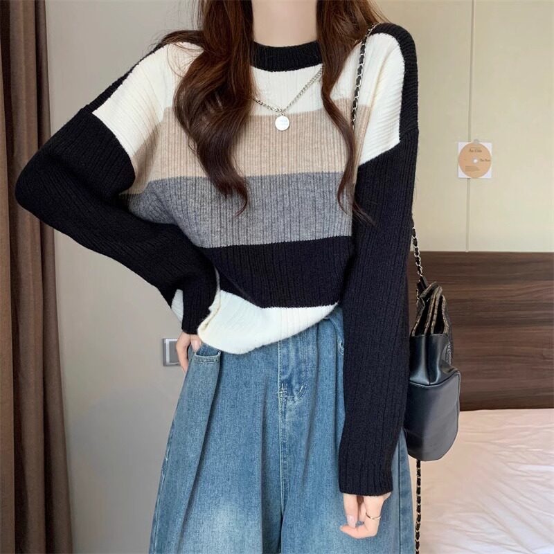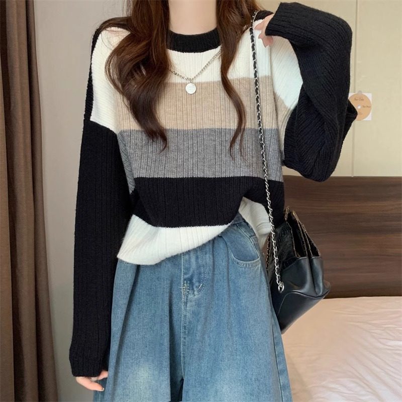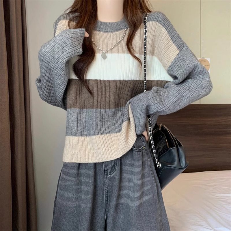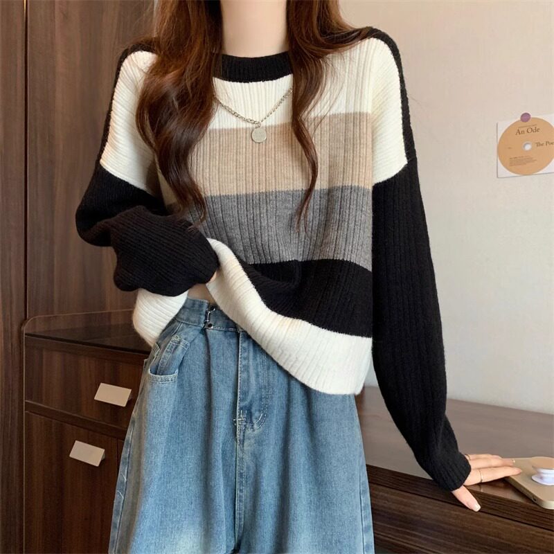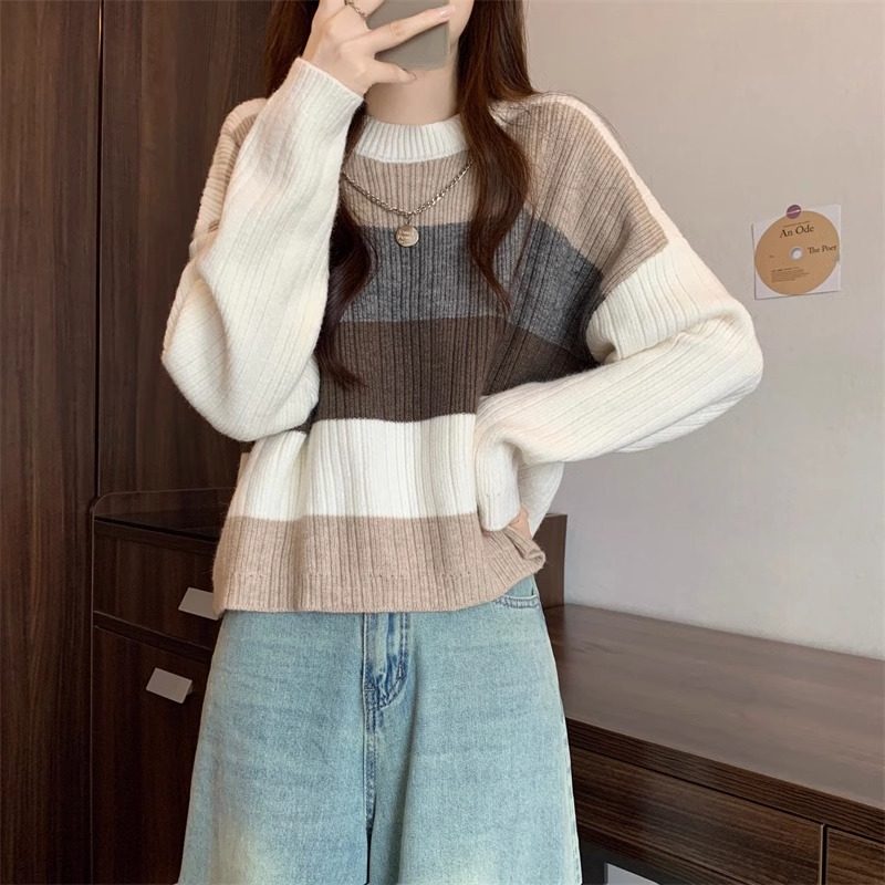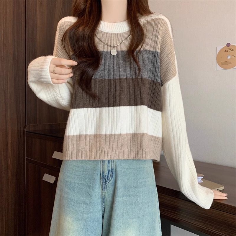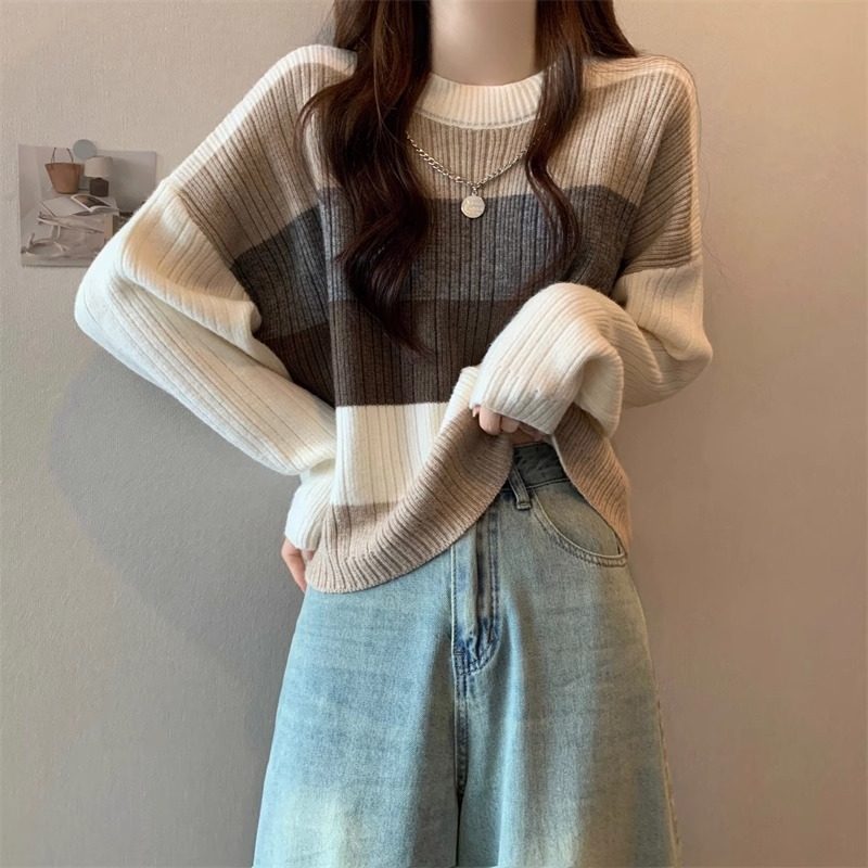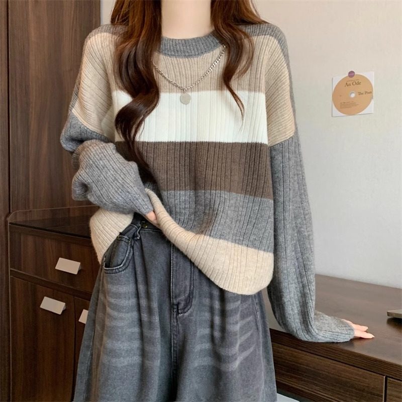 品質韓版軟糯綿羊絨條紋針織衫春秋毛衣女新款寬松圓領打底衫上衣