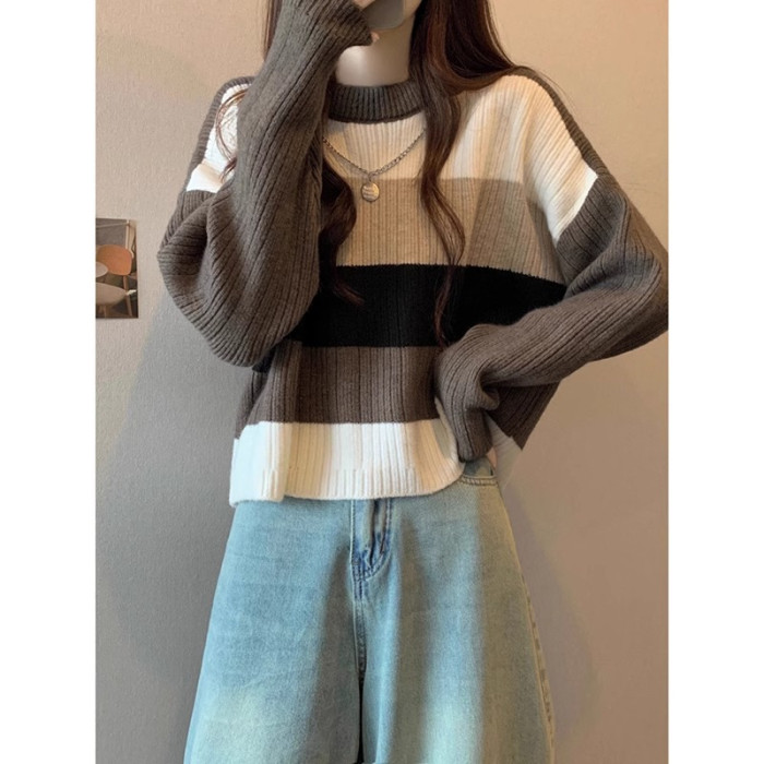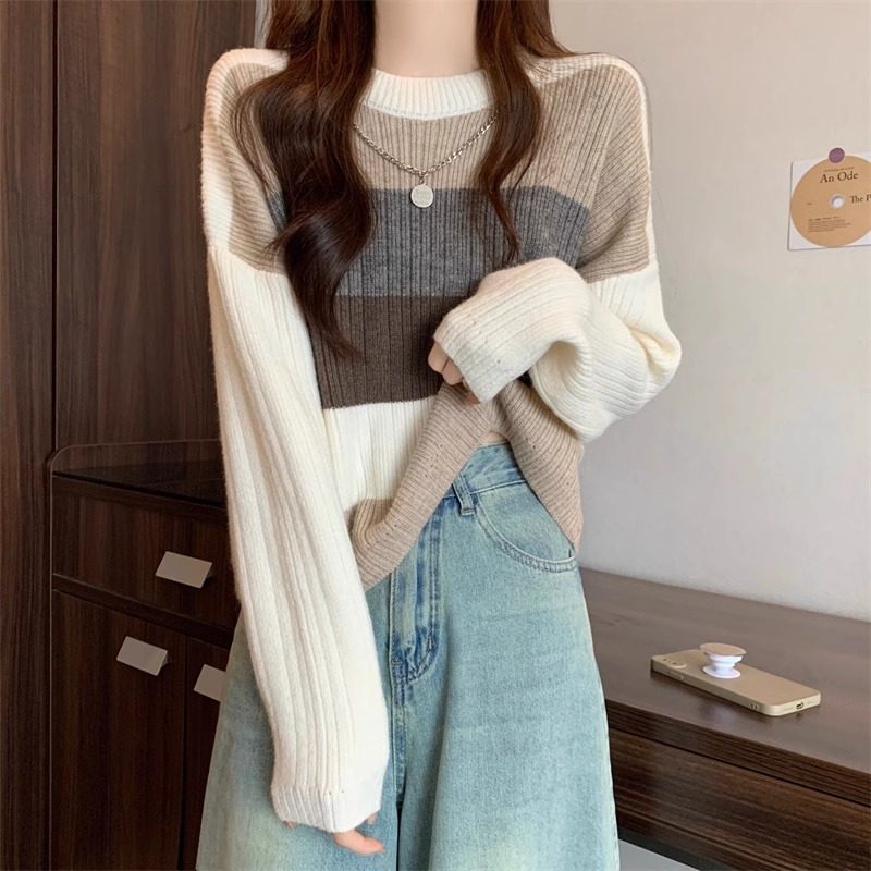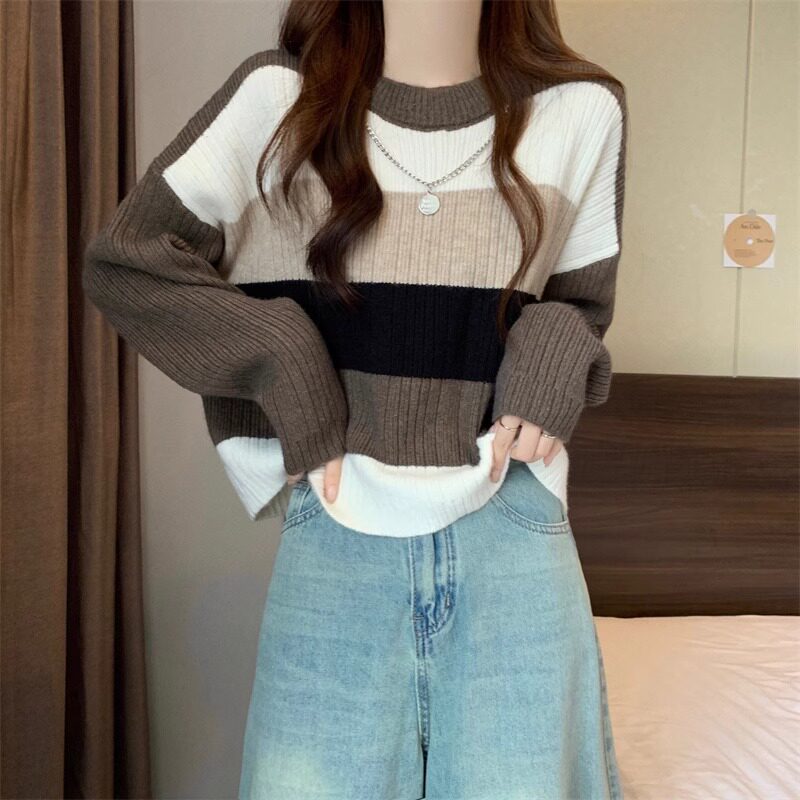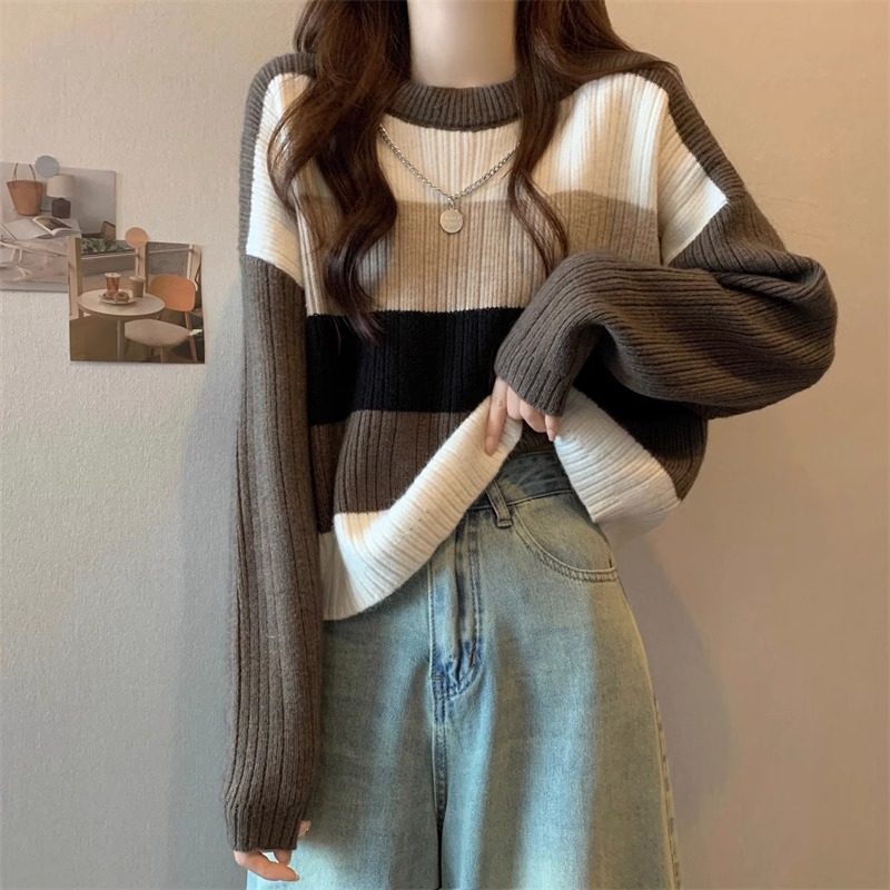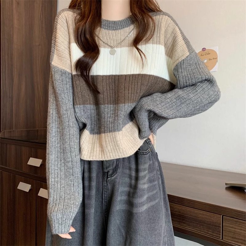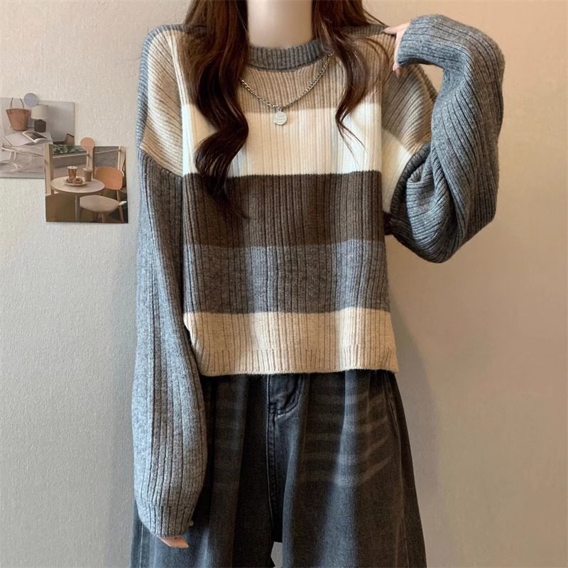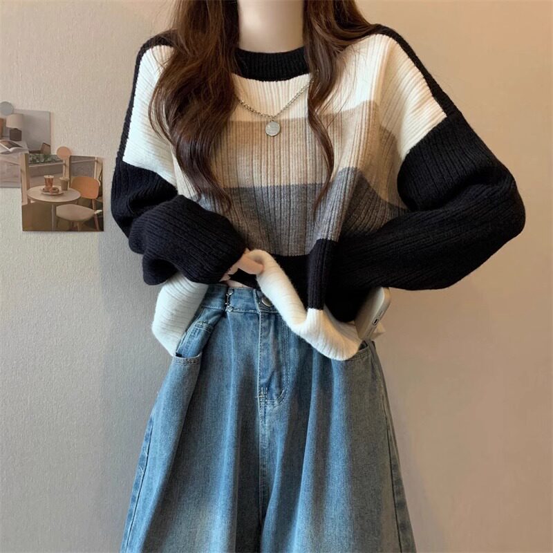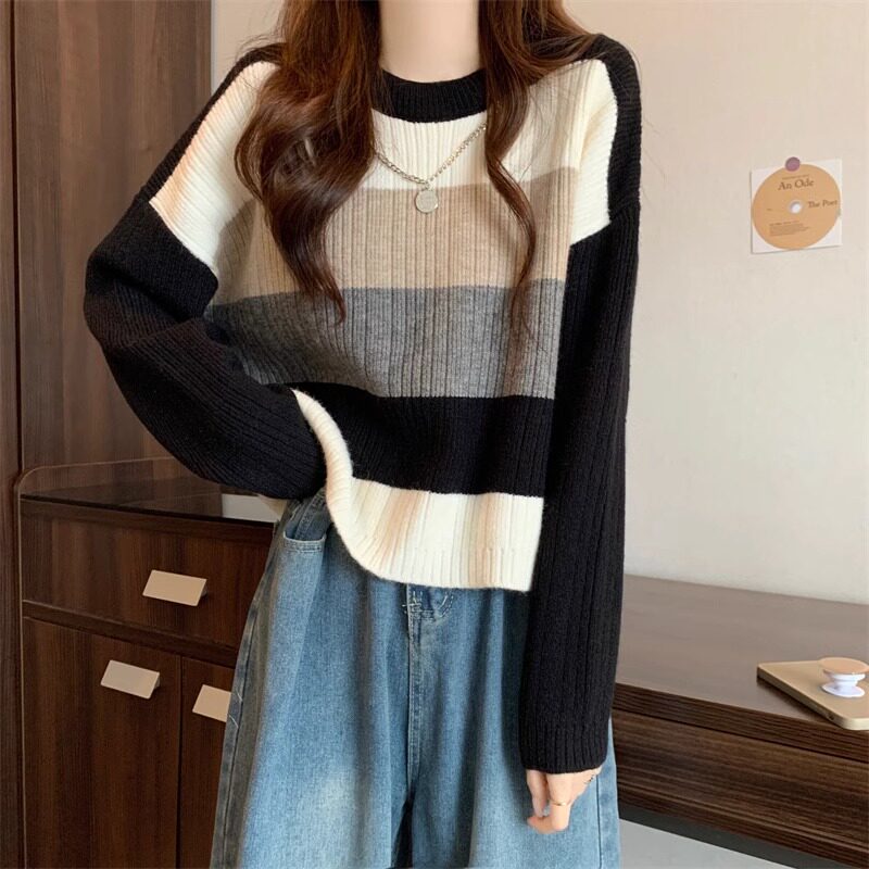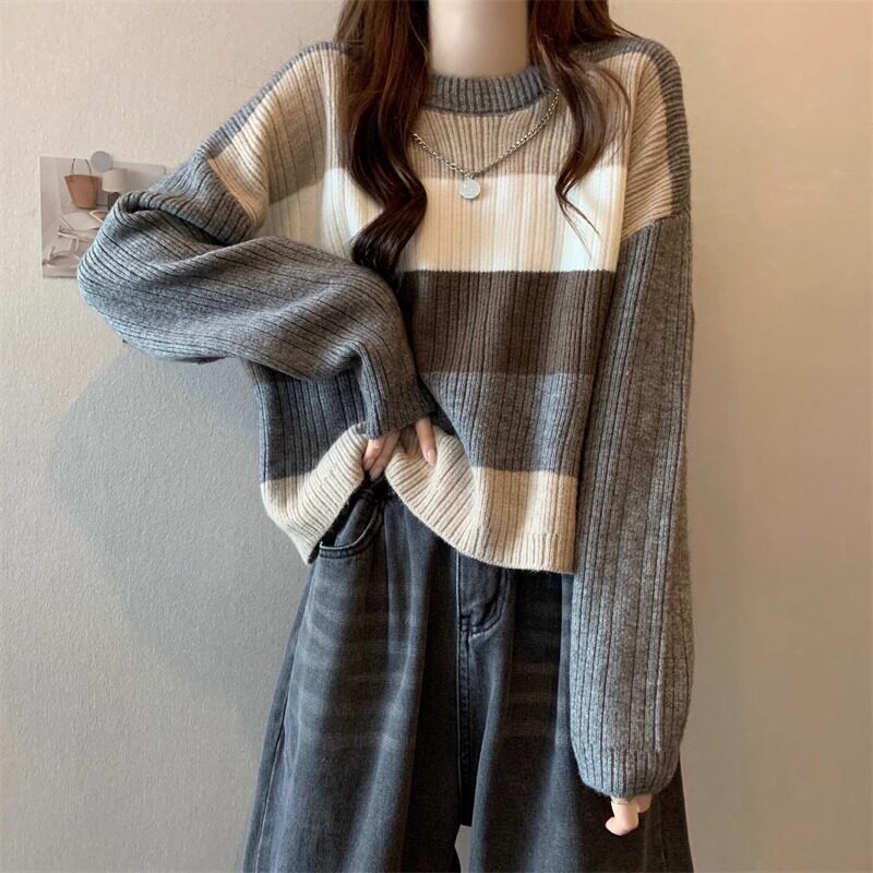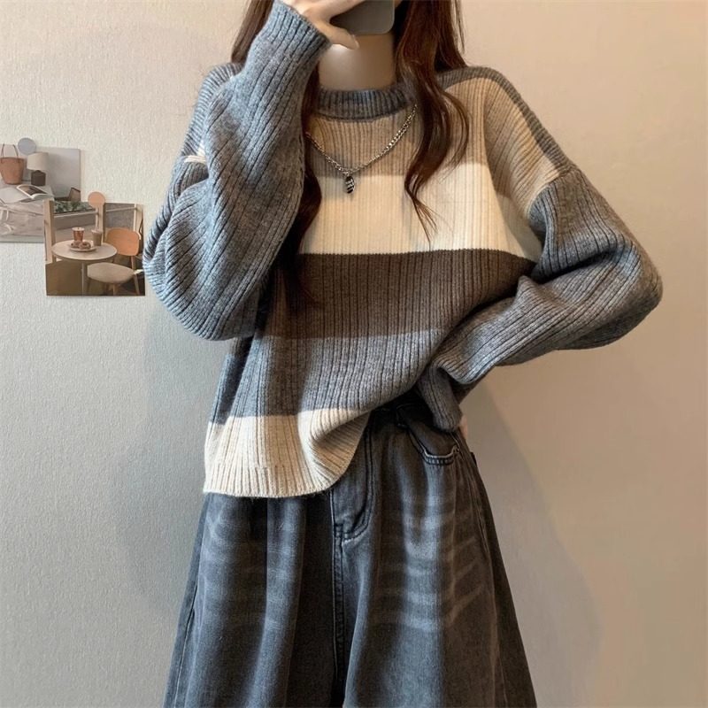 品質韓版軟糯綿羊絨條紋針織衫春秋毛衣女新款寬松圓領打底衫上衣