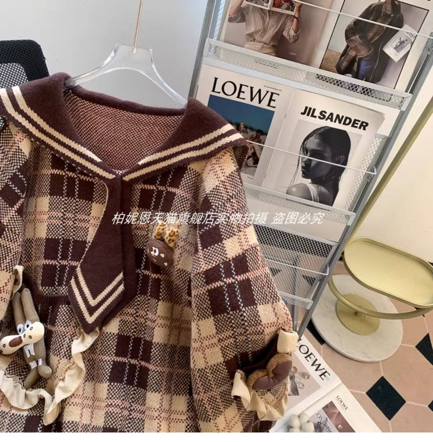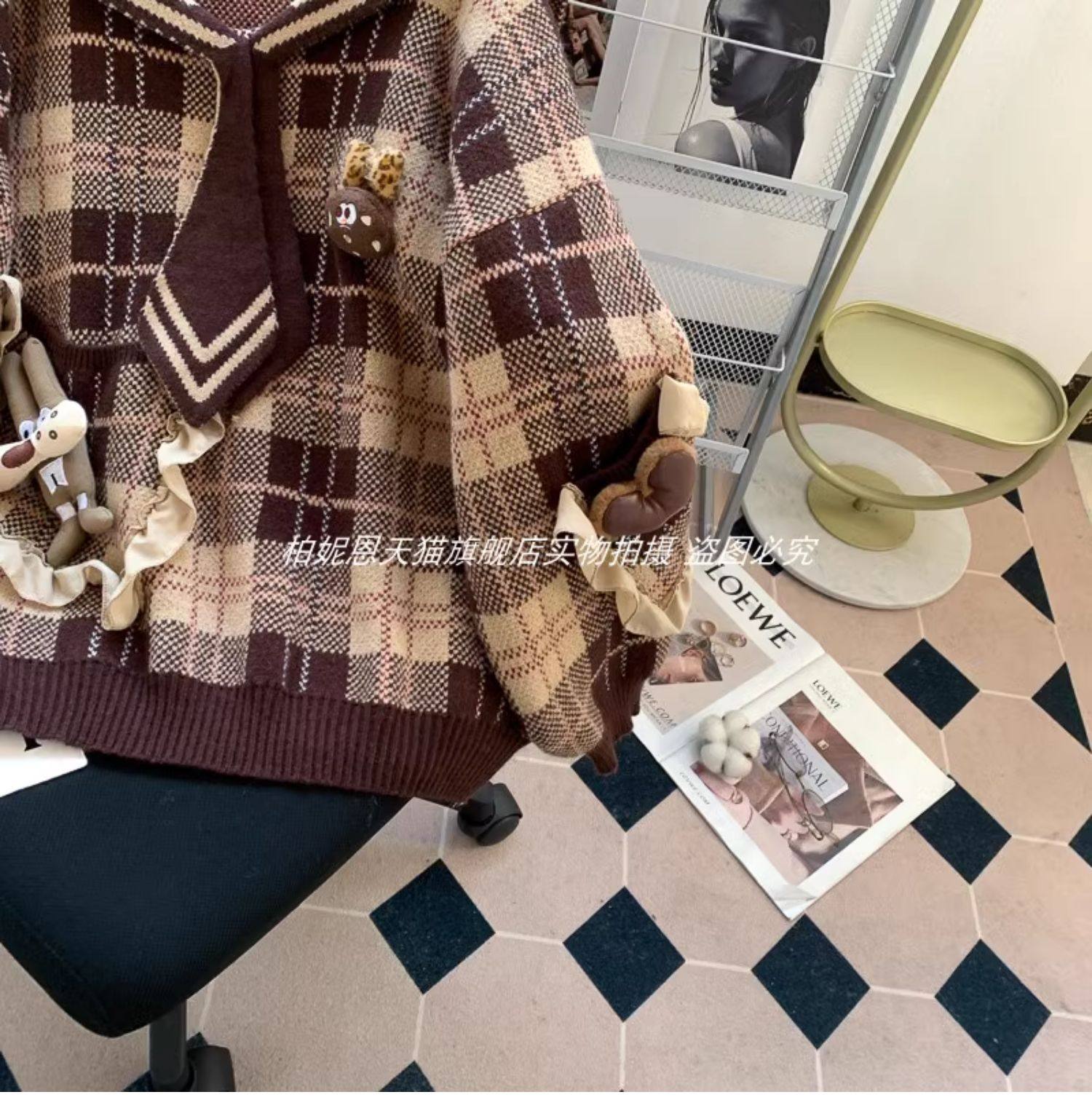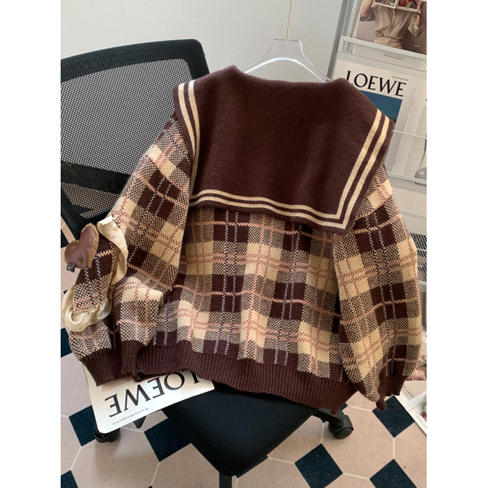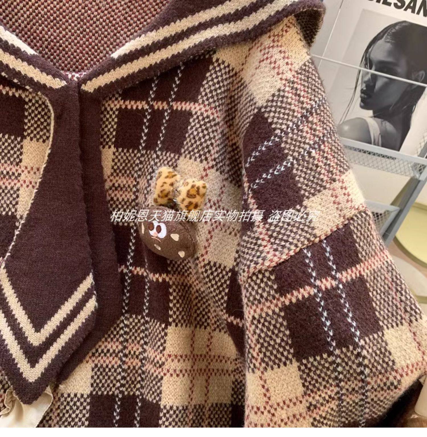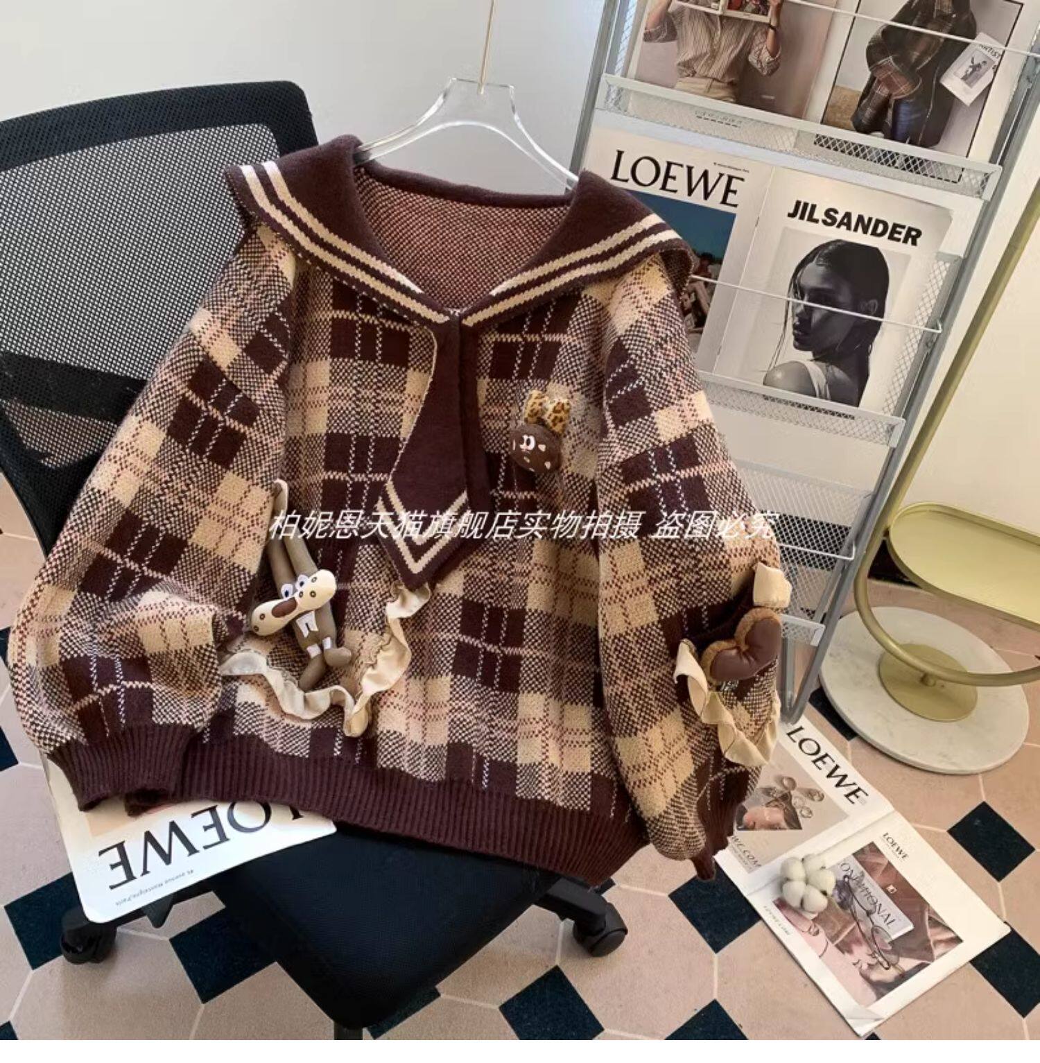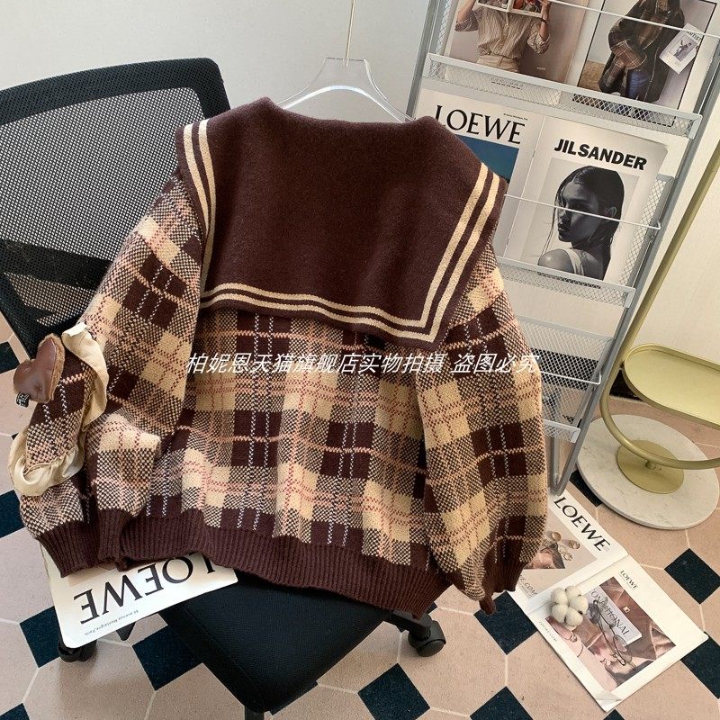 超好看海軍領復古格子美拉德可愛毛衣女秋冬穿搭寬松慵懶風針織衫