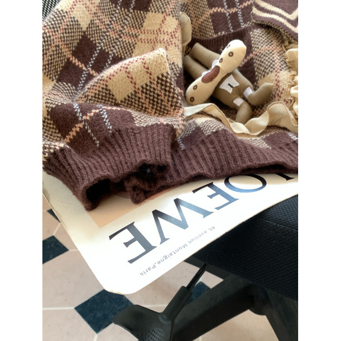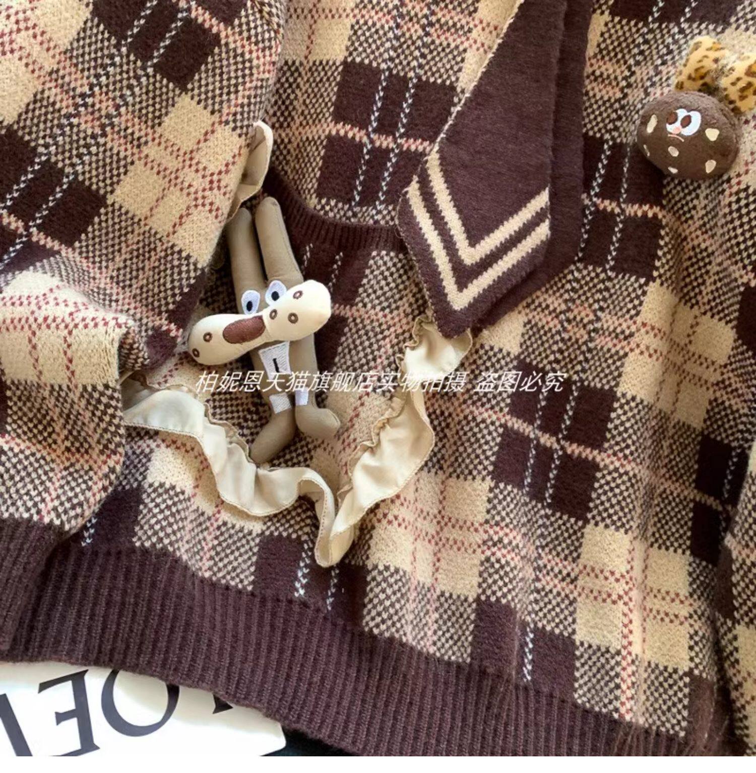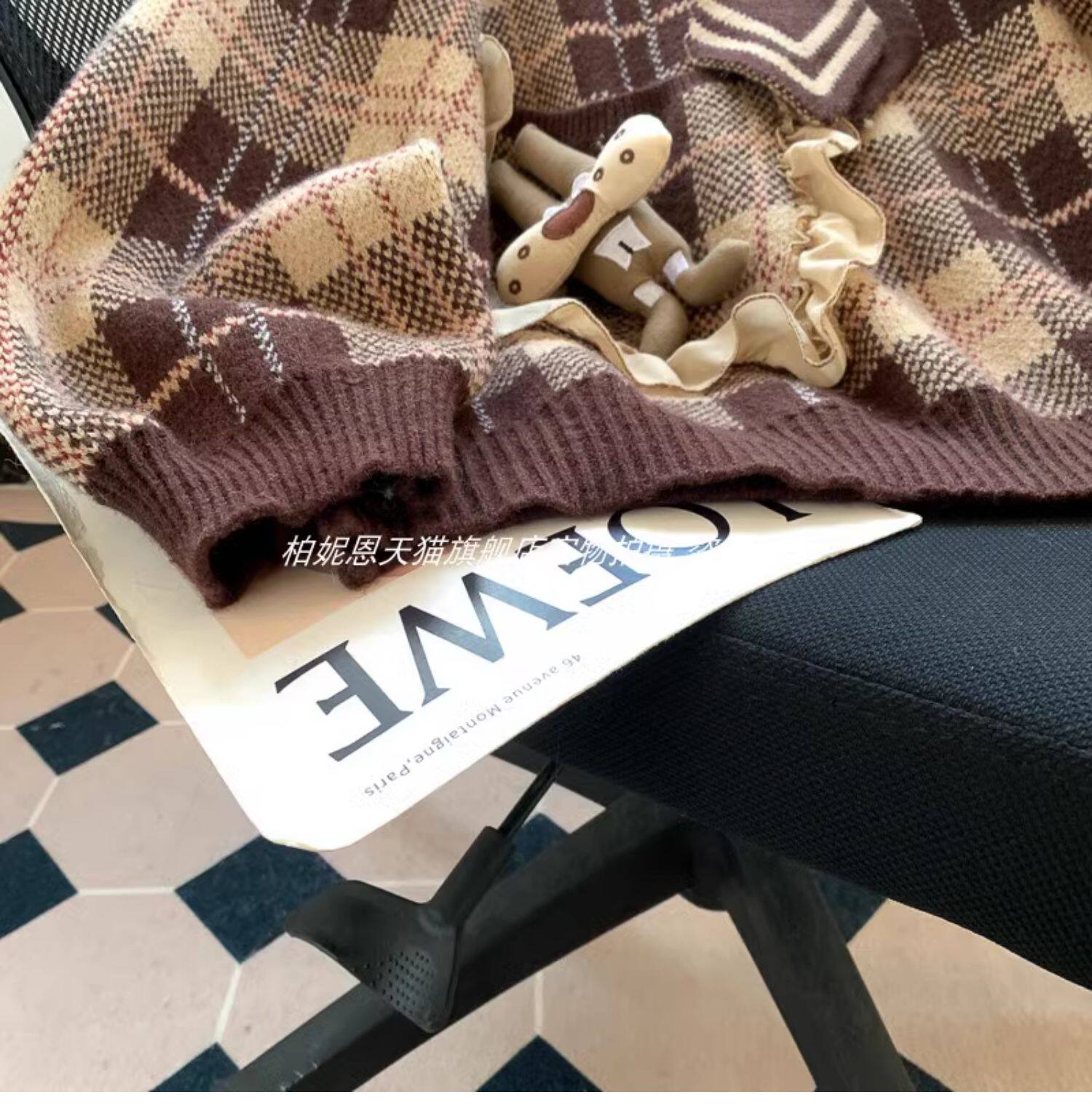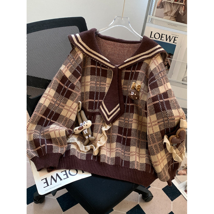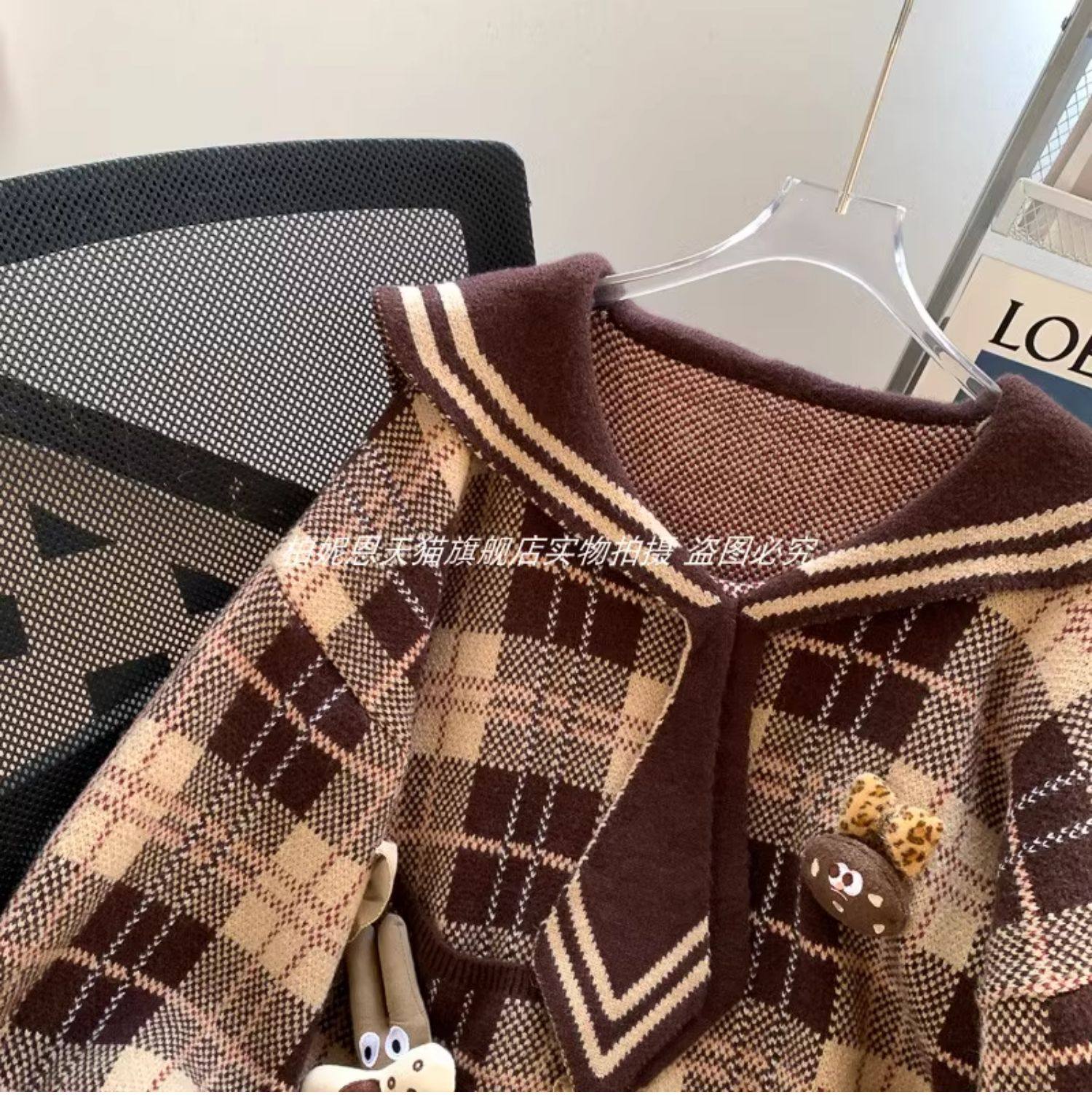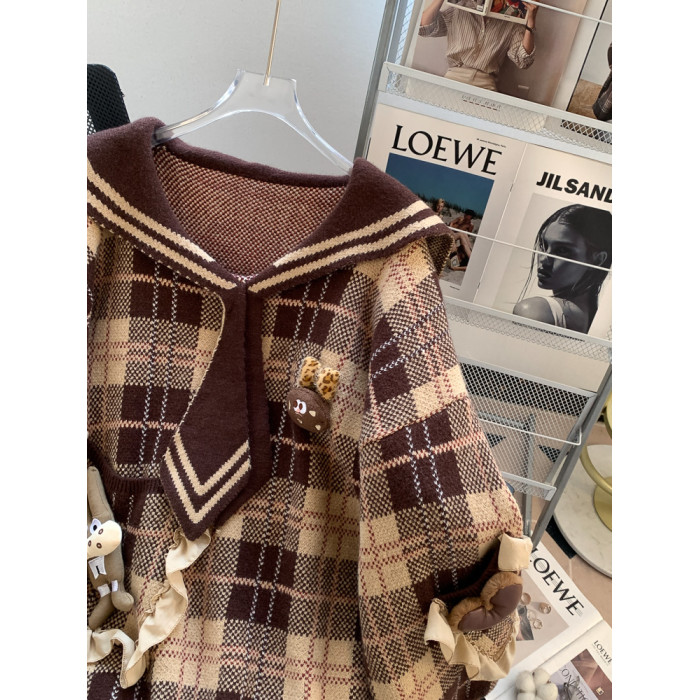 超好看海軍領復古格子美拉德可愛毛衣女秋冬穿搭寬松慵懶風針織衫