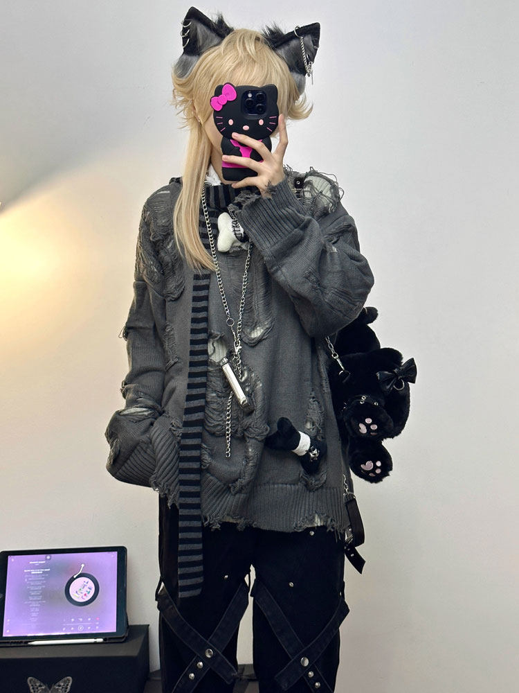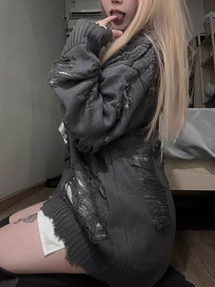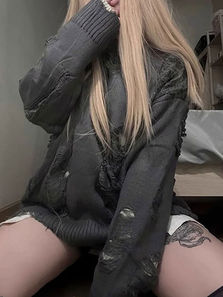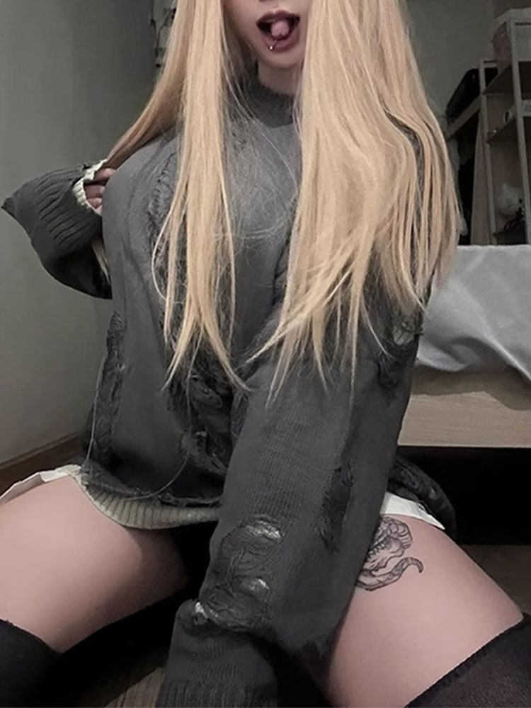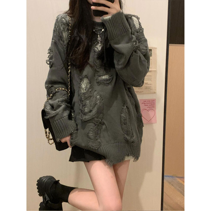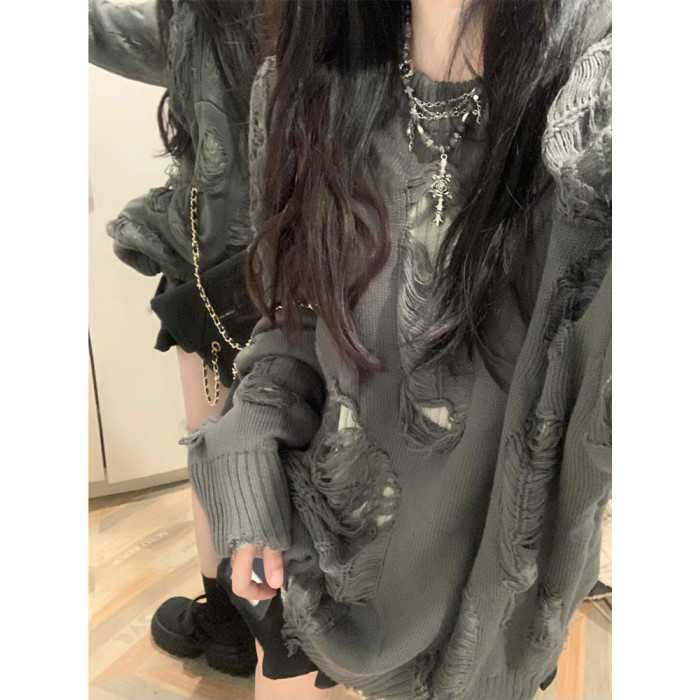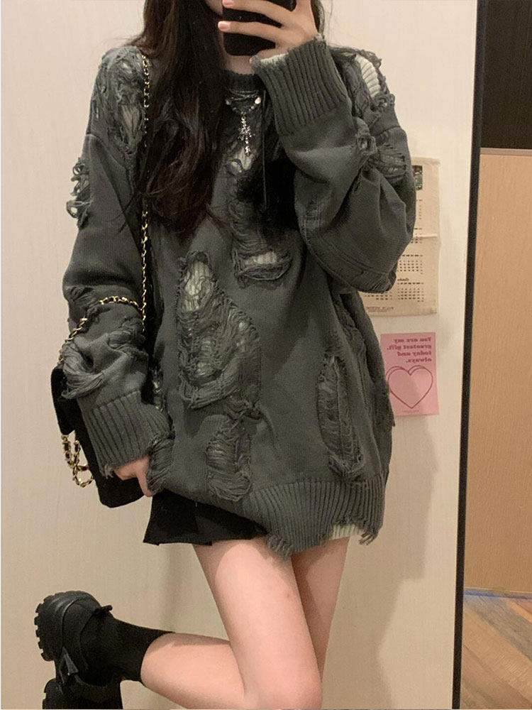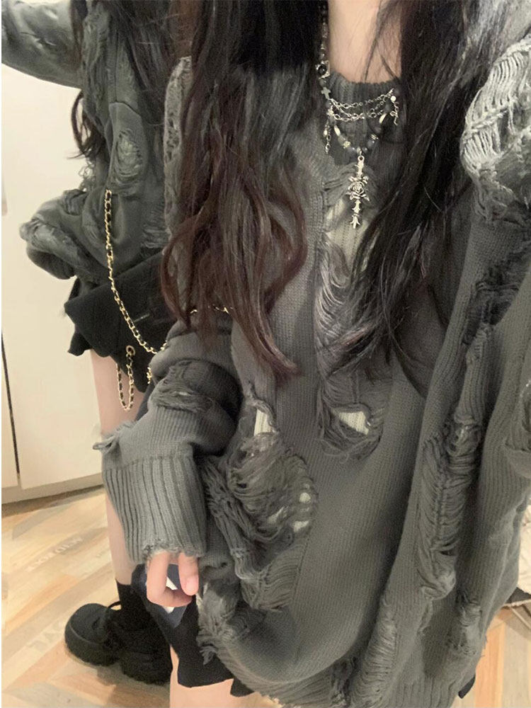 大碼y2k灰色破洞毛衣外套女假兩件秋冬設計感顯瘦亞文化上衣胖mm