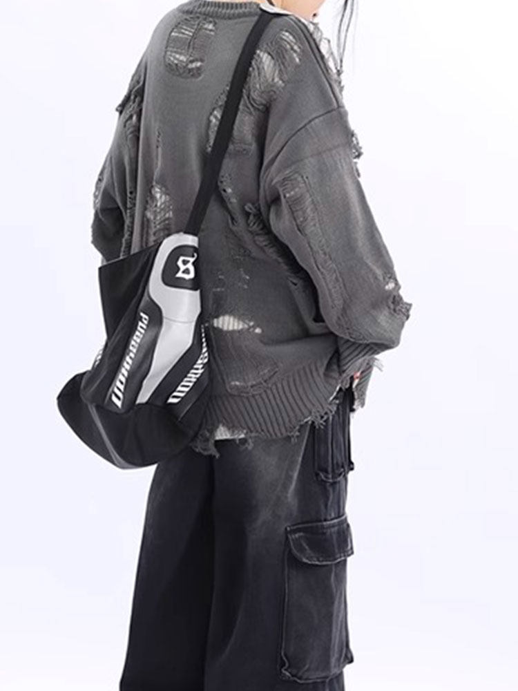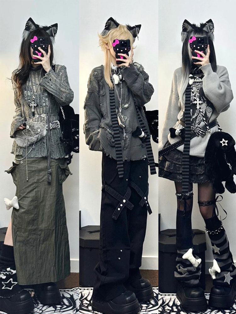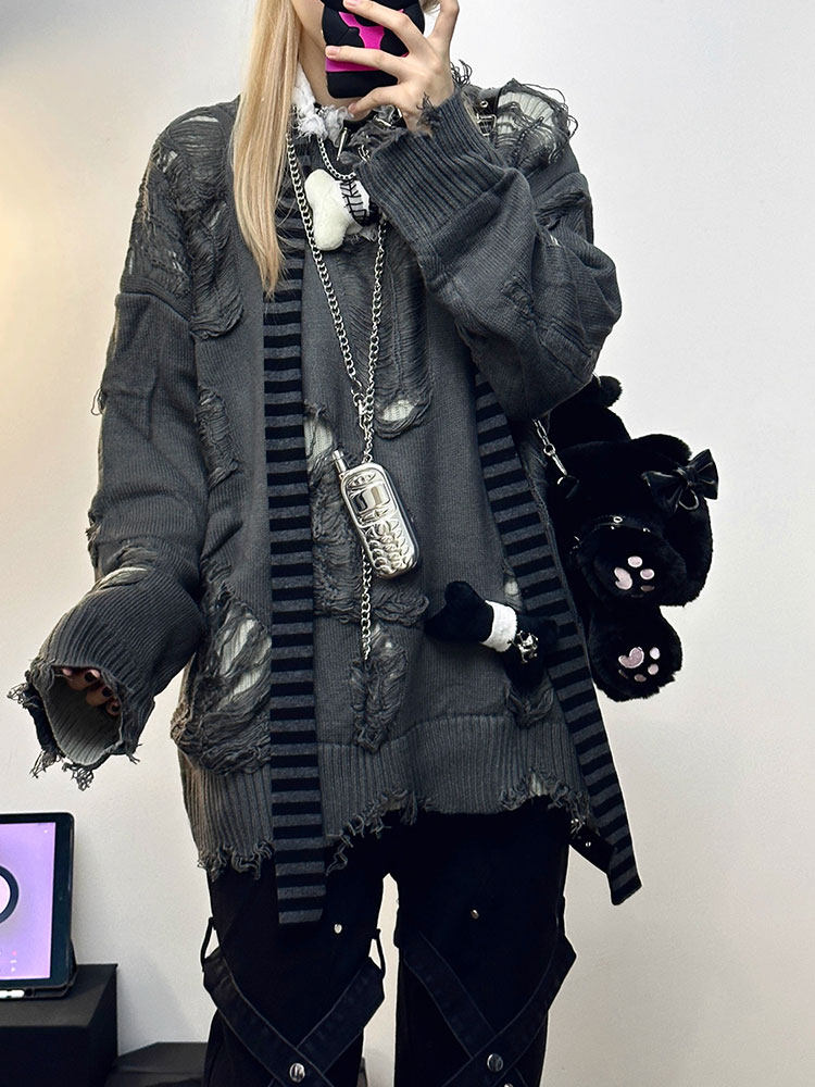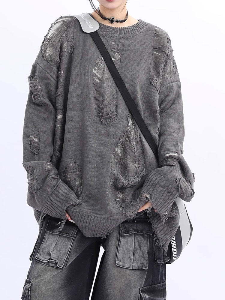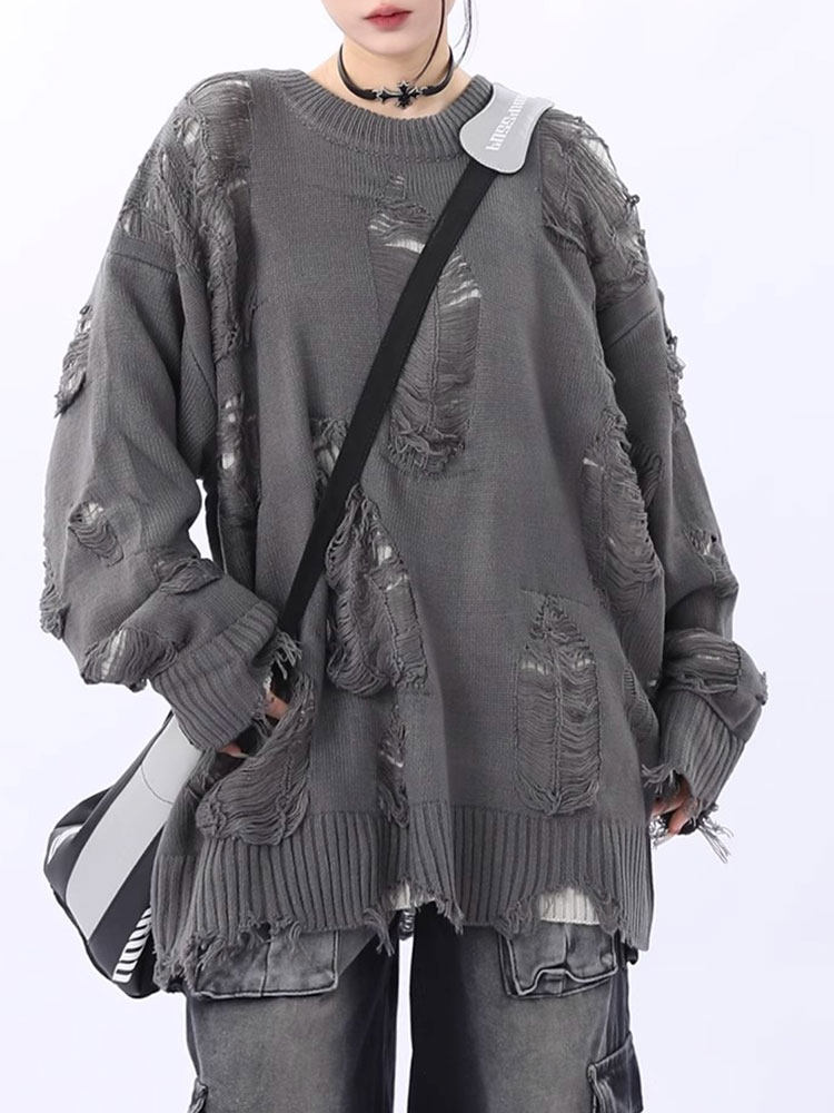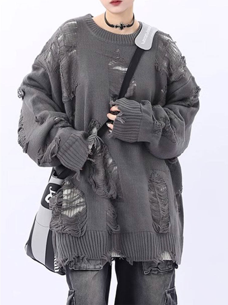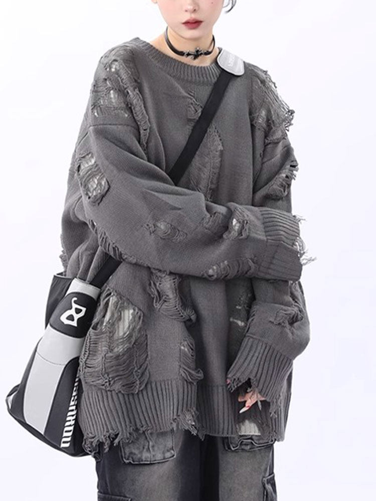 大碼y2k灰色破洞毛衣外套女假兩件秋冬設計感顯瘦亞文化上衣胖mm