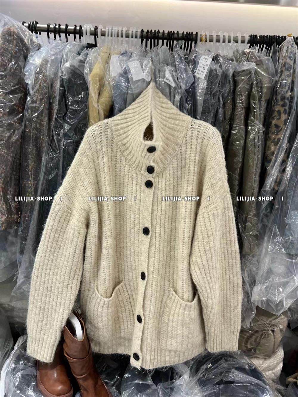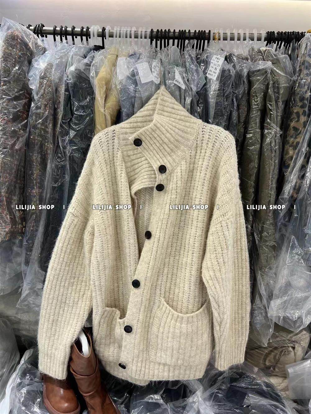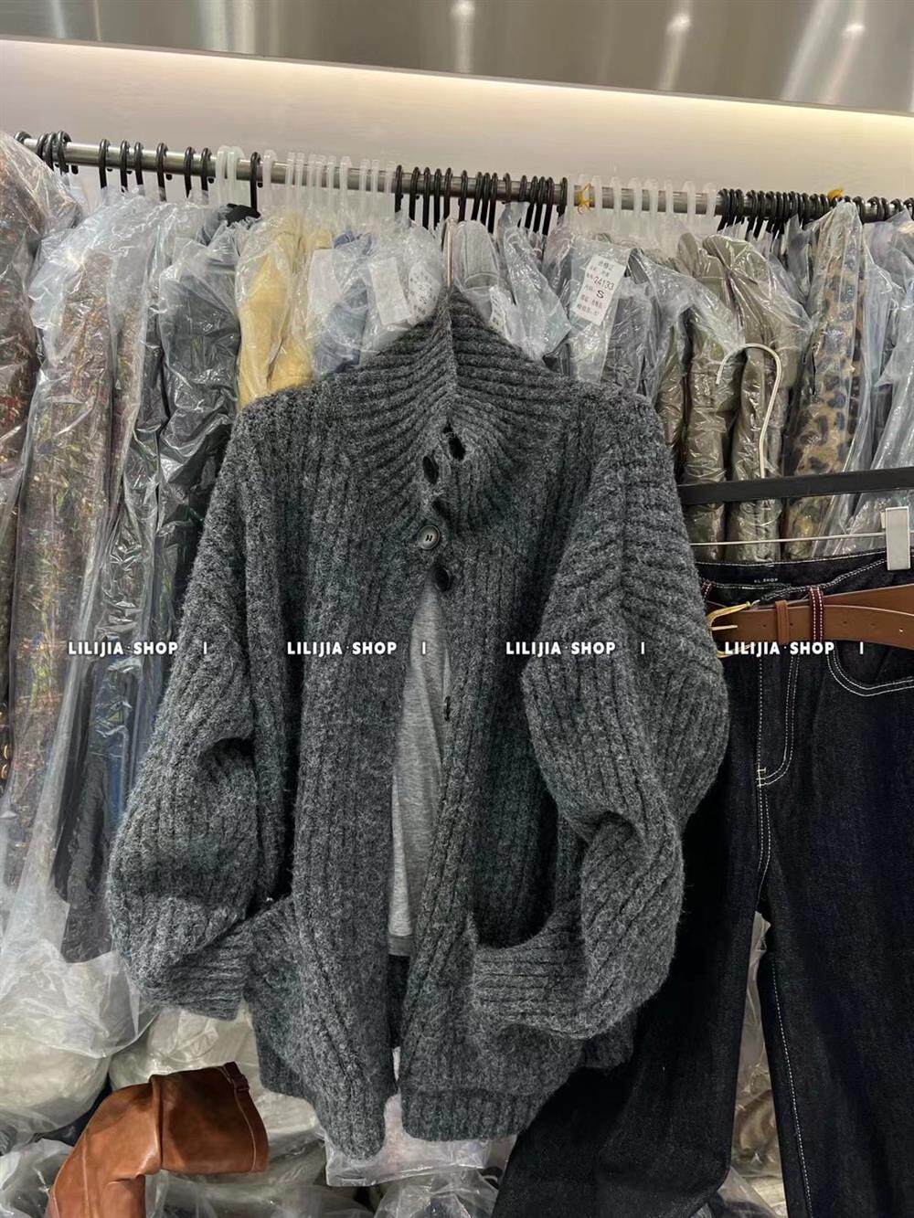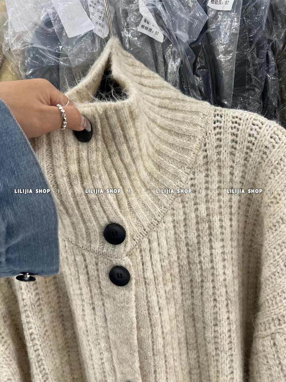 韓國東大門2025秋冬款寬松慵懶風針織開衫高級感高領加厚毛衣外套