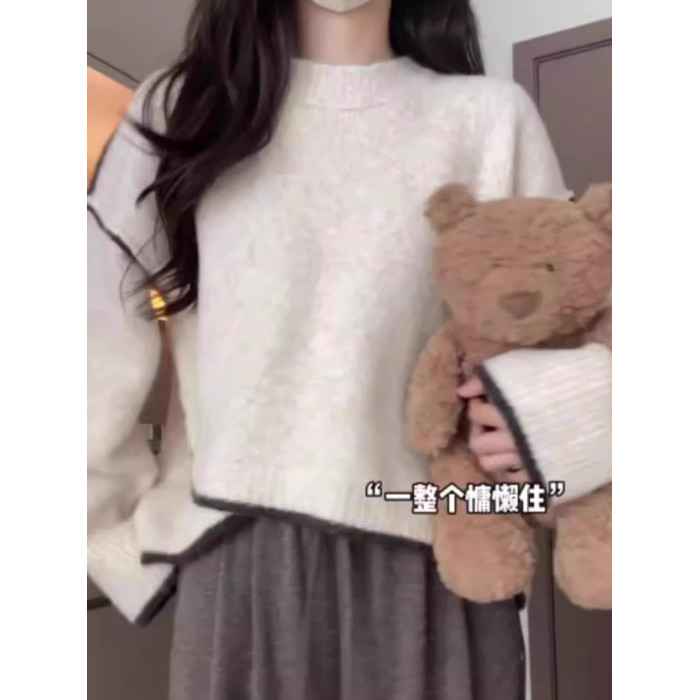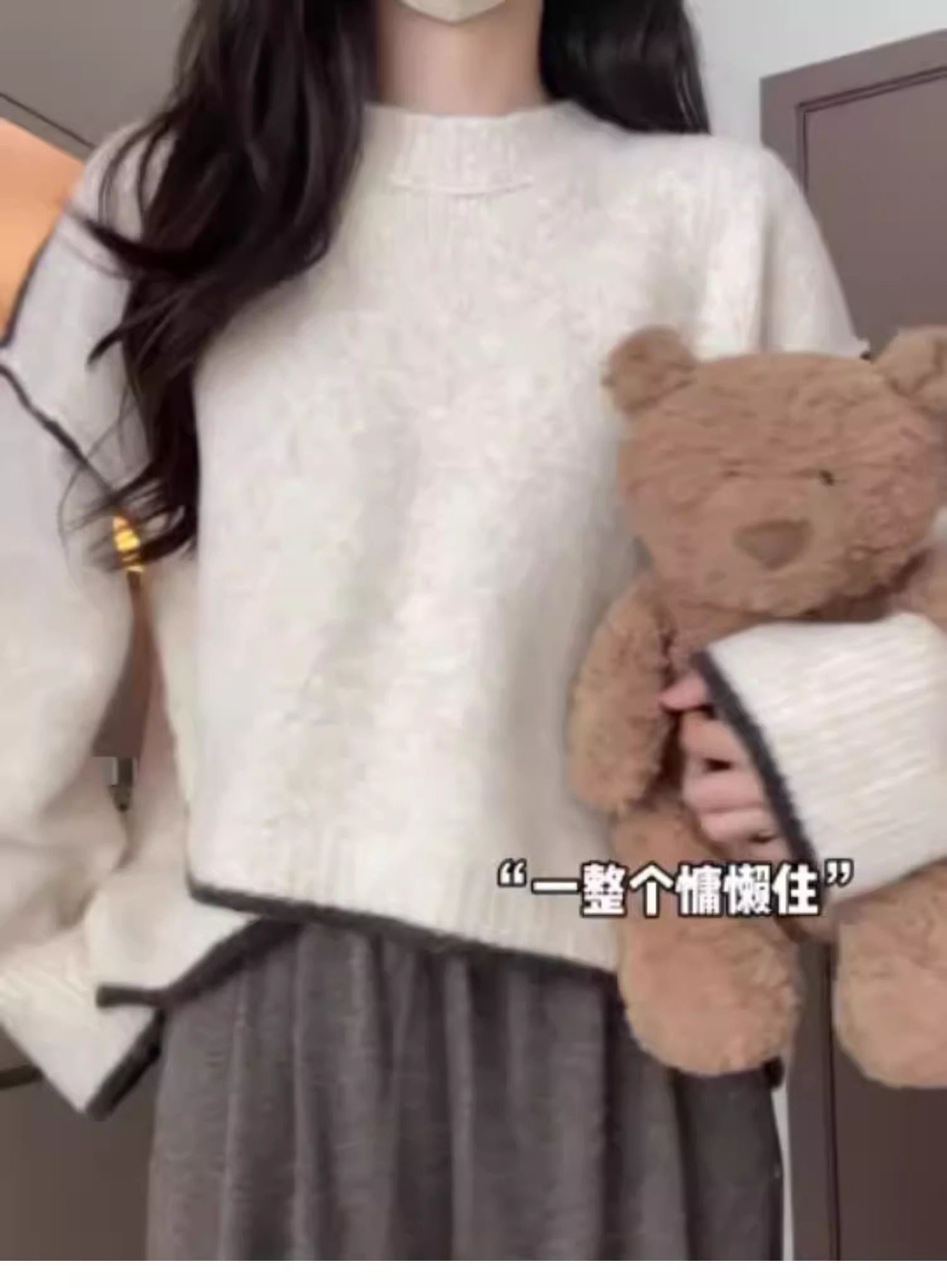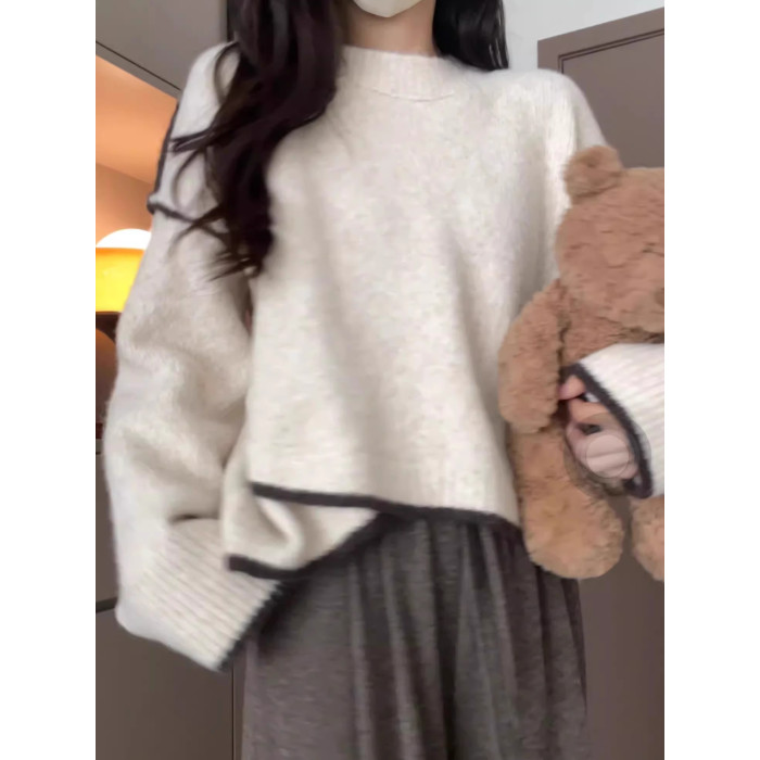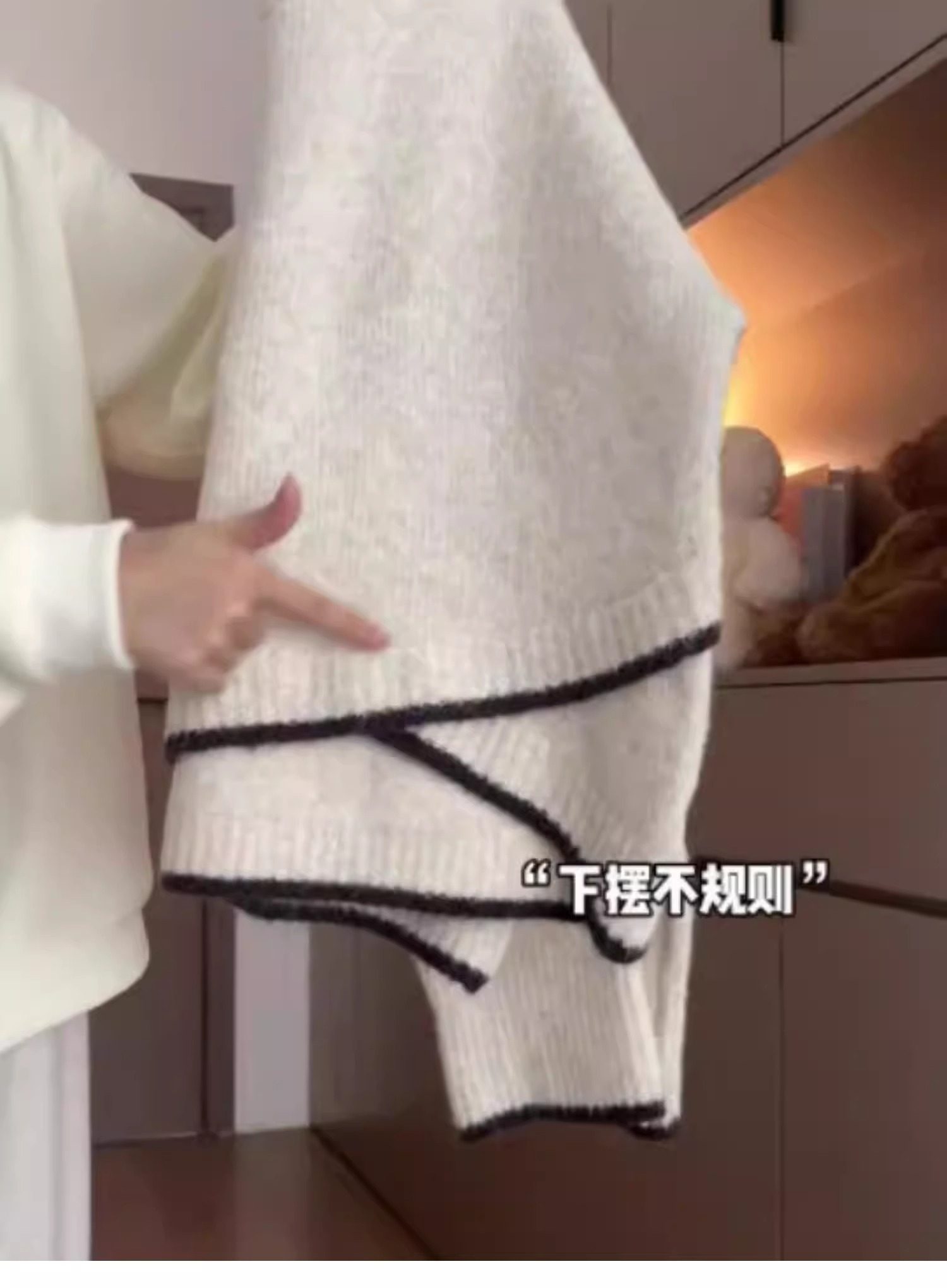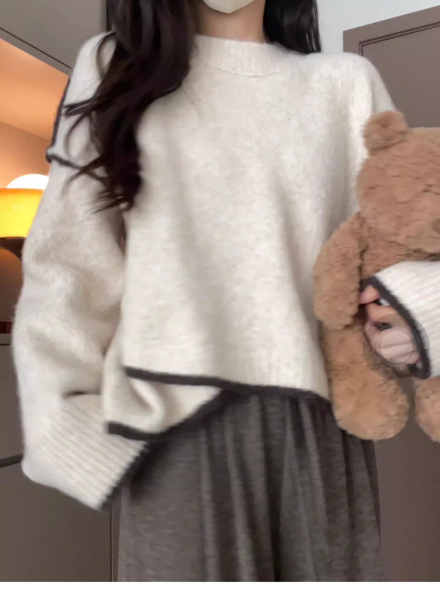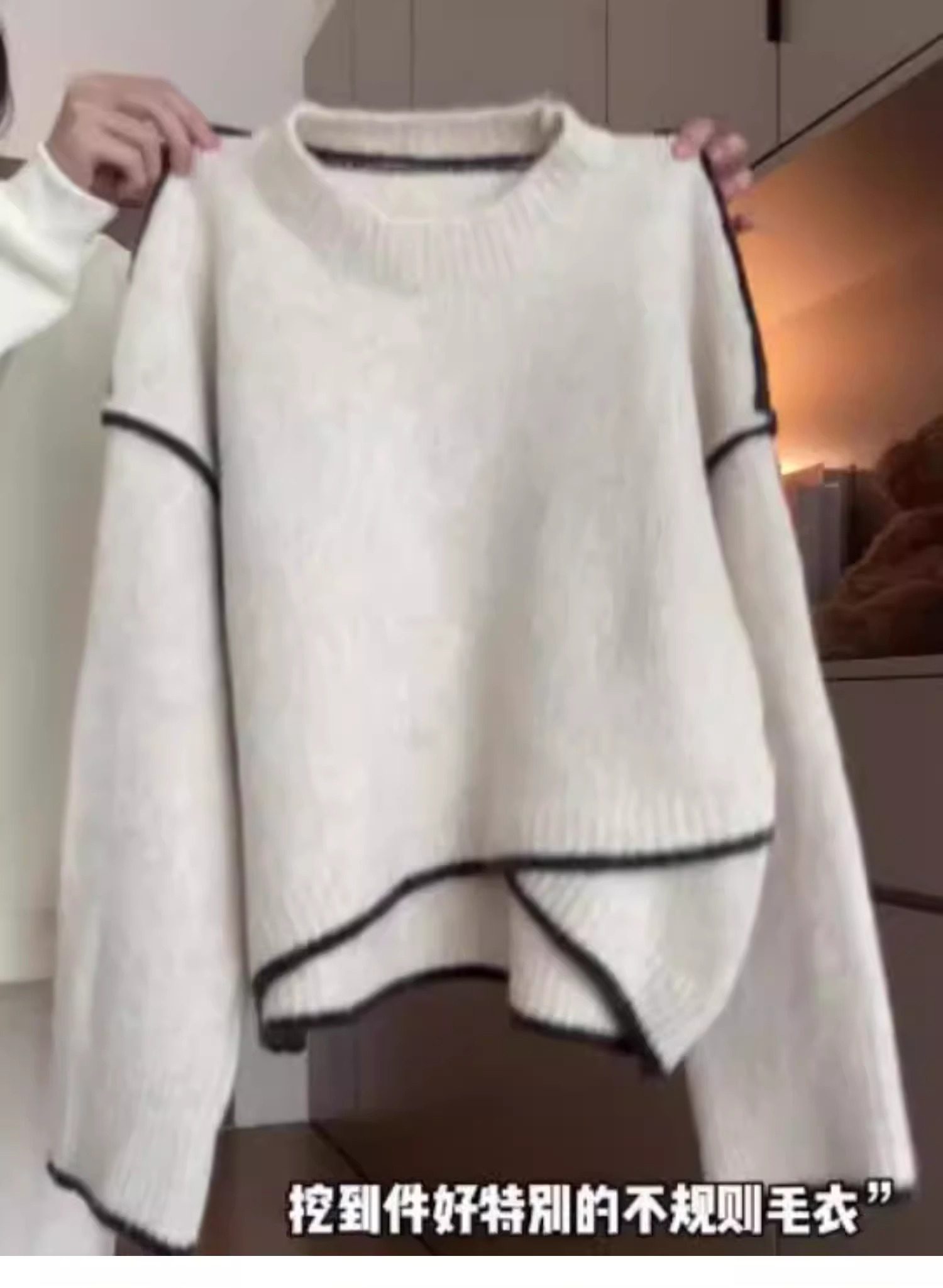 設計感不規則撞色毛衣女新款秋冬寬鬆慵嬾風軟糯高級感套頭針織衫