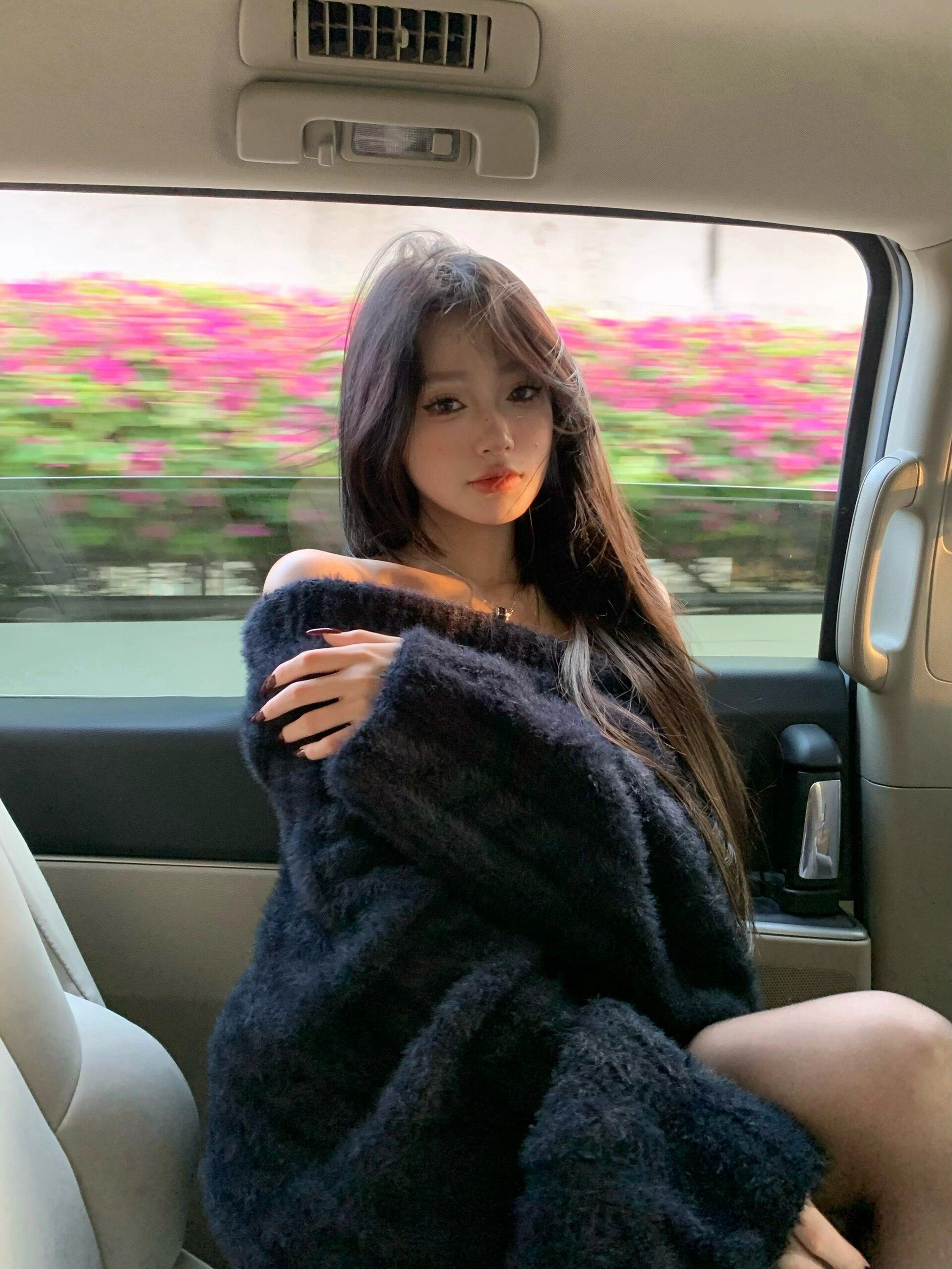 一衣多穿軟糯水貂絨一字肩氛圍感毛衣女純欲慵懶風顯瘦翻領針織衫