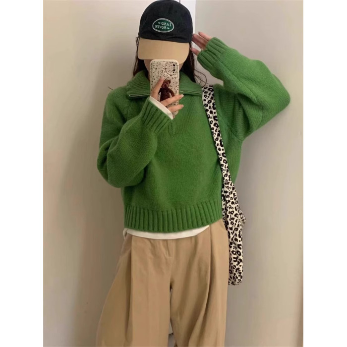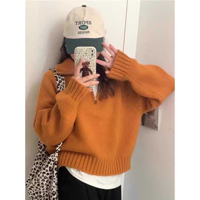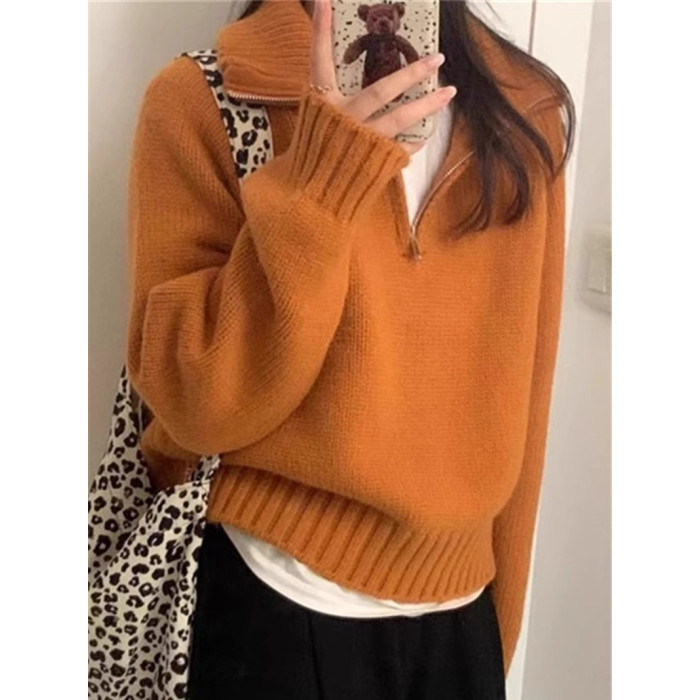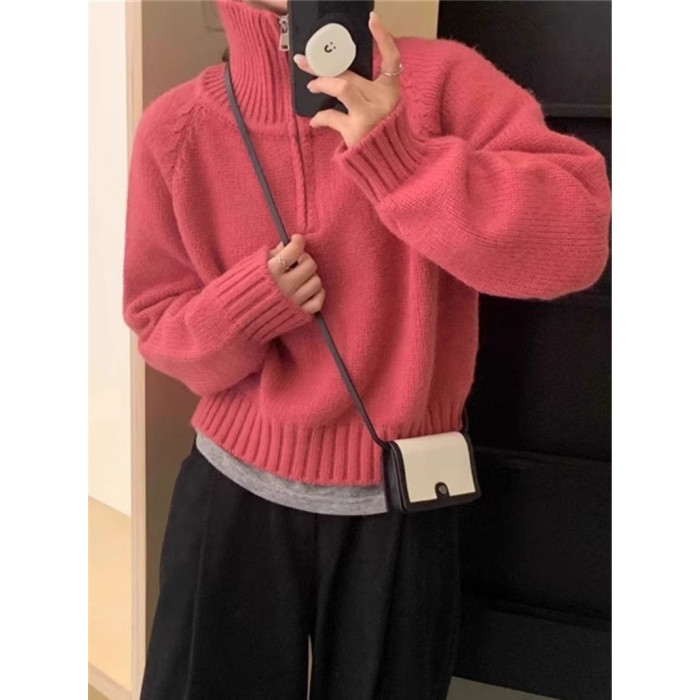 設計感半拉鍊翻領套頭毛衣女秋冬新款韓系立領寬松氣質針織衫外穿
