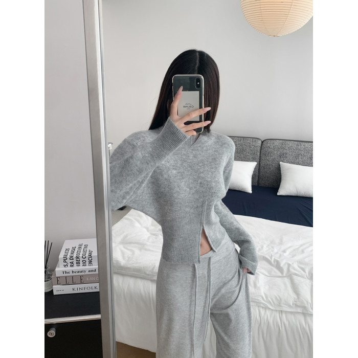 張紫一.設計感收腰下擺拉鍊顯瘦秋冬長袖毛衣圓領套頭針織衫上衣