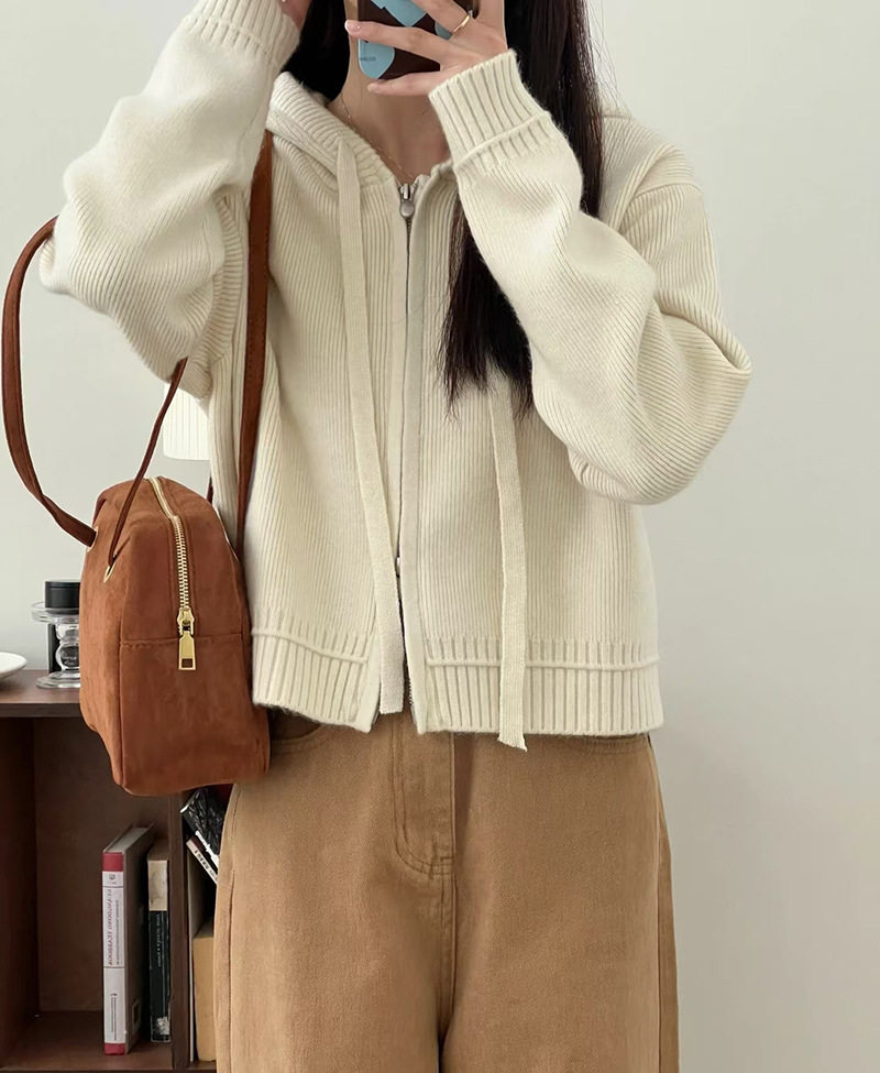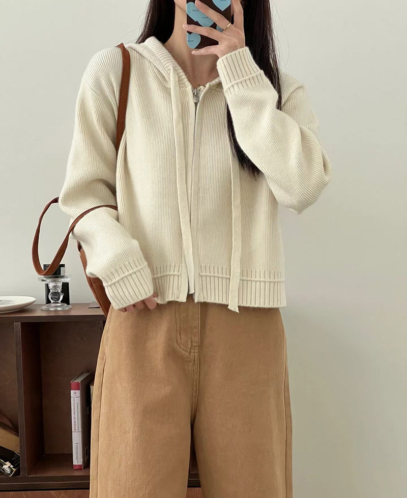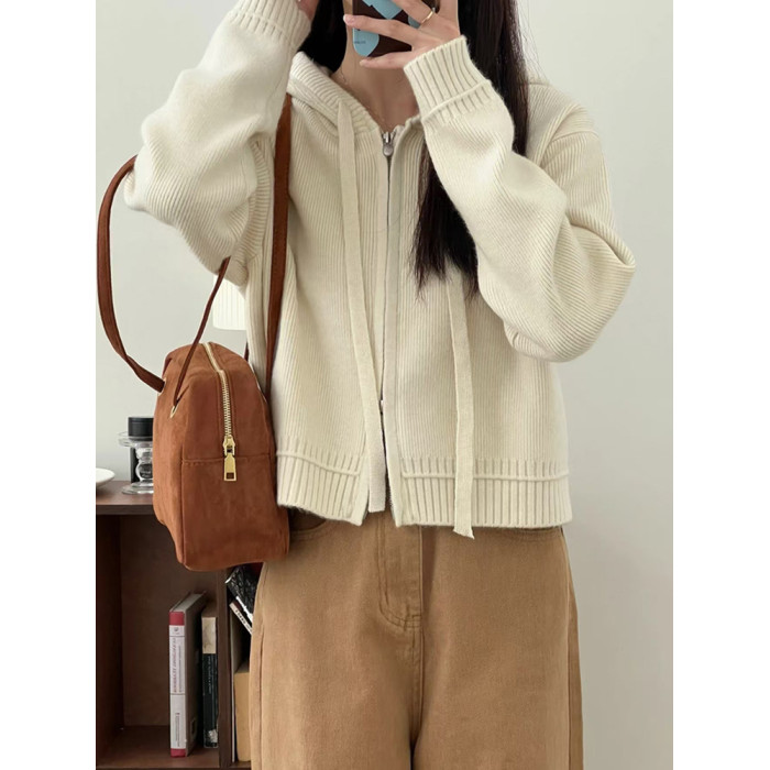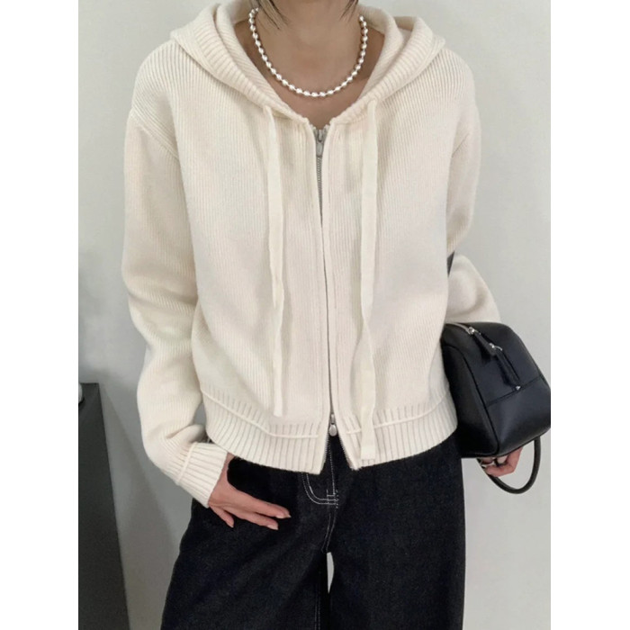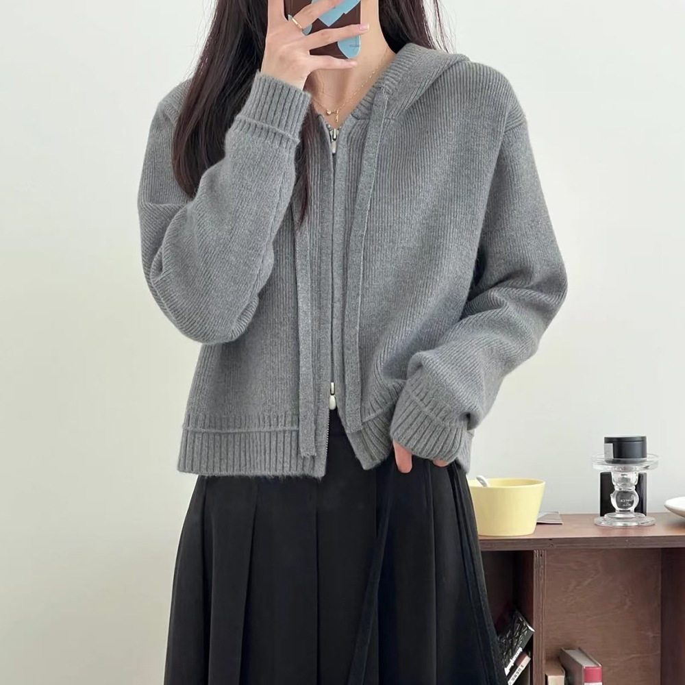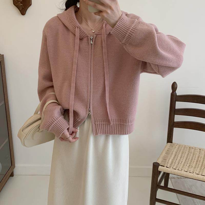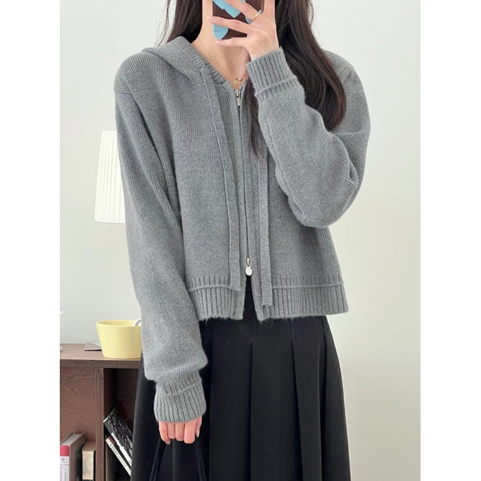 秋冬2025新款韓版雙頭拉鍊連帽毛衣女短款小個子氣質長袖上衣外套