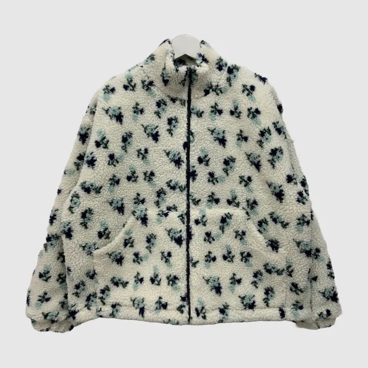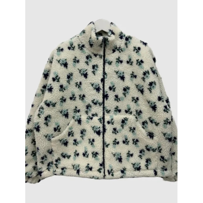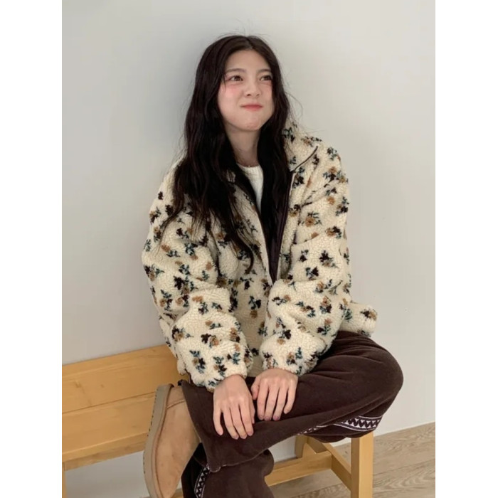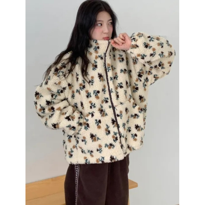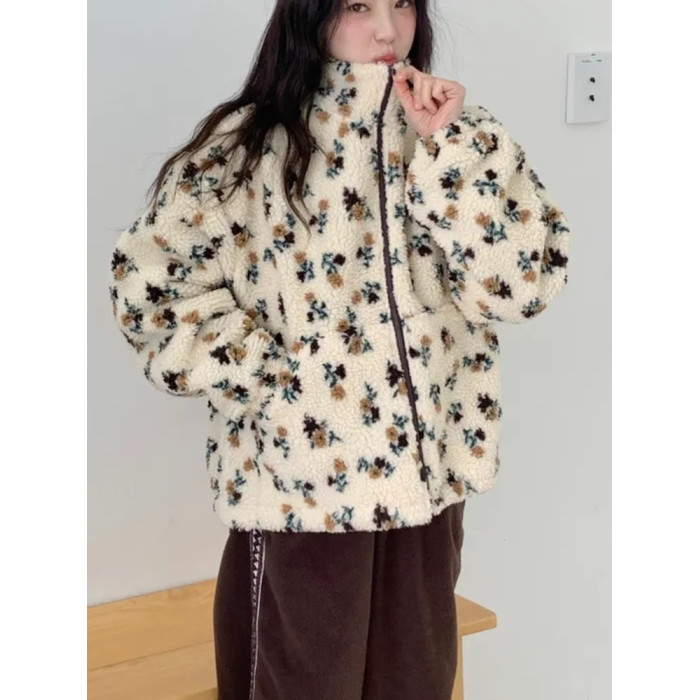 復古慵懶風撞色提花羊羔毛衛衣外套女2025冬季新款半拉鍊寬松上衣
