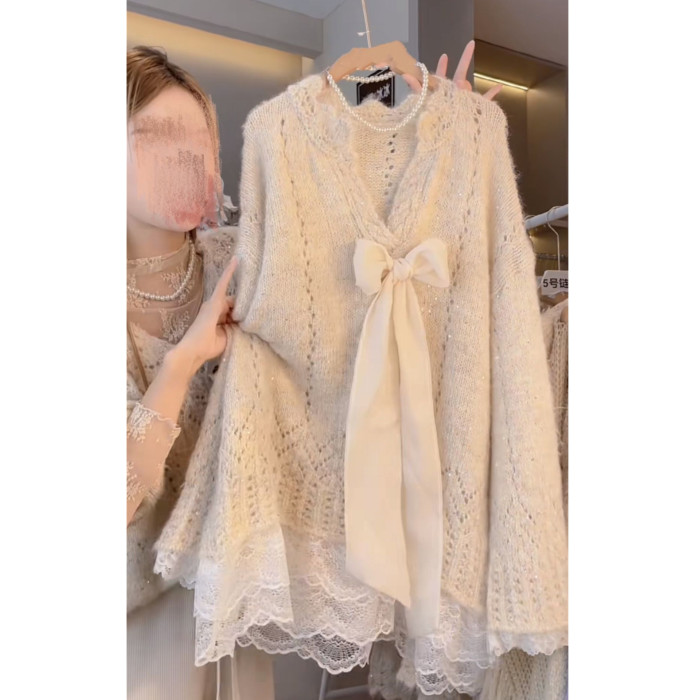 女秋冬季甜美外穿毛衣法式高級設計感蕾絲拼接公主風小衫軟糯上衣