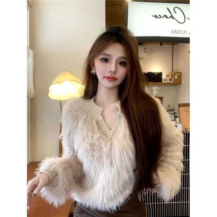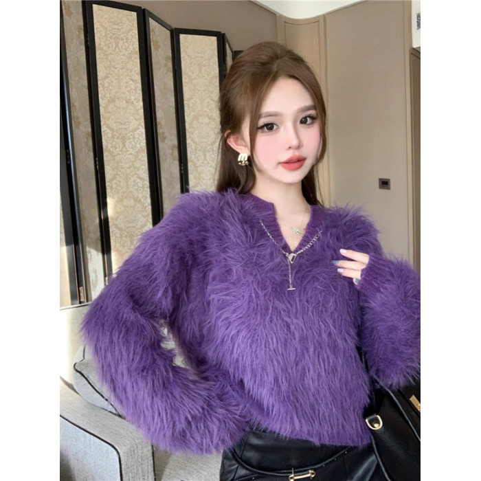 設計感仿水貂毛毛衣寬松慵懶風長袖v領女秋冬短款套頭針織衫上衣