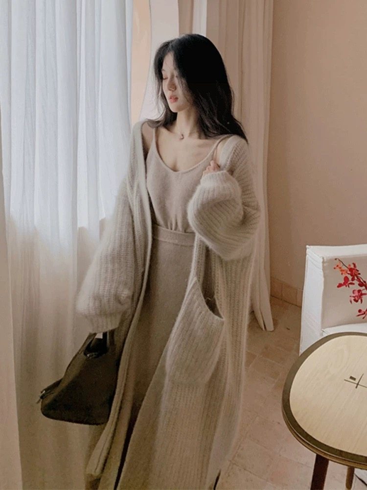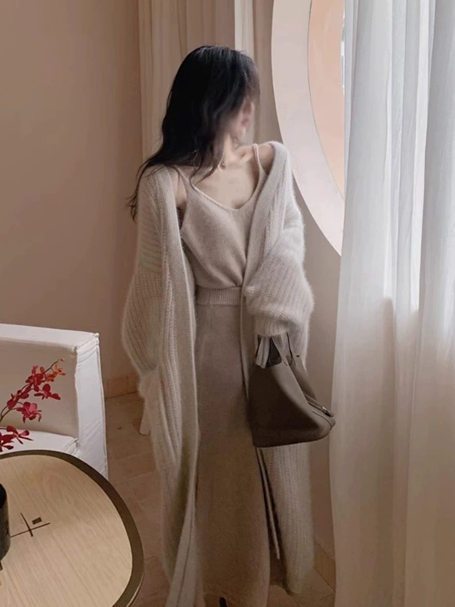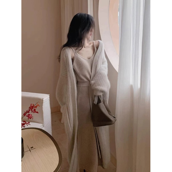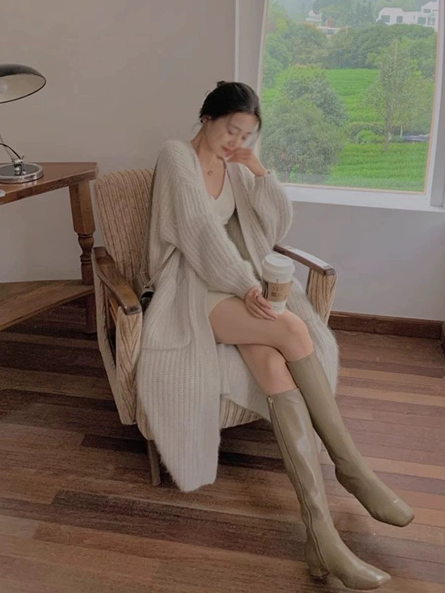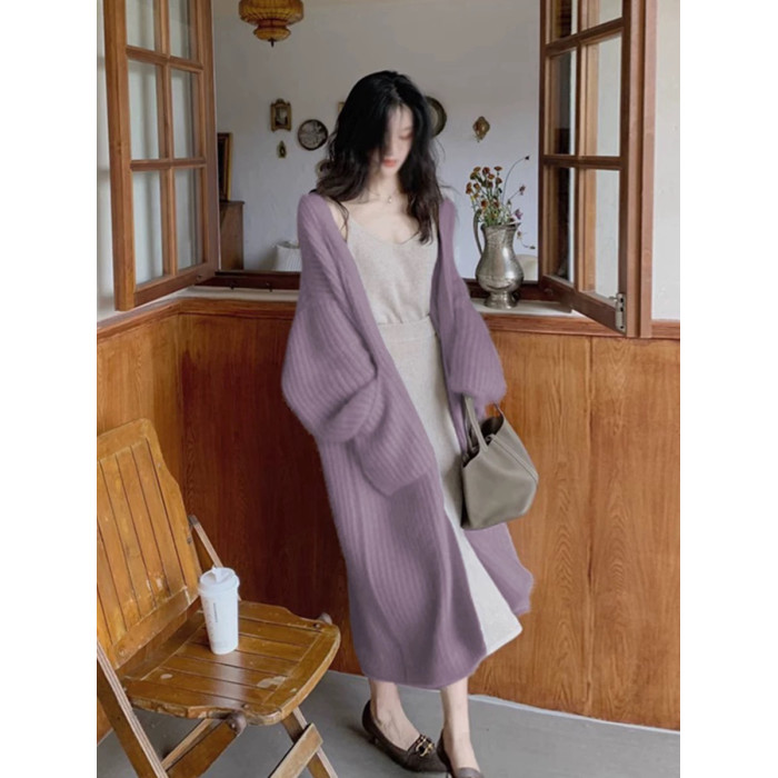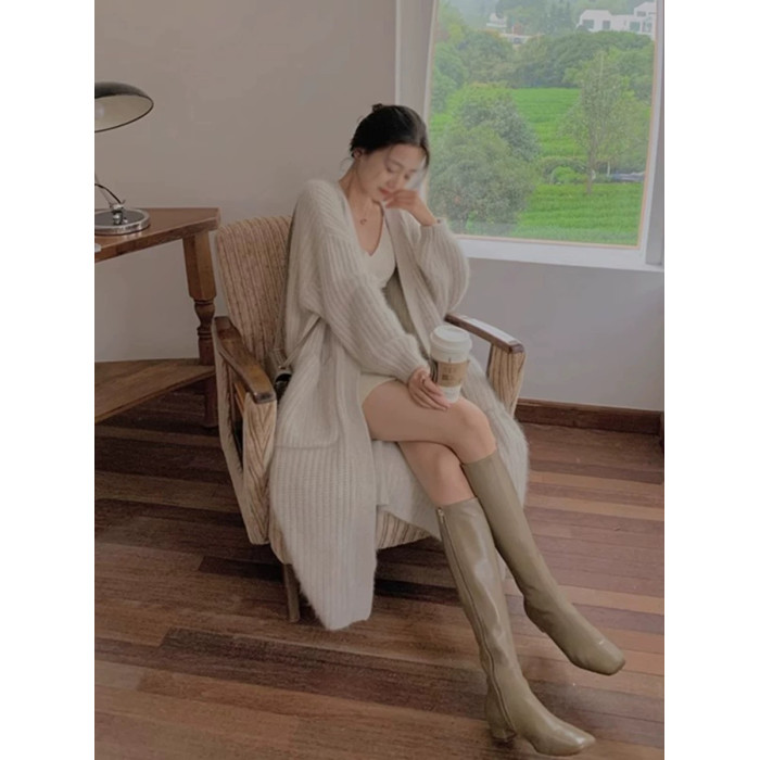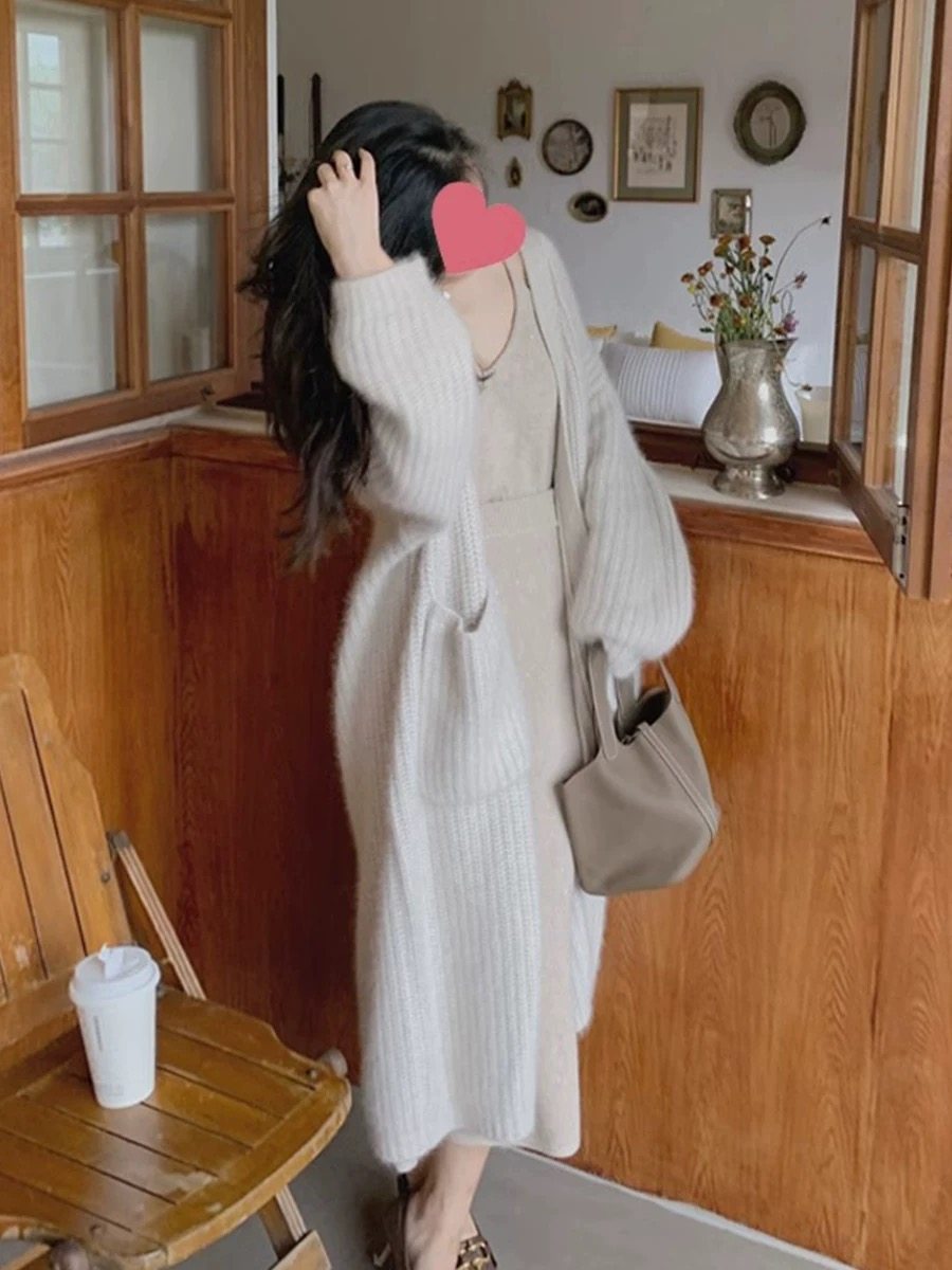水貂絨毛衣女秋冬新款寬鬆慵嬾高級感氣質過膝中長款針織開衫外套