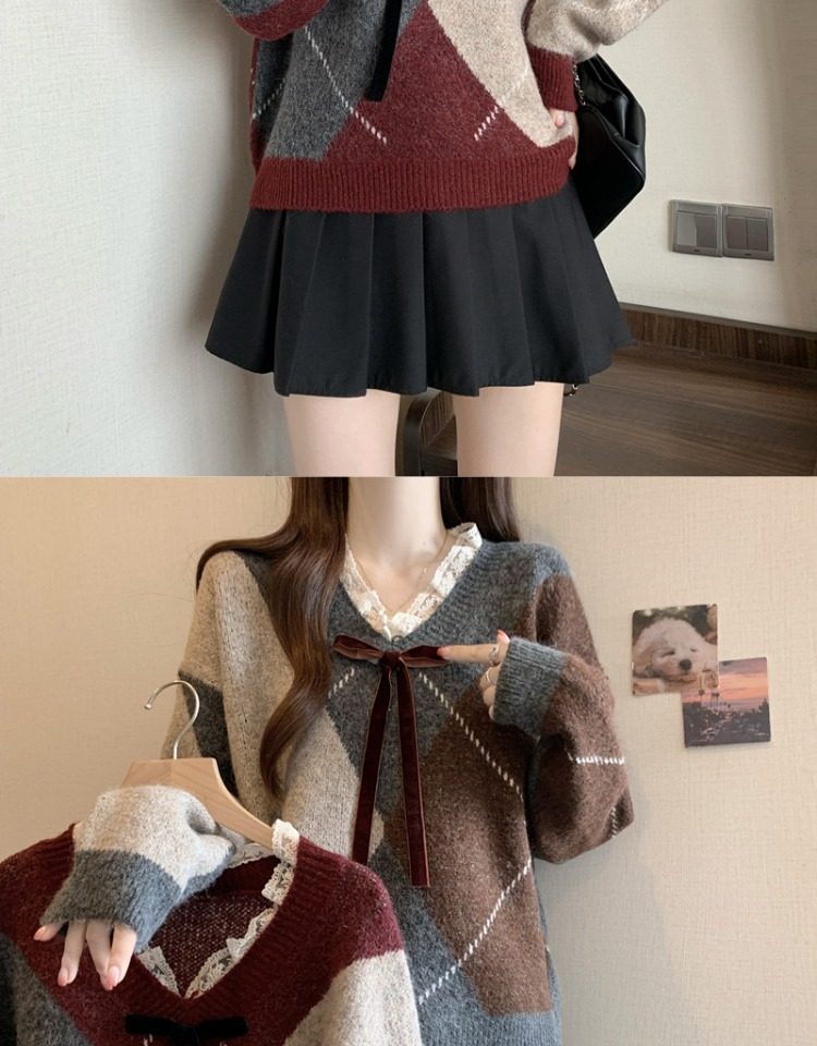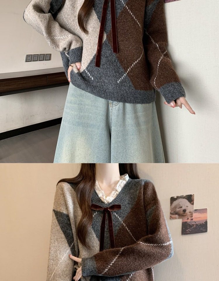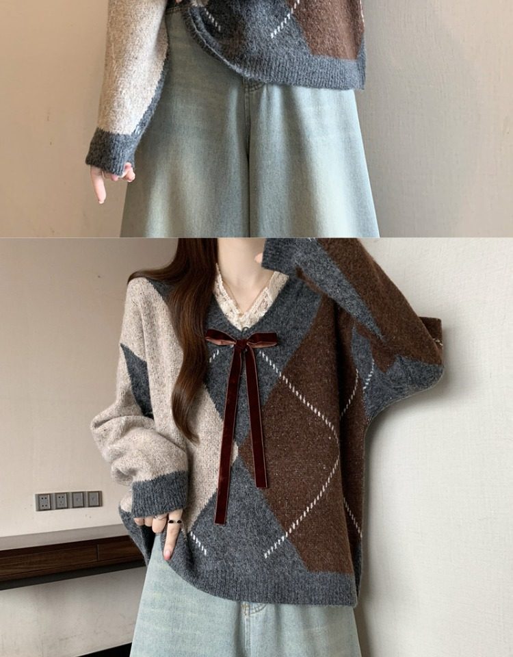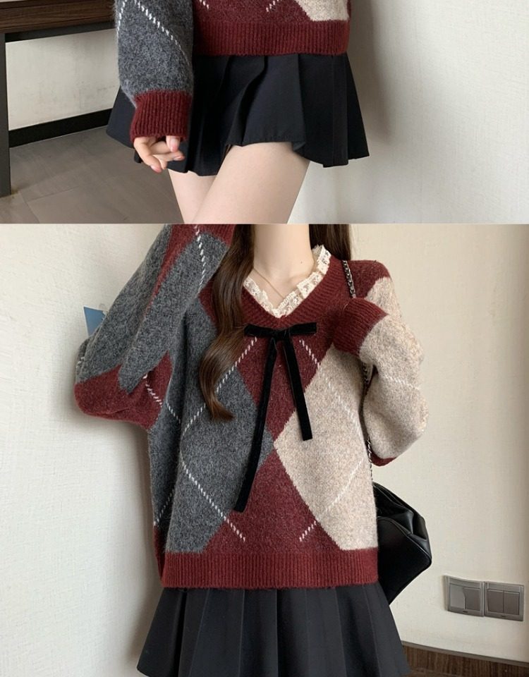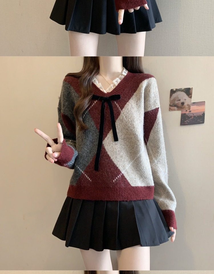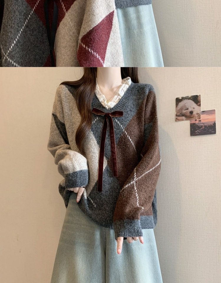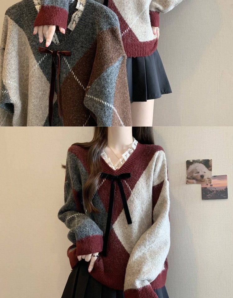 學院風菱格v領毛衣女秋冬大碼胖妹妹顯瘦小衆獨特別致上衣針織衫