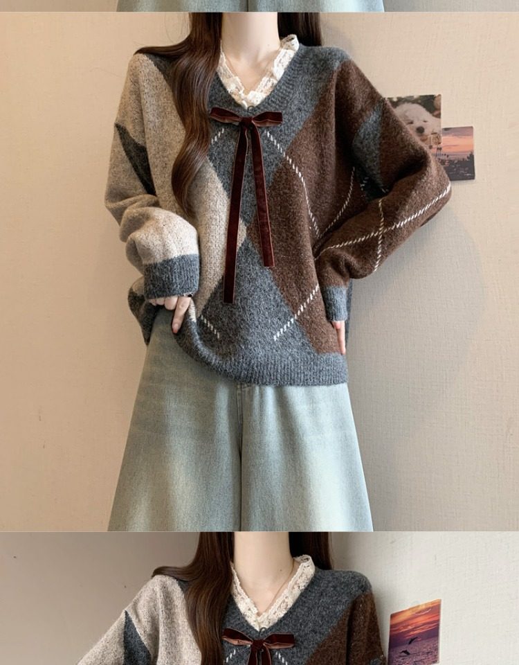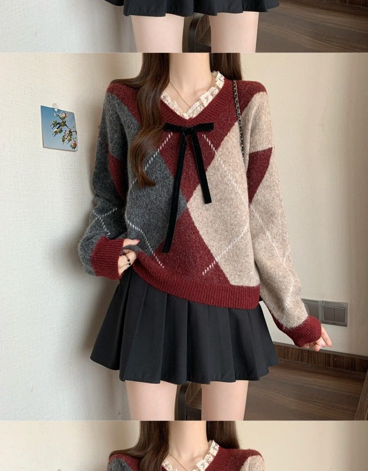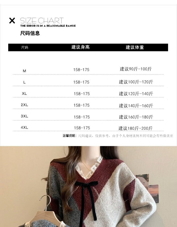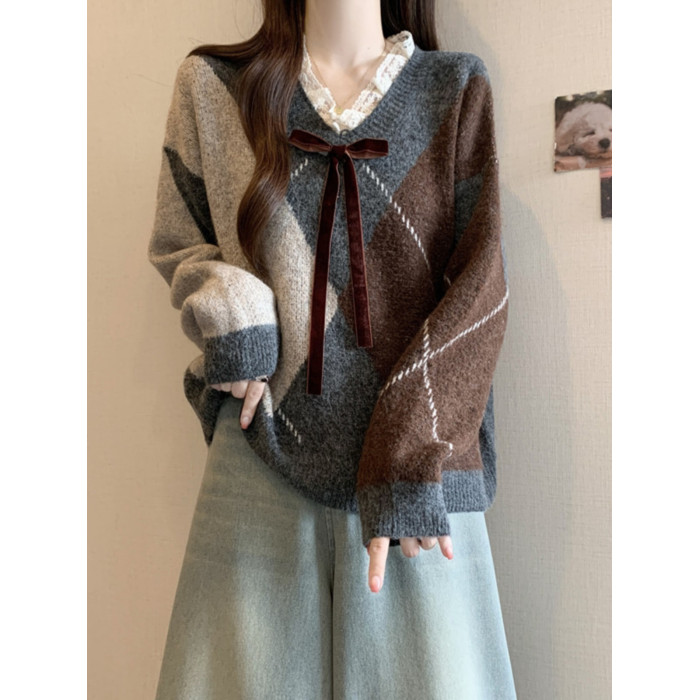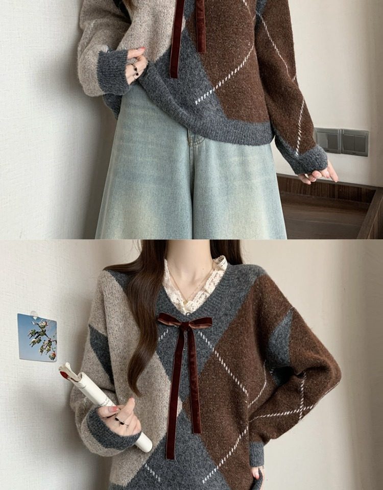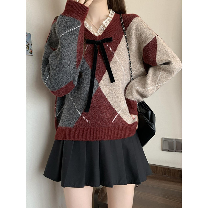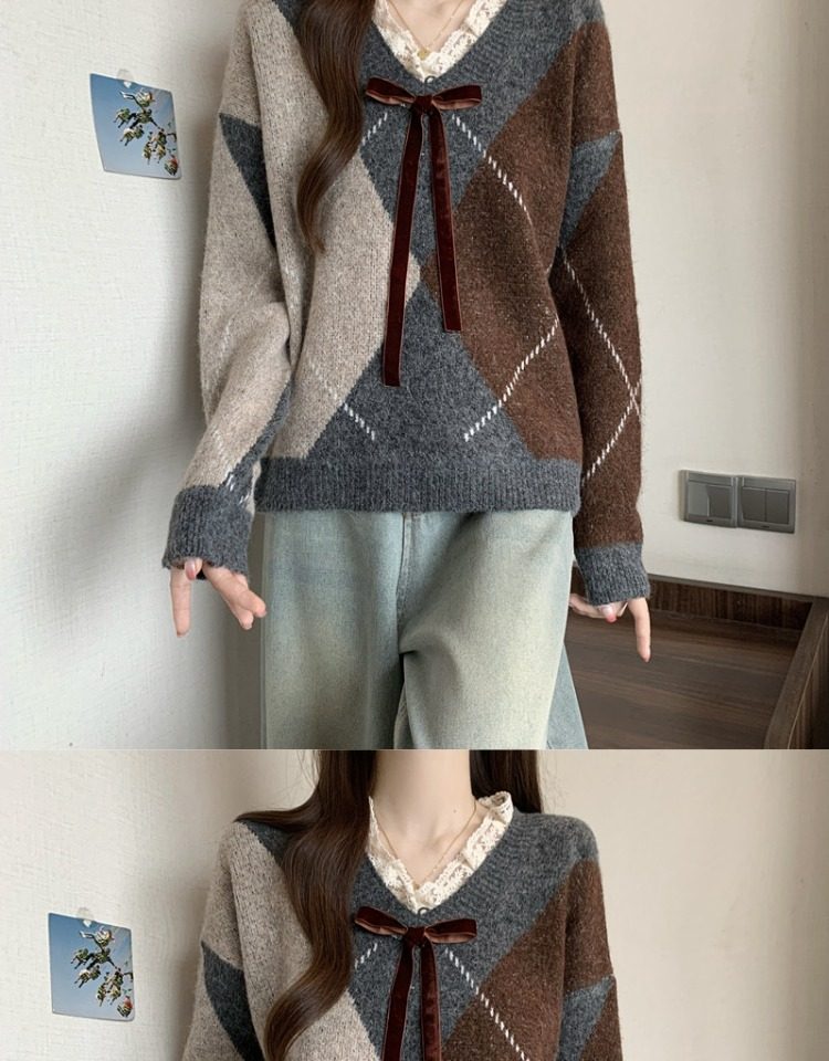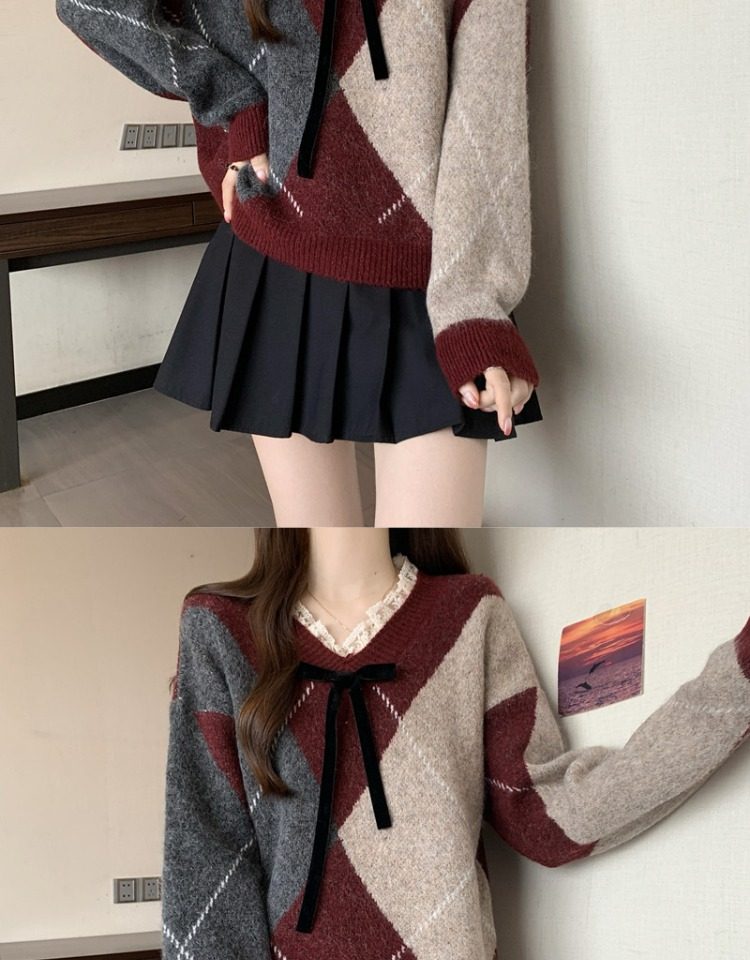 學院風菱格v領毛衣女秋冬大碼胖妹妹顯瘦小衆獨特別致上衣針織衫