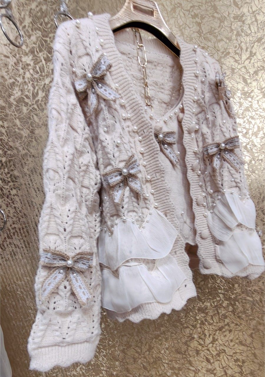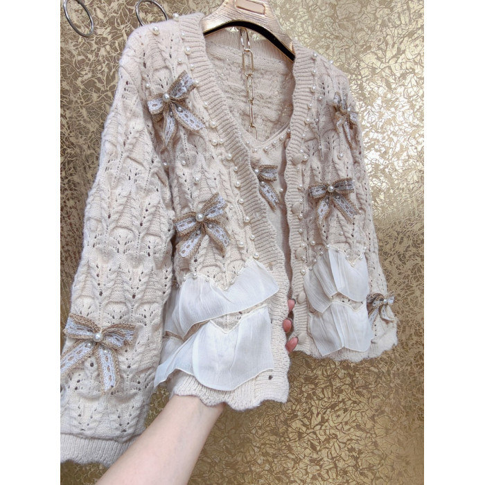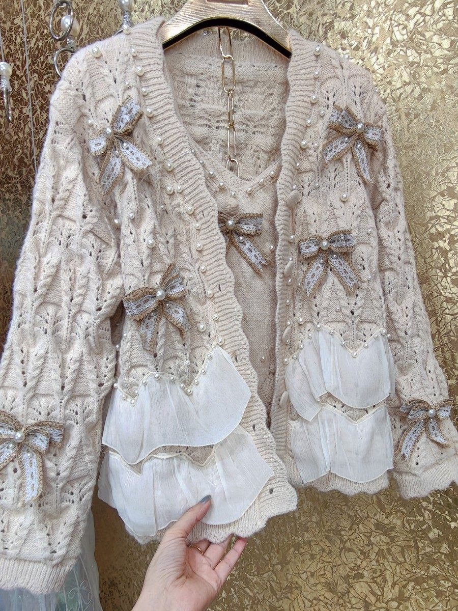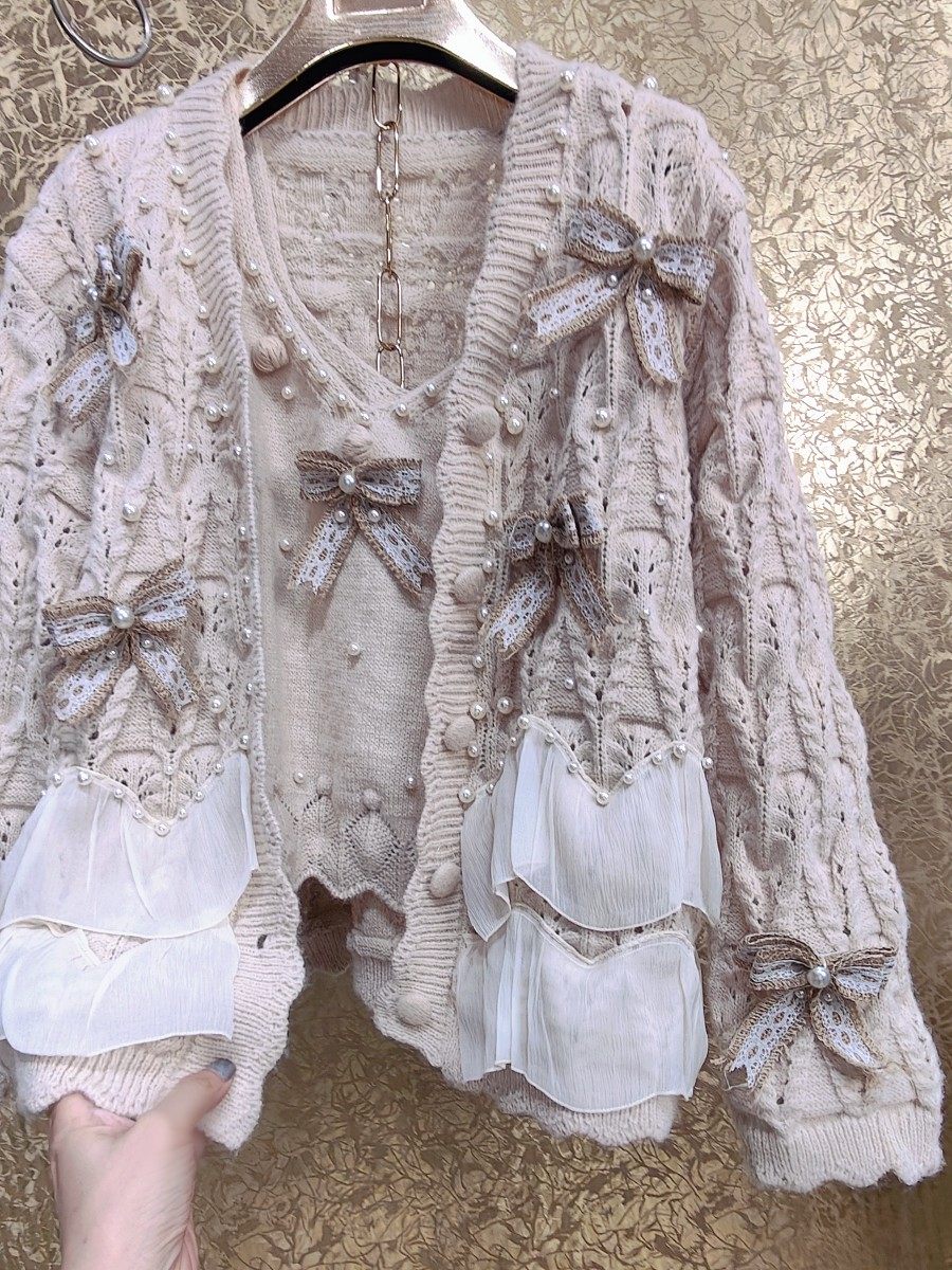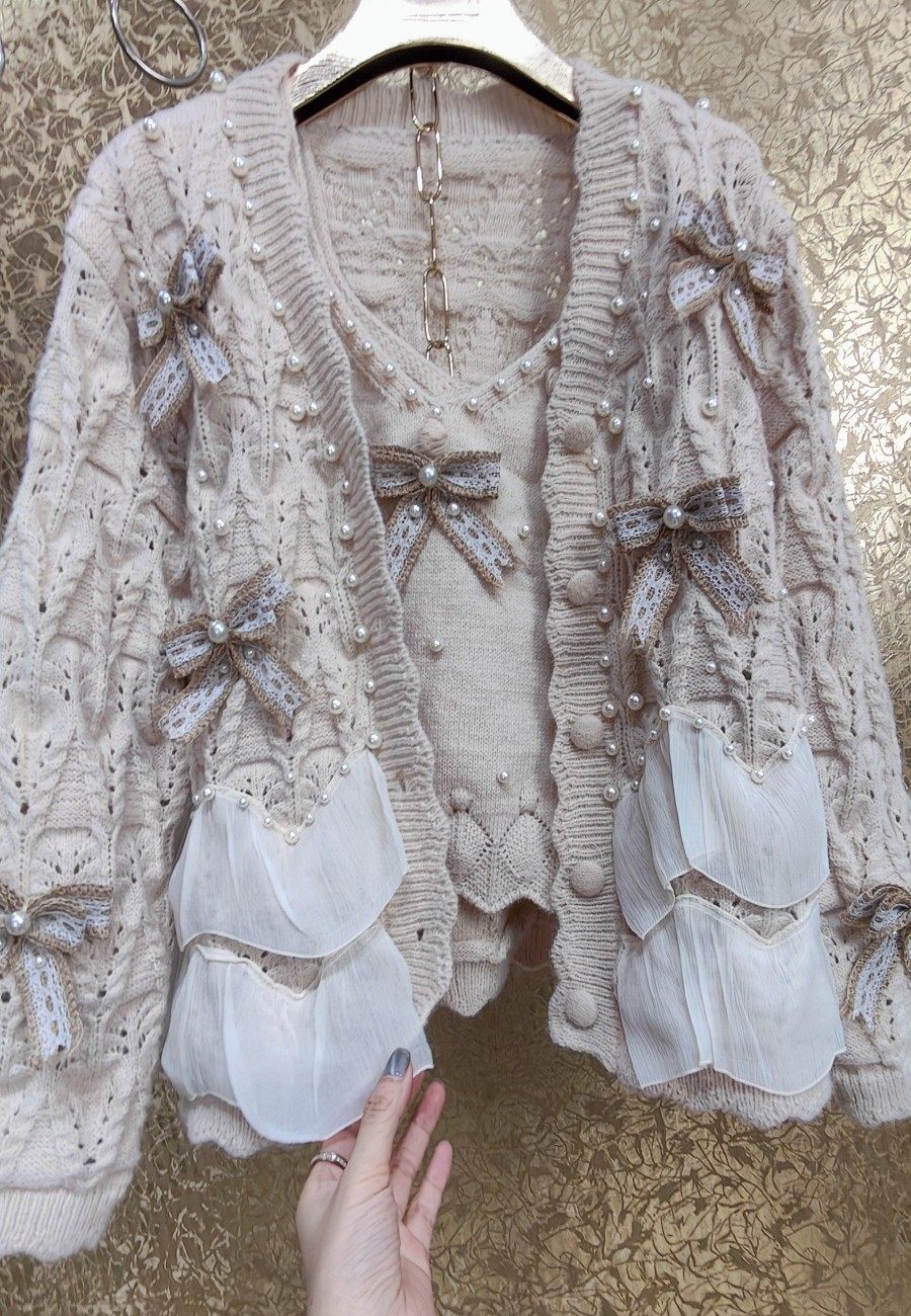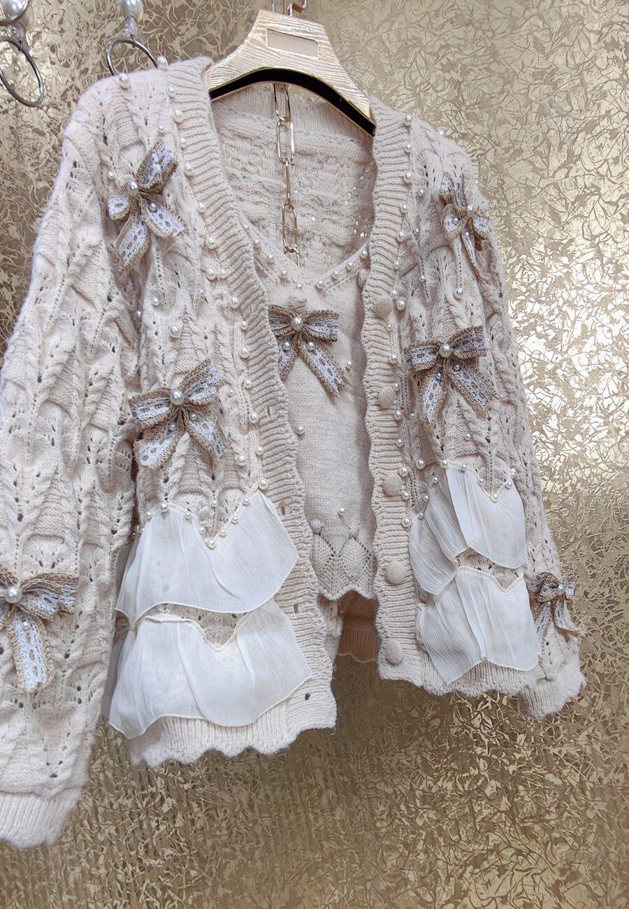 高級 不撞衣 高級手工蝴蝶結珍珠下擺立體荷葉邊裙擺兩件套開衫
