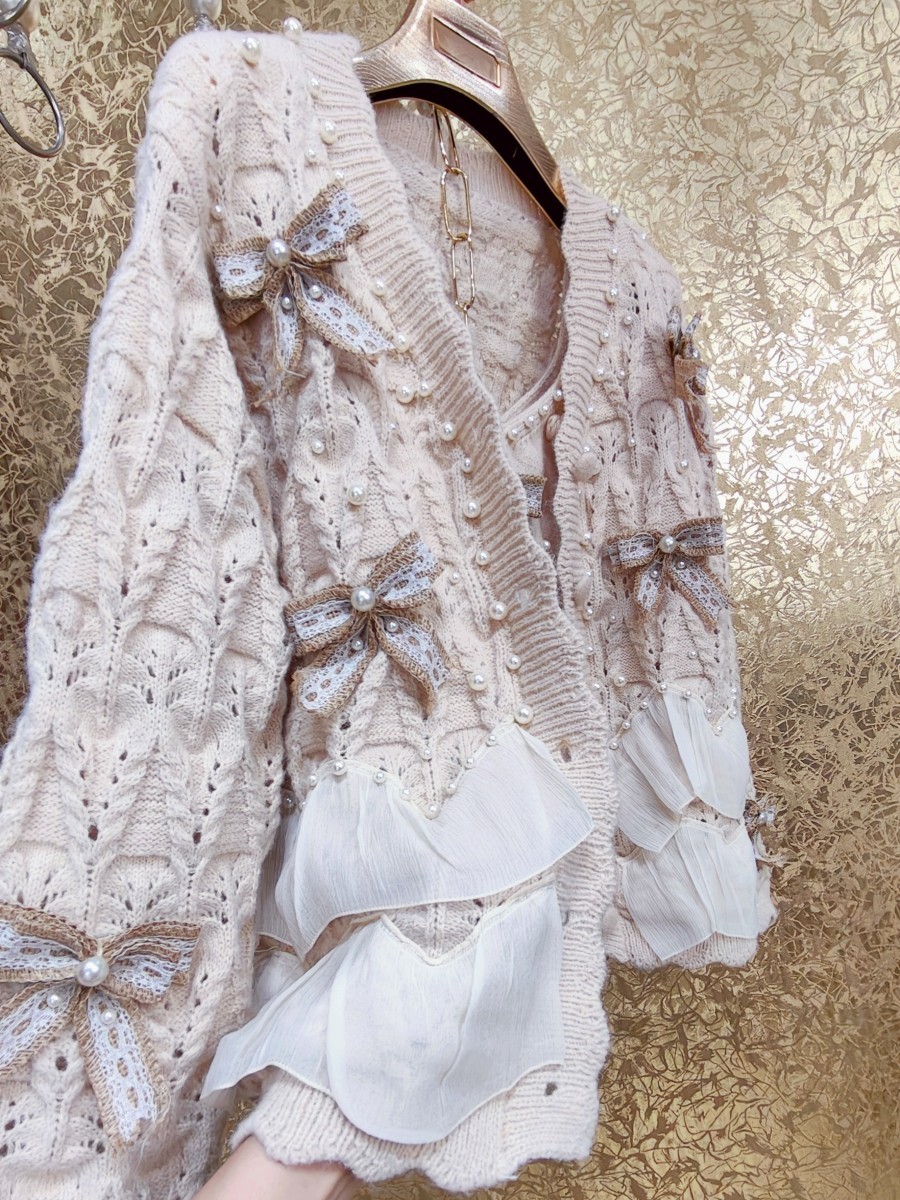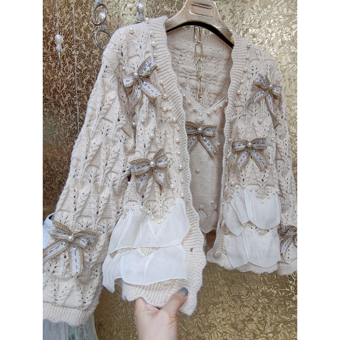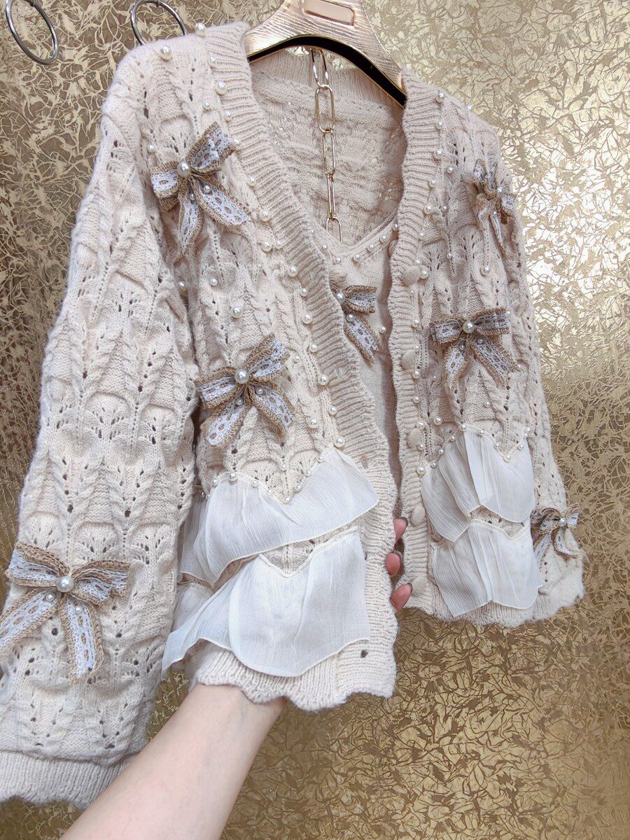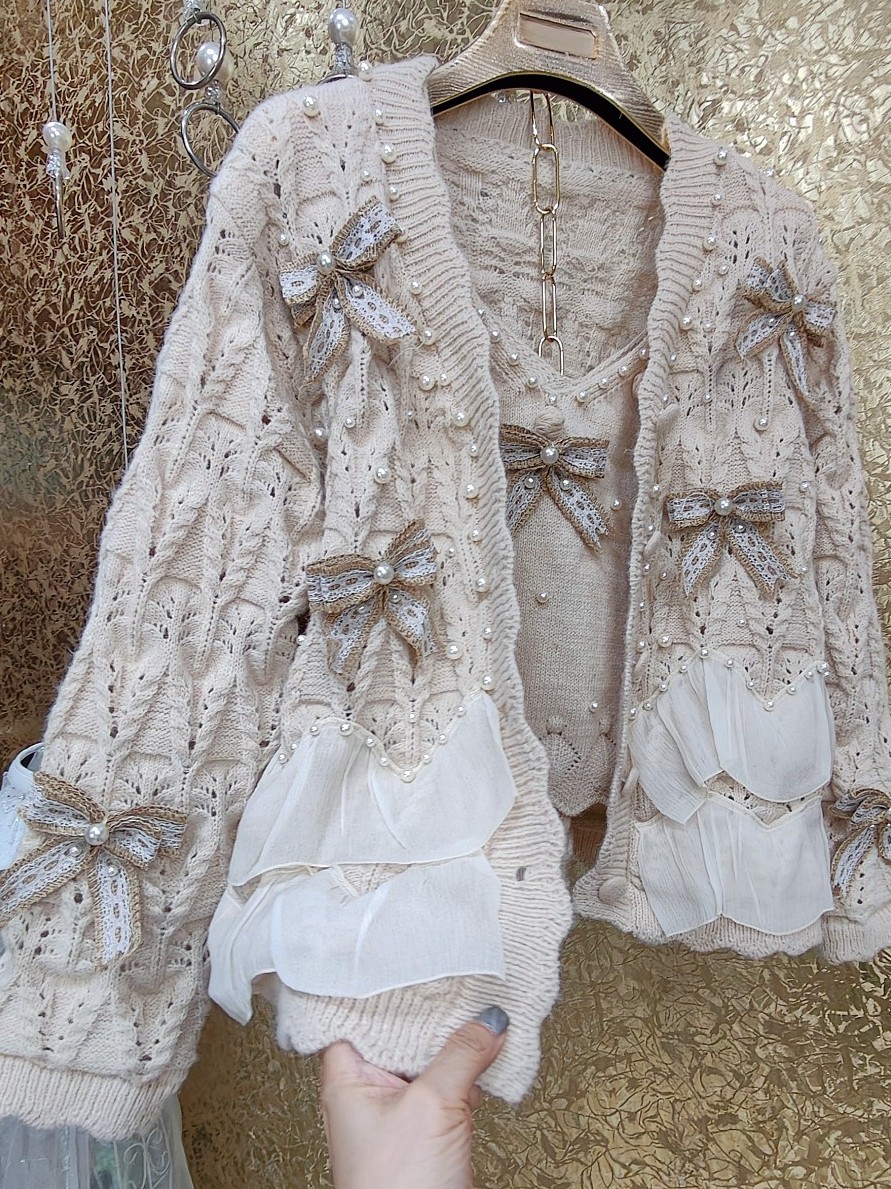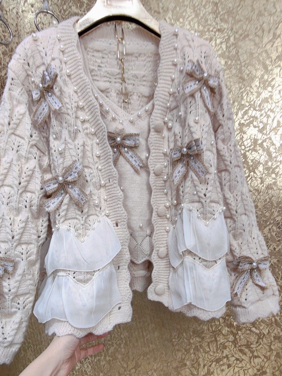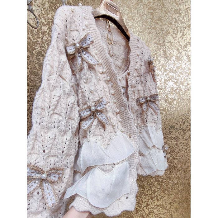 高級 不撞衣 高級手工蝴蝶結珍珠下擺立體荷葉邊裙擺兩件套開衫