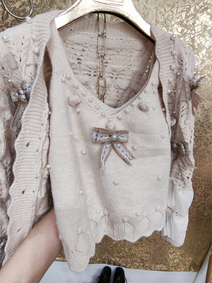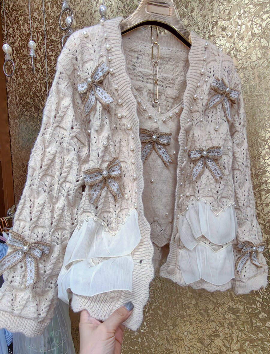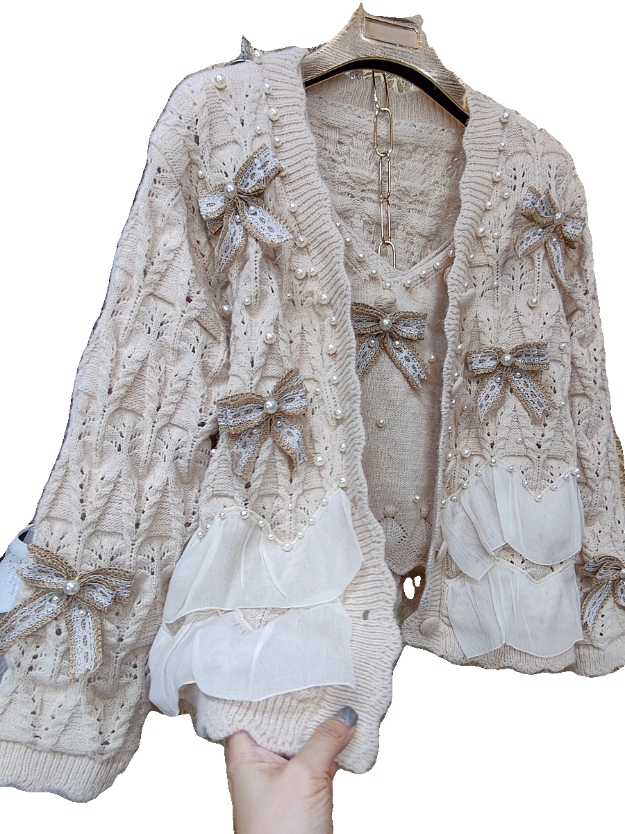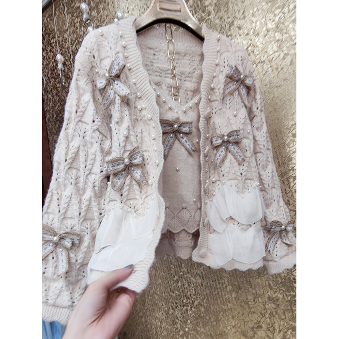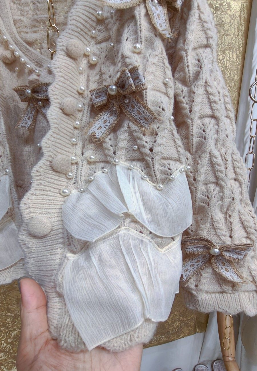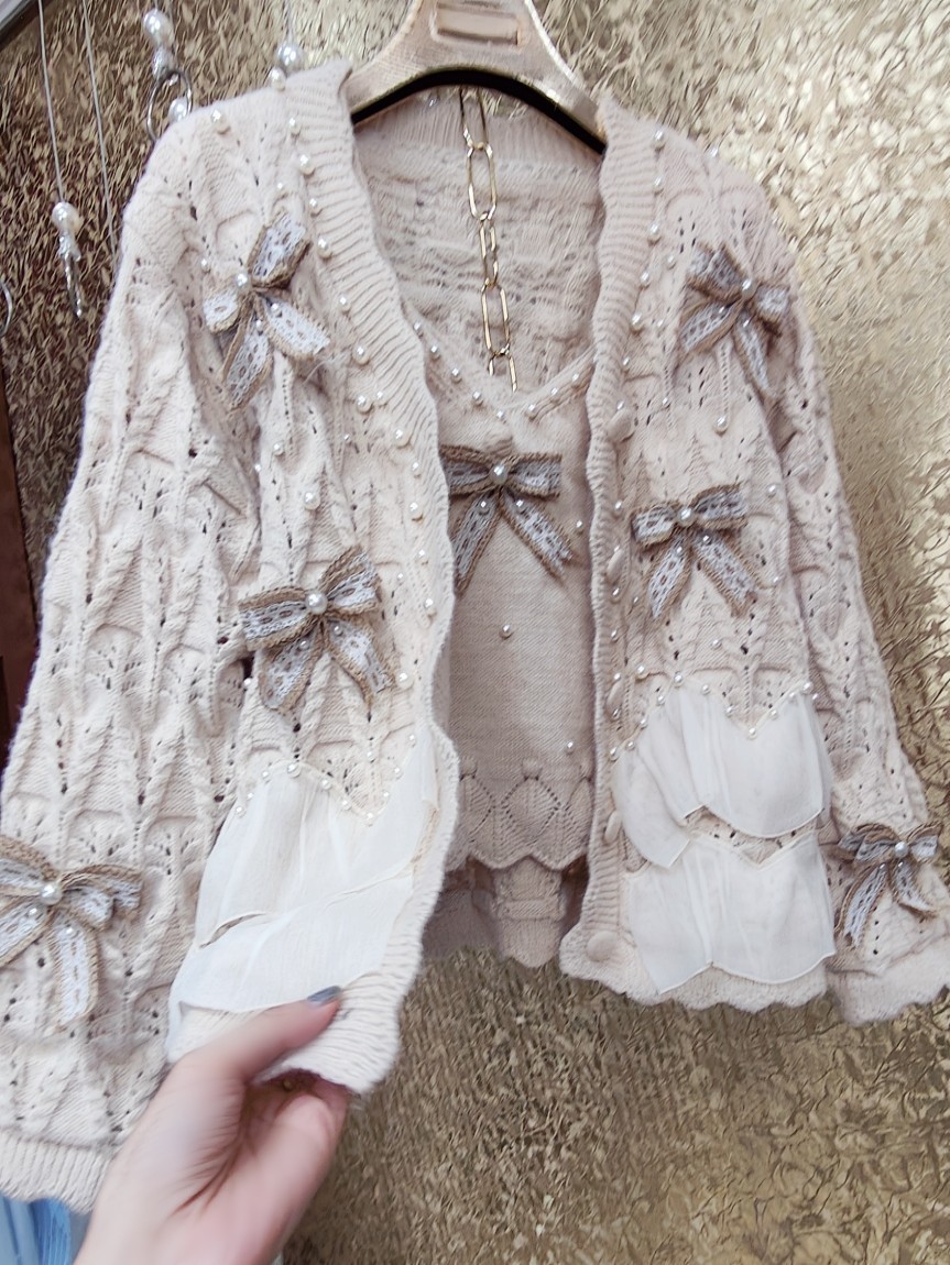 高級 不撞衣 高級手工蝴蝶結珍珠下擺立體荷葉邊裙擺兩件套開衫