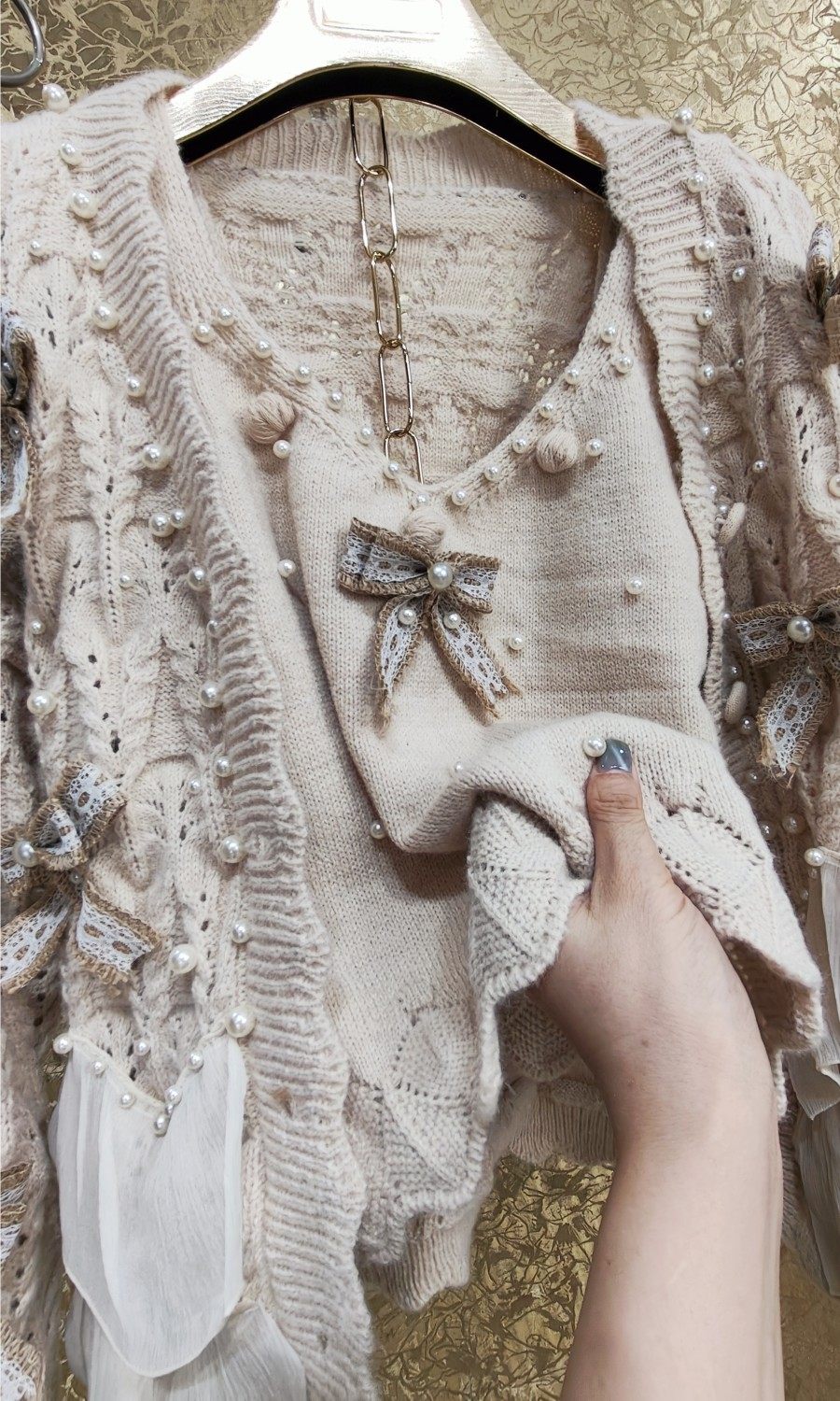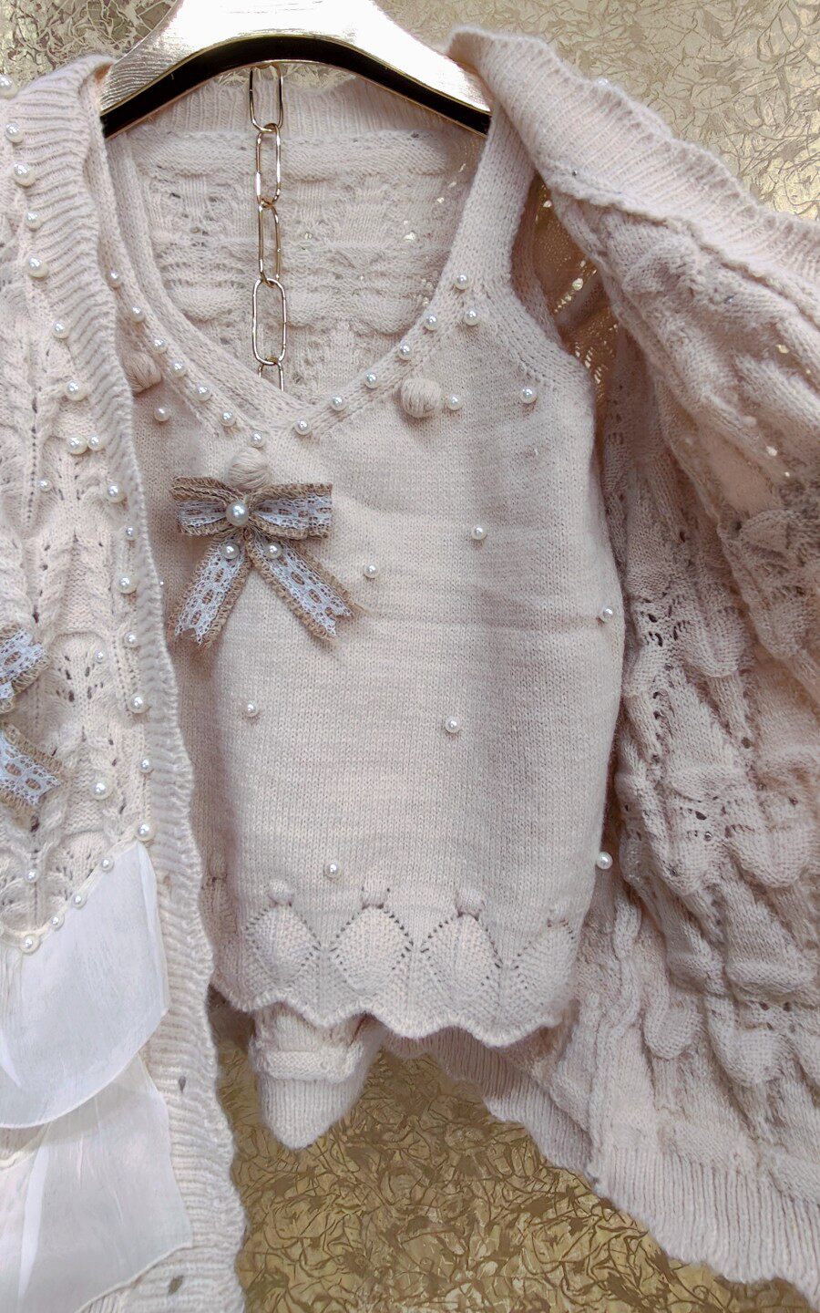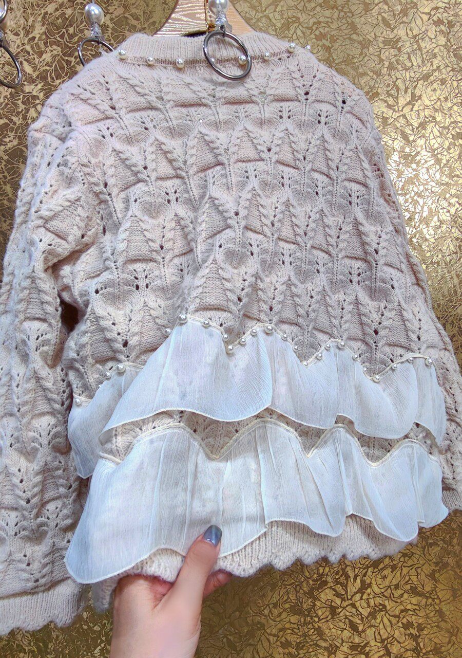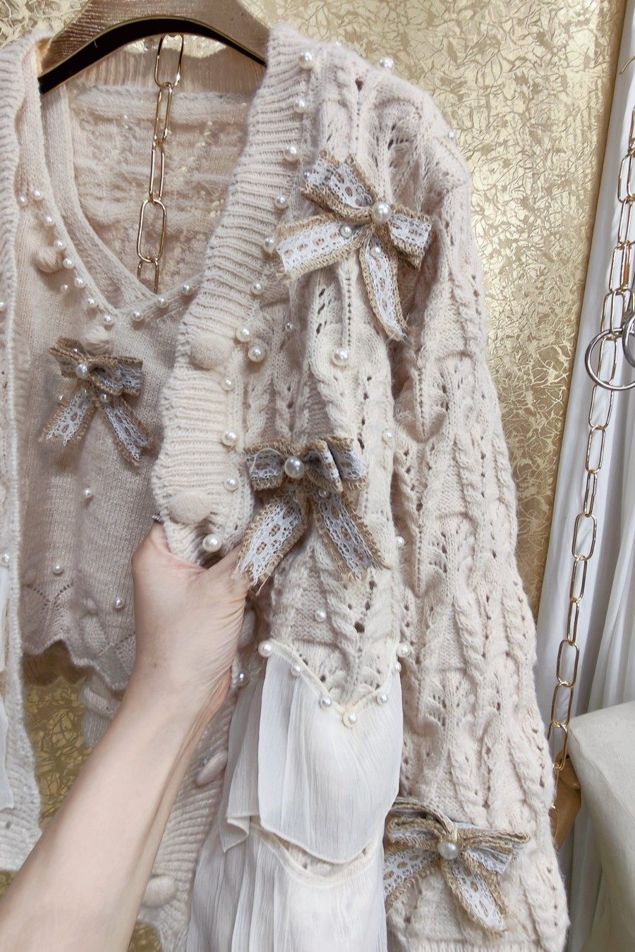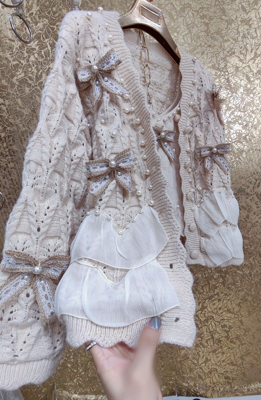 高級 不撞衣 高級手工蝴蝶結珍珠下擺立體荷葉邊裙擺兩件套開衫