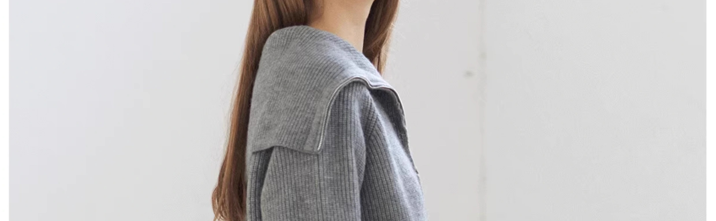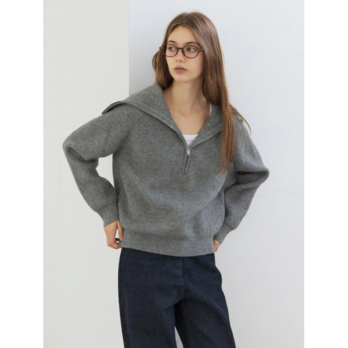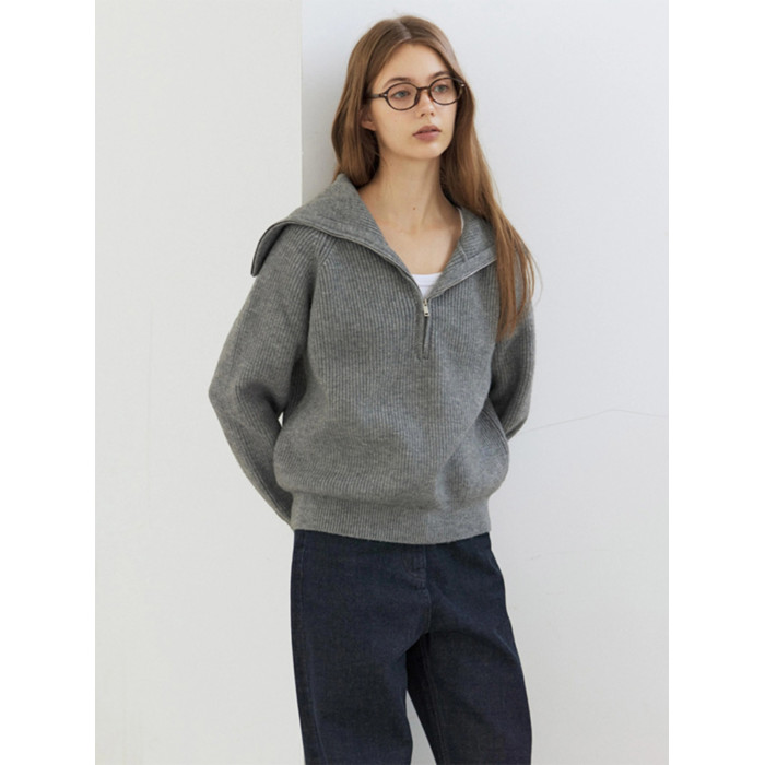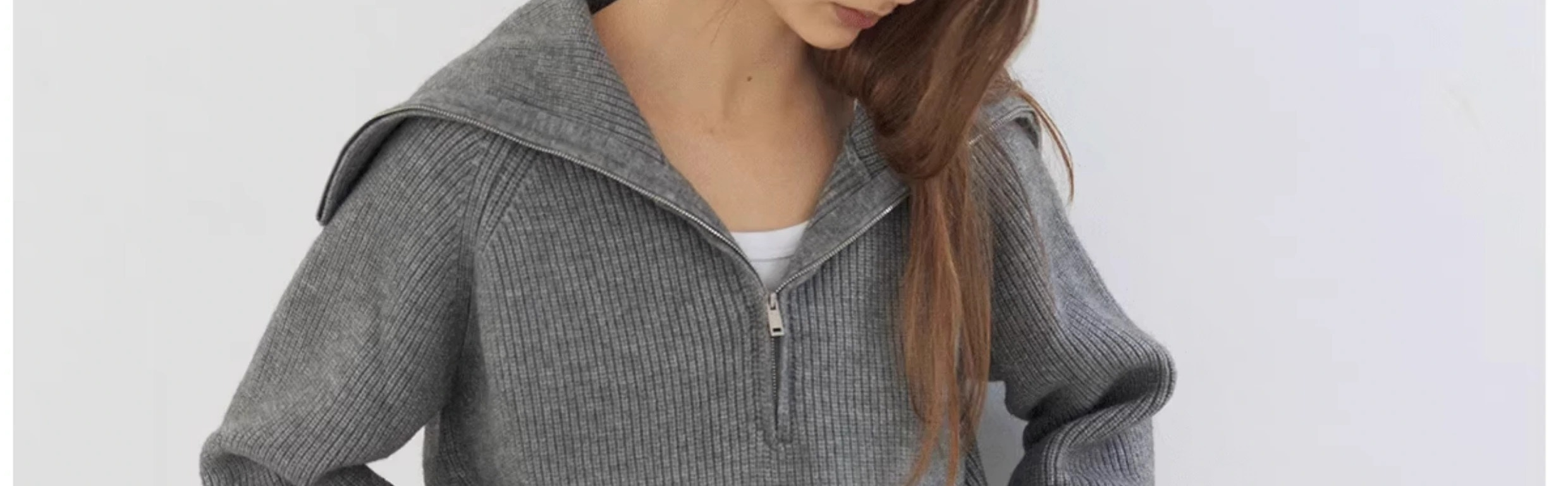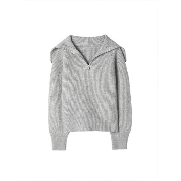 灰色復古法式海軍領套頭毛衣女秋冬寬鬆慵嬾繙領半拉鍊針織衫上衣