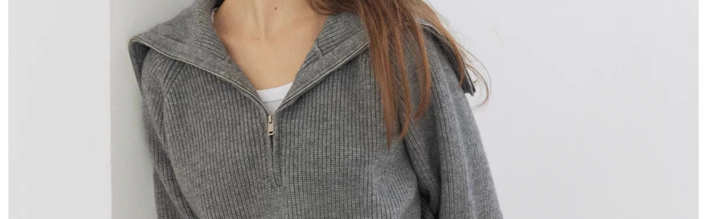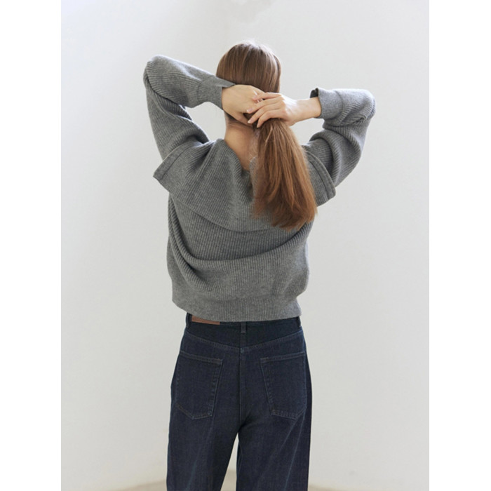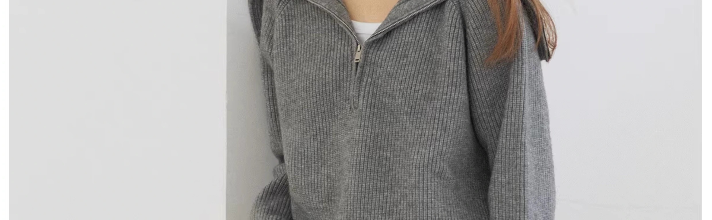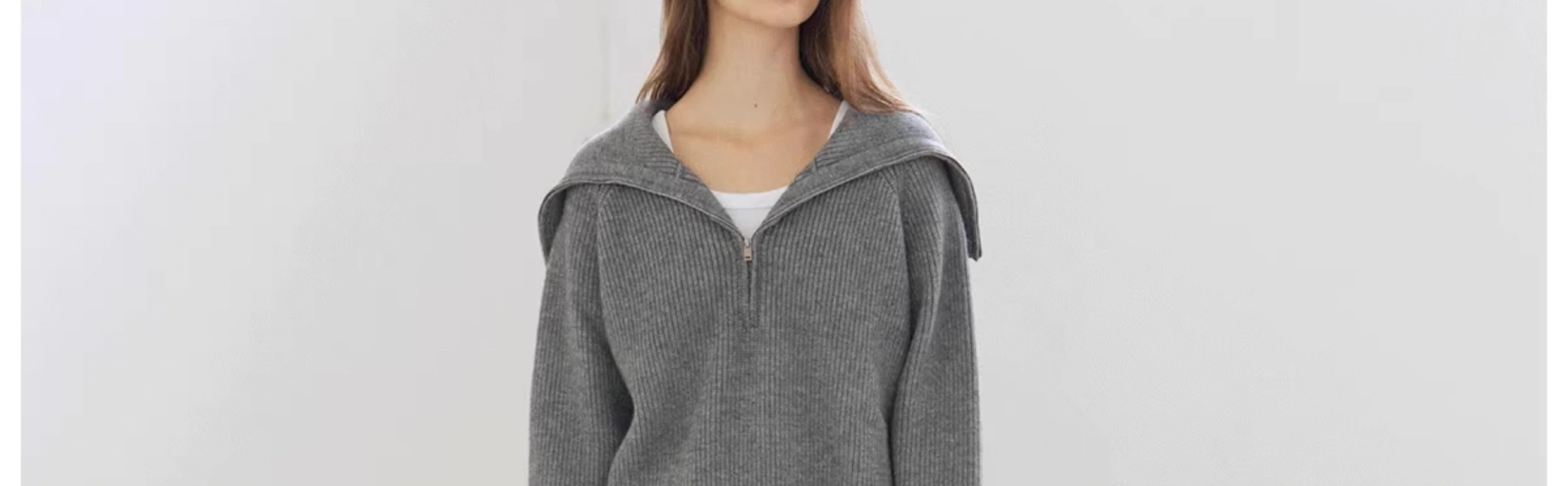 灰色復古法式海軍領套頭毛衣女秋冬寬鬆慵嬾繙領半拉鍊針織衫上衣
