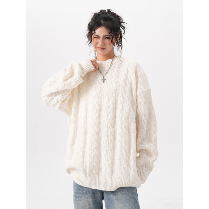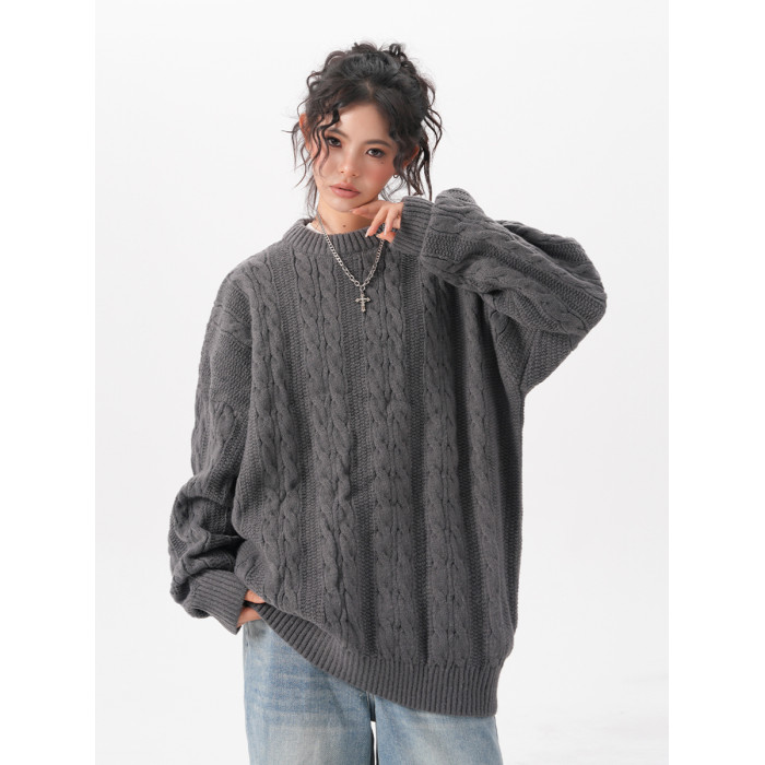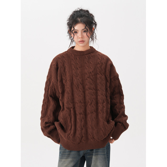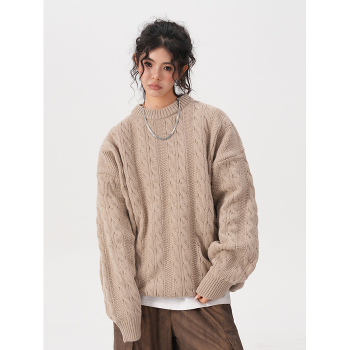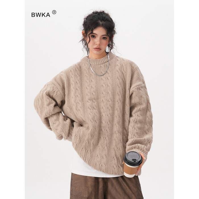 BWKA美式復古麻花圓領毛衣女男秋冬重磅加厚慵懶風寬松情侶針織衫