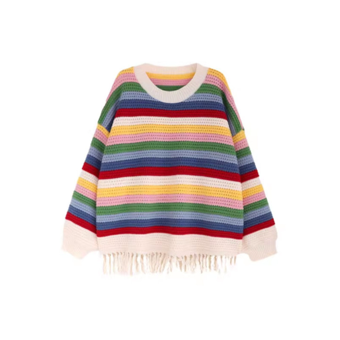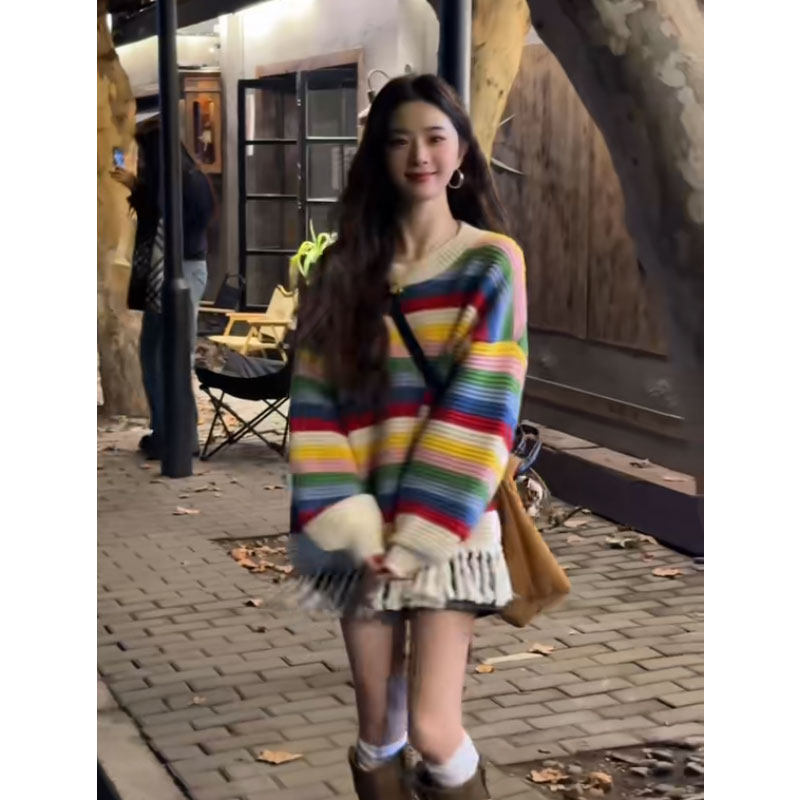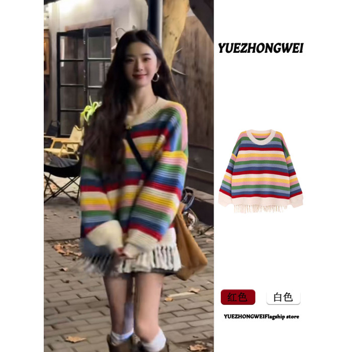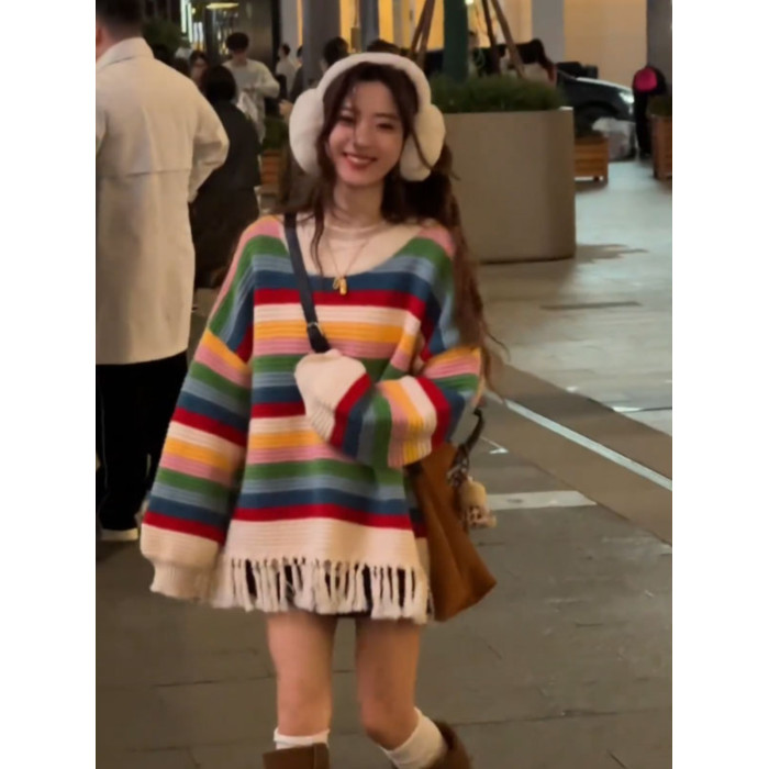 聖誕彩虹條紋流蘇毛衣女款2026新款秋冬季慵嬾風中長款針織衫上衣