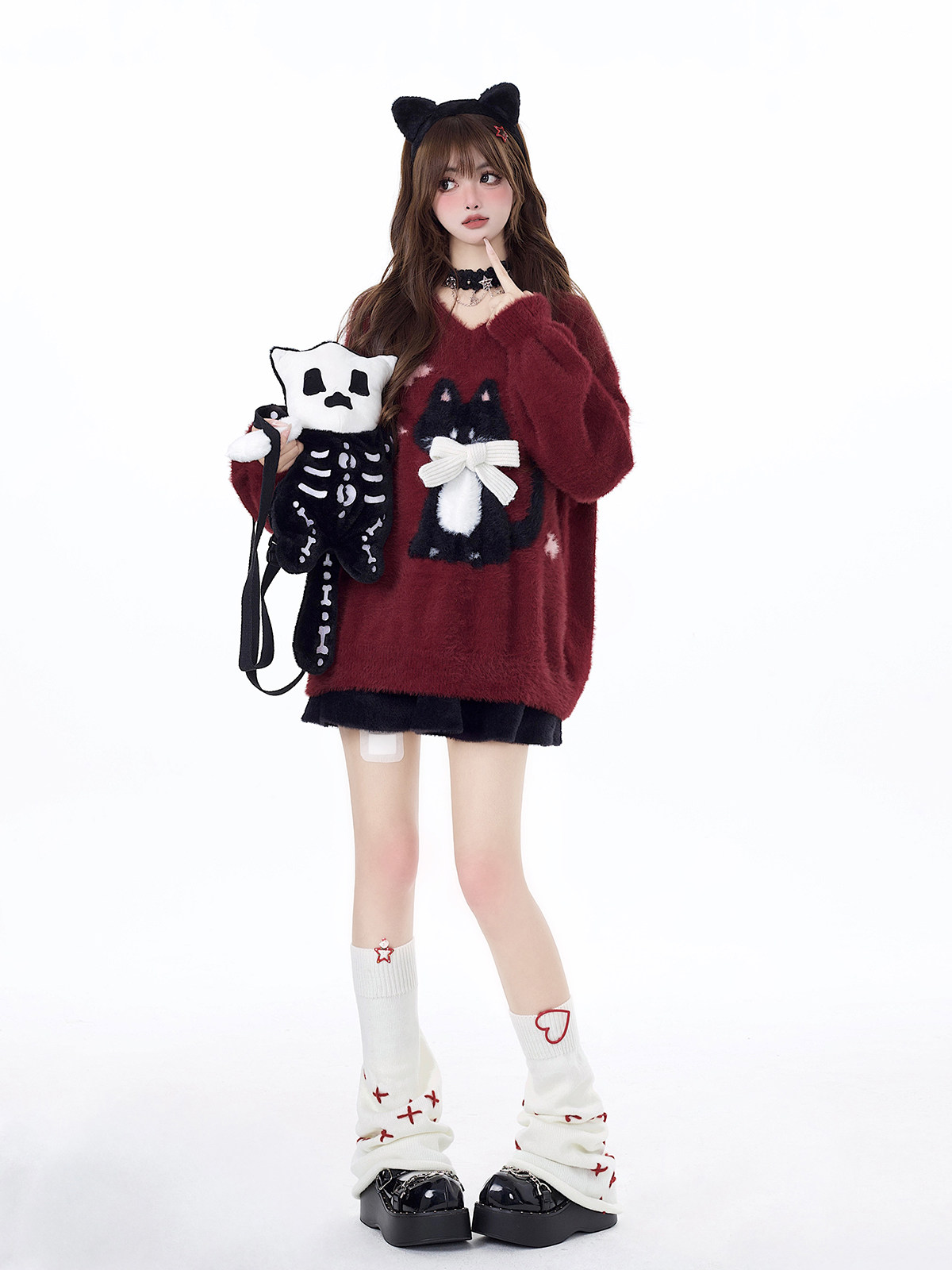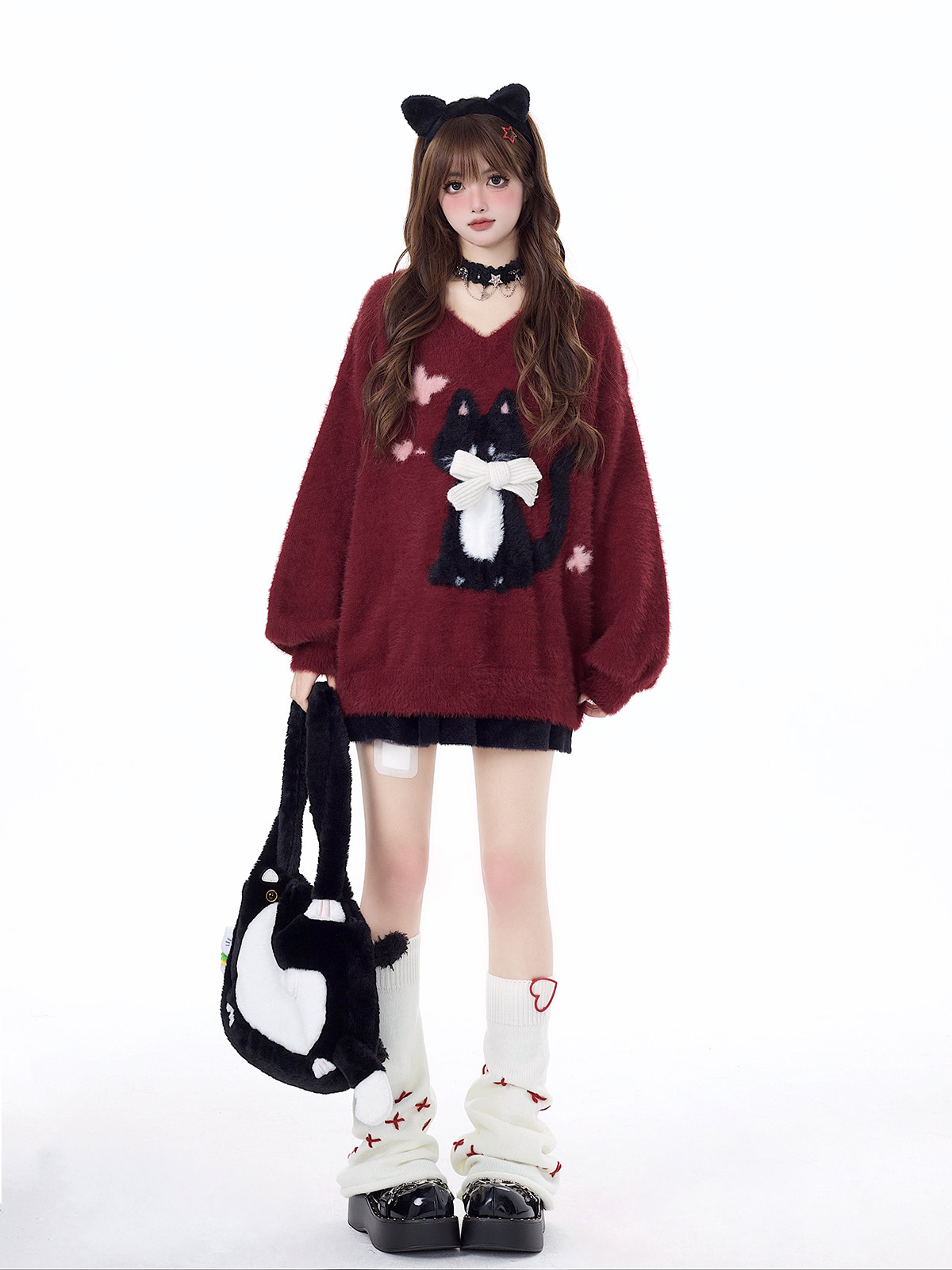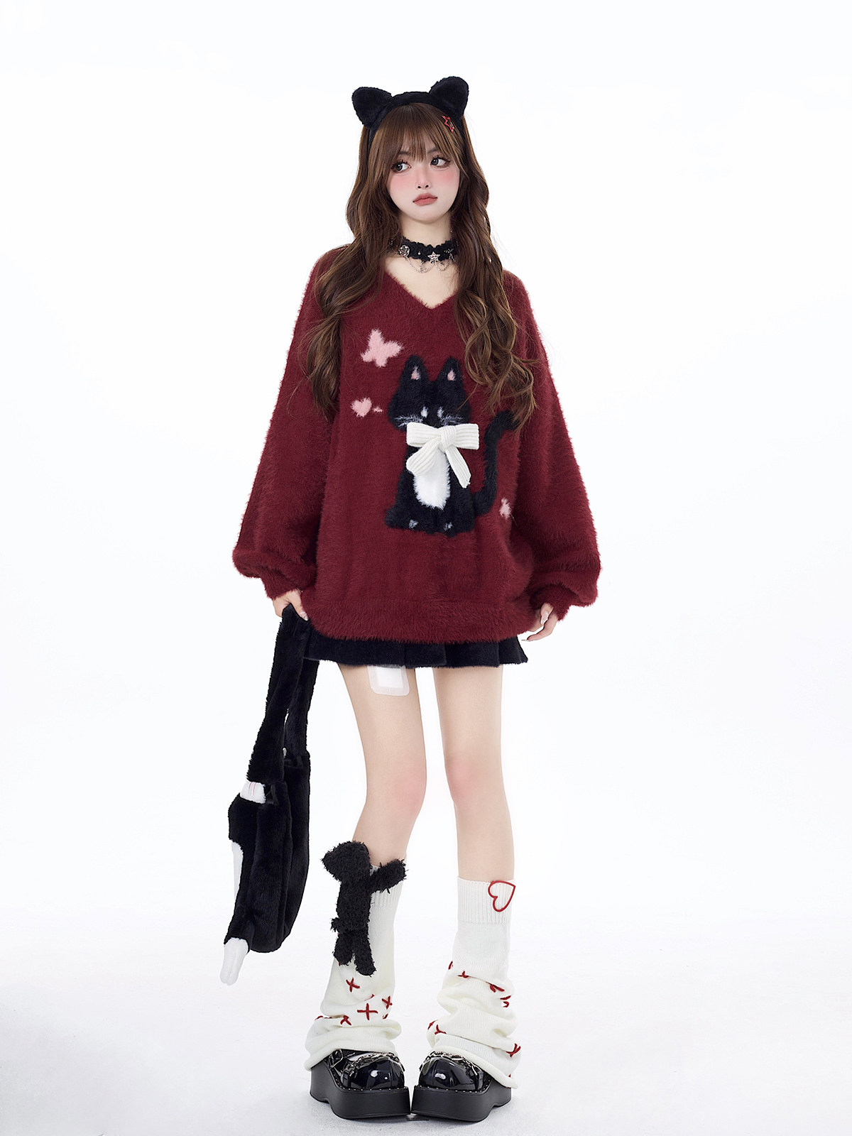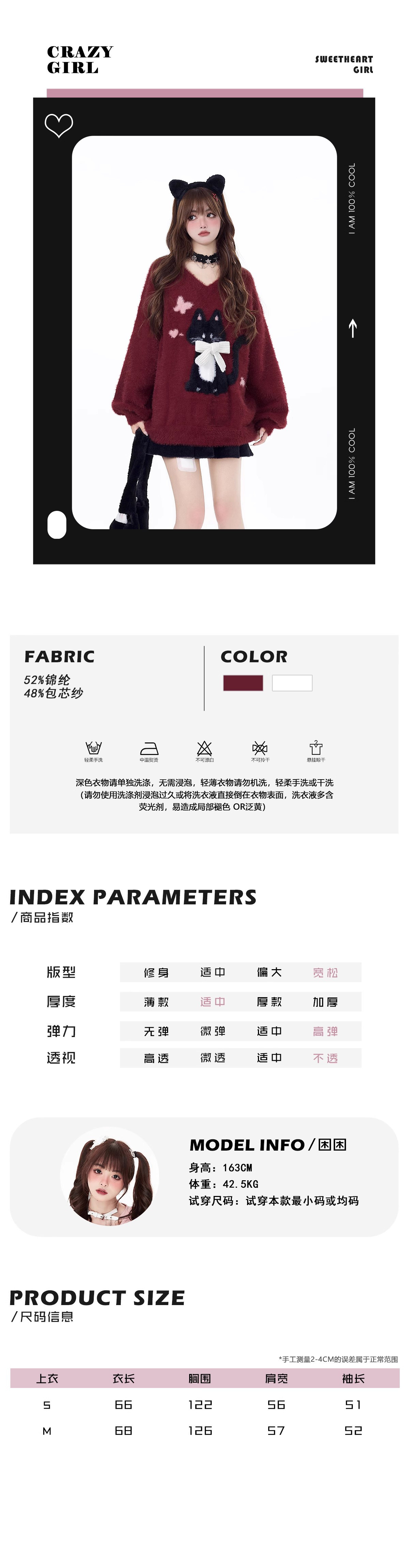 crazygirl【慵嬾小貓】原創蝴蝶結軟糯秋冬新年紅寬鬆內搭毛衣