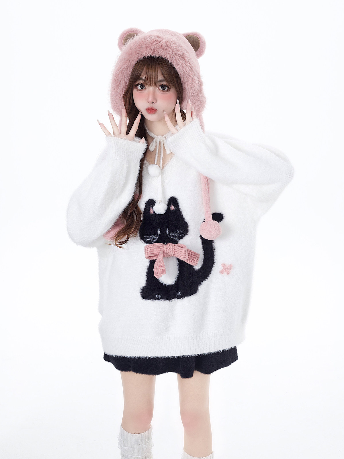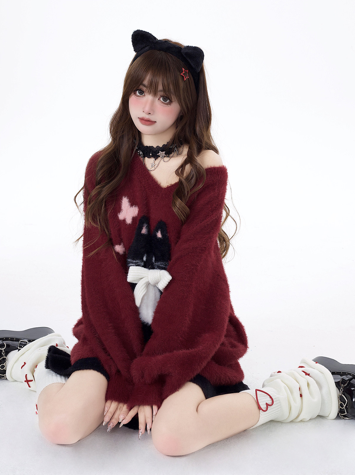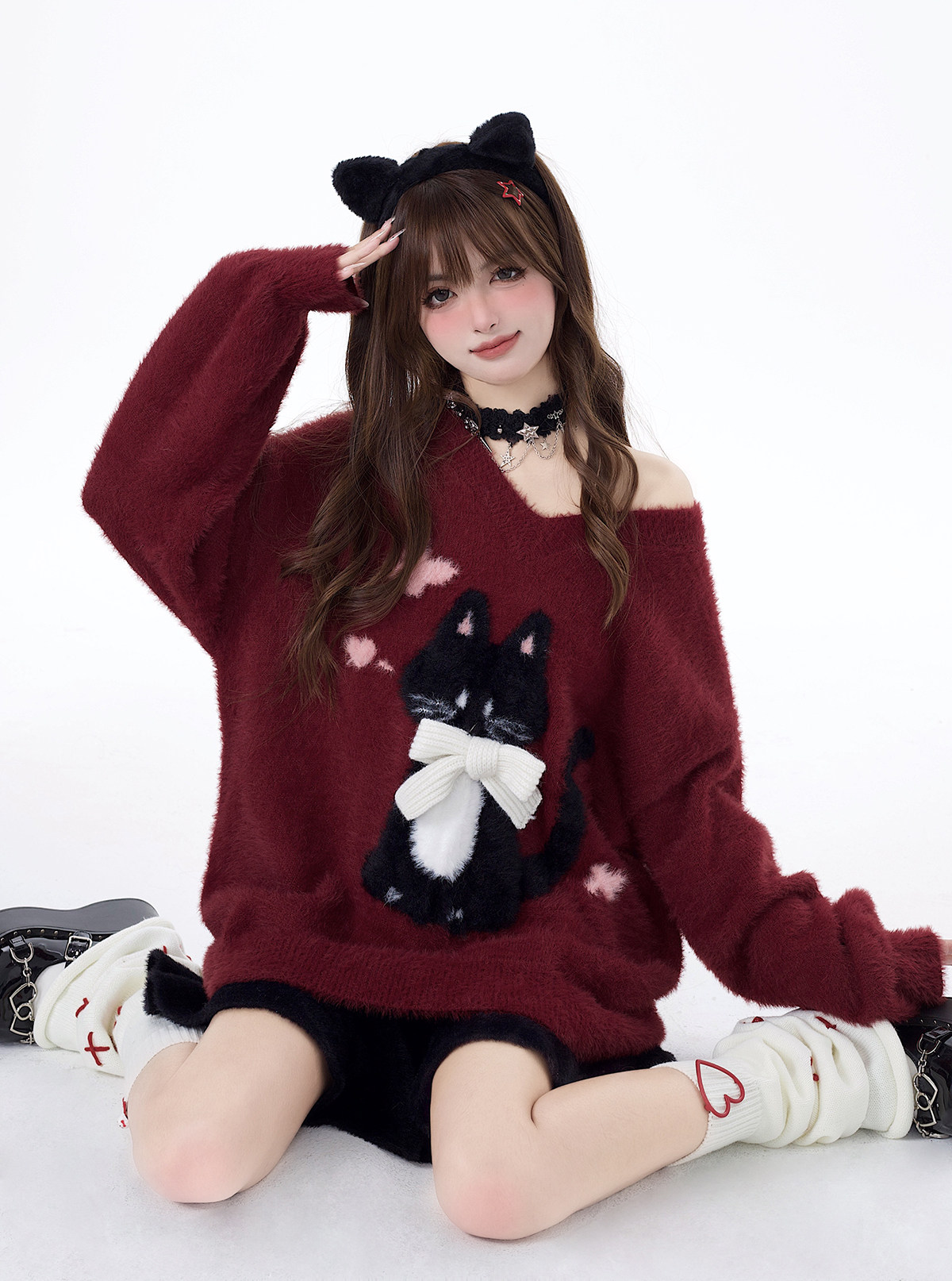 crazygirl【慵嬾小貓】原創蝴蝶結軟糯秋冬新年紅寬鬆內搭毛衣