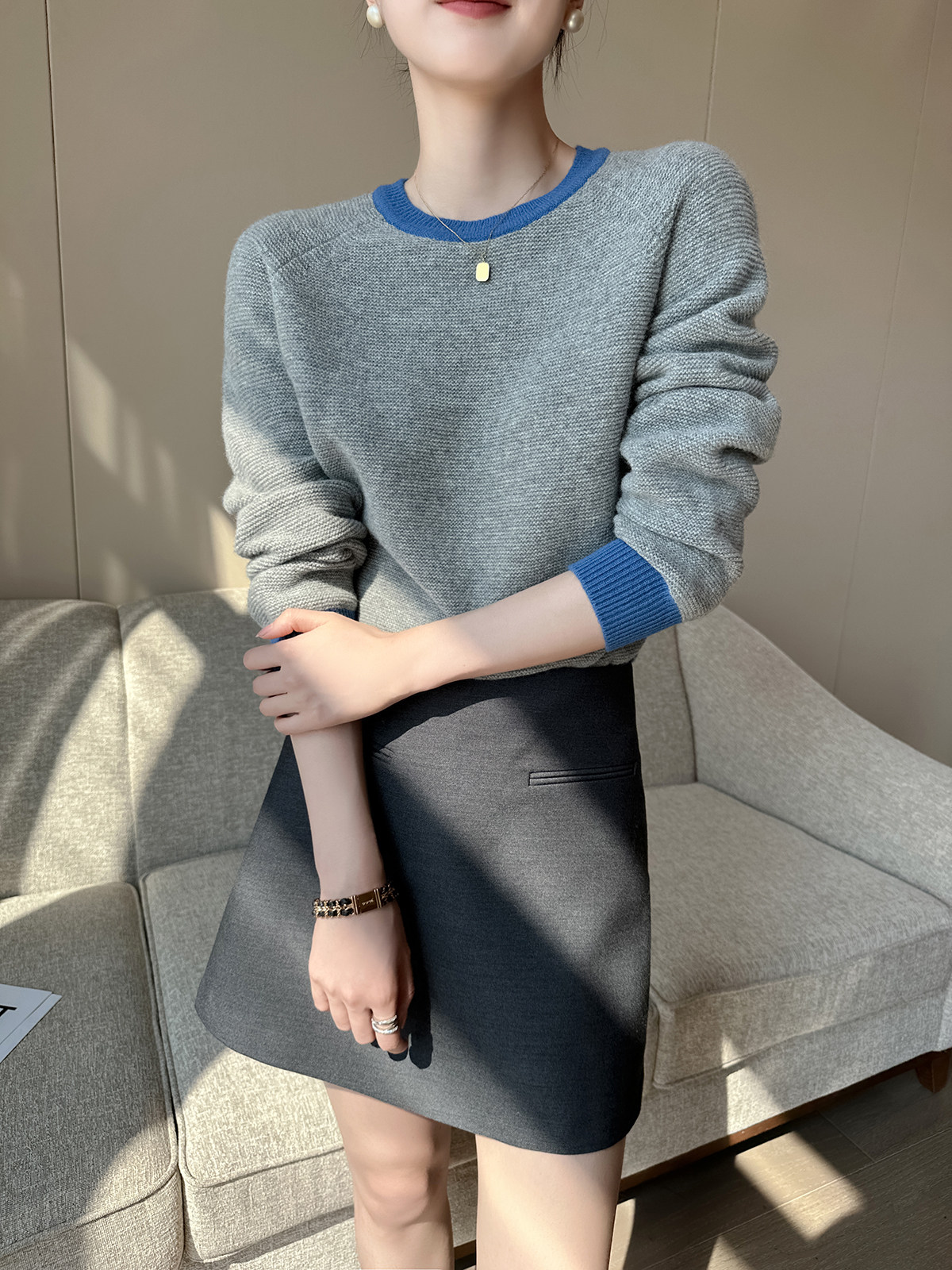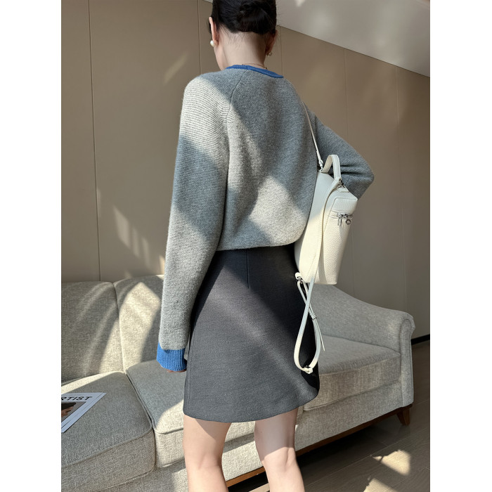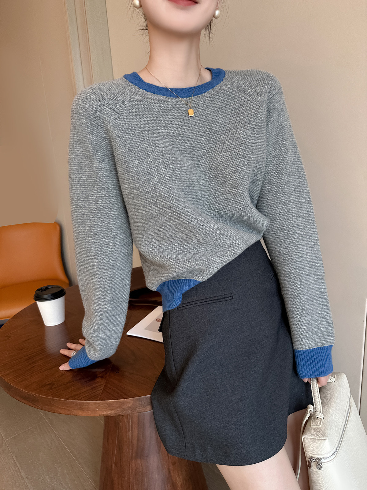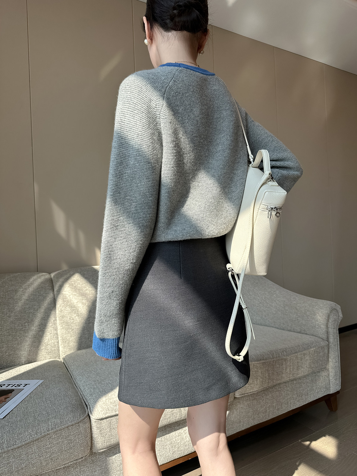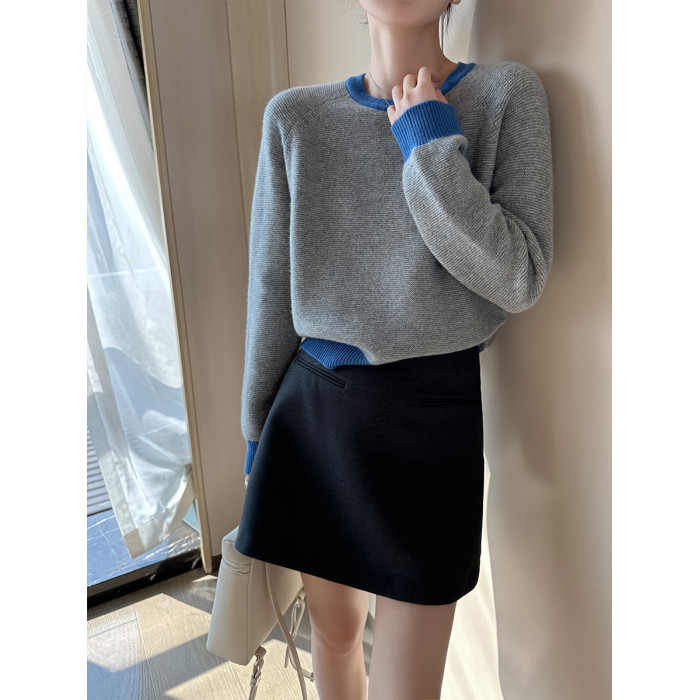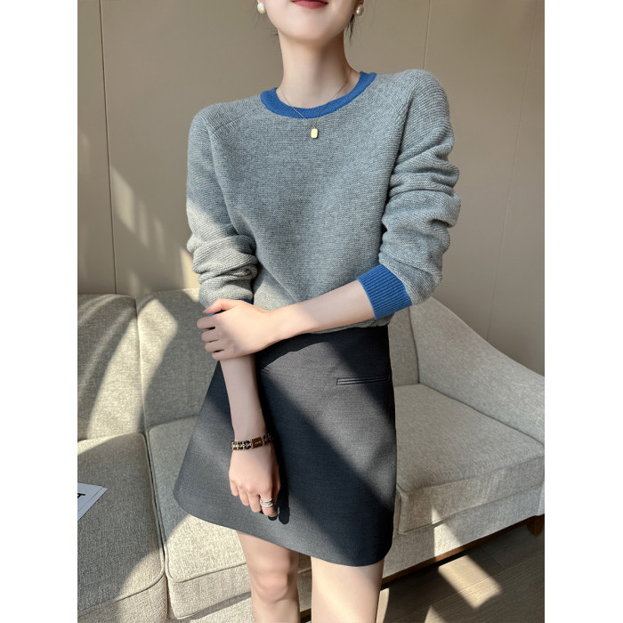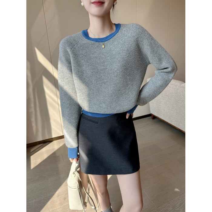 PINKEEN灰撞色圓領長袖針織衫女秋季2025新減齡舒適顯瘦套頭毛衣