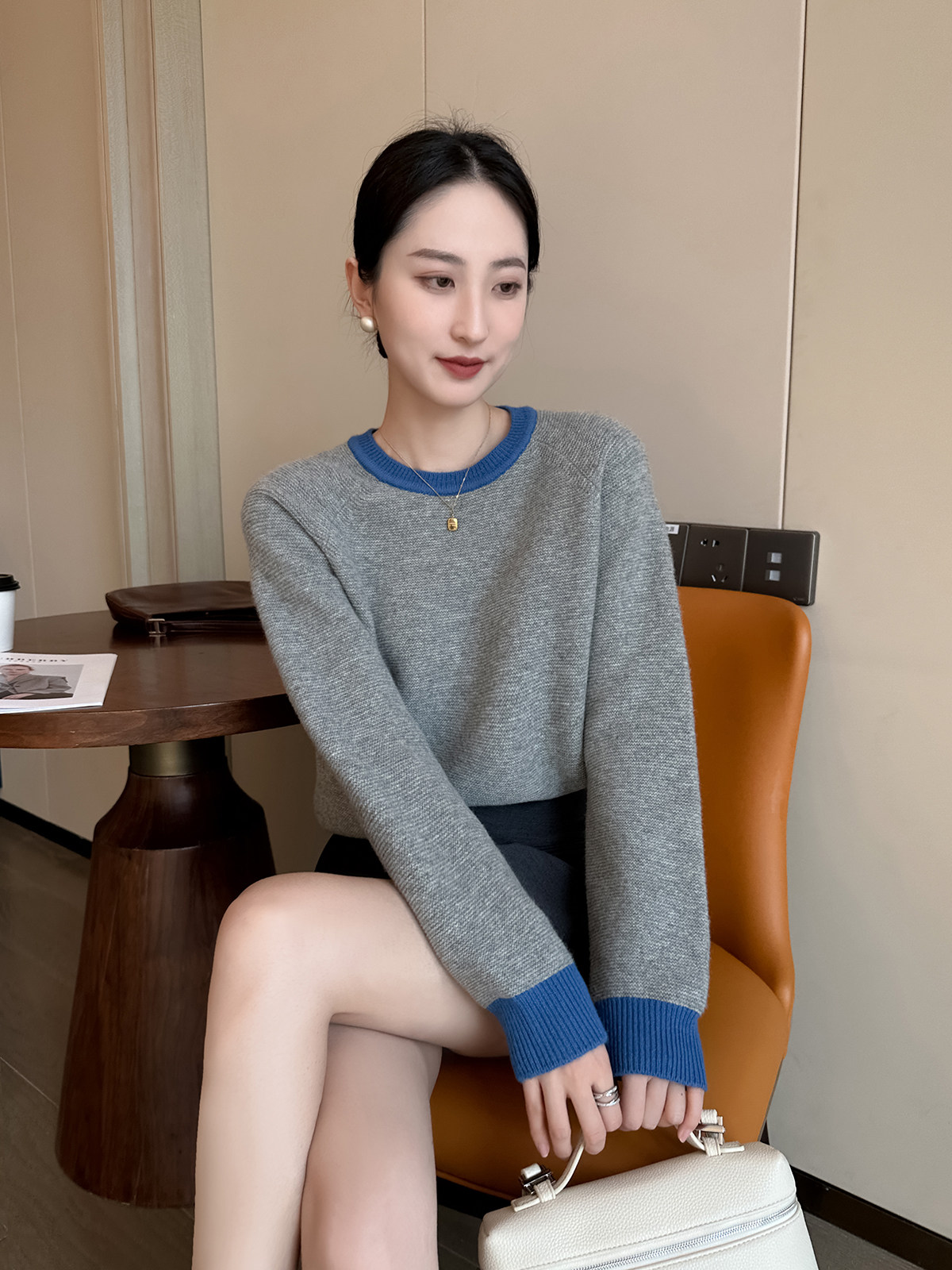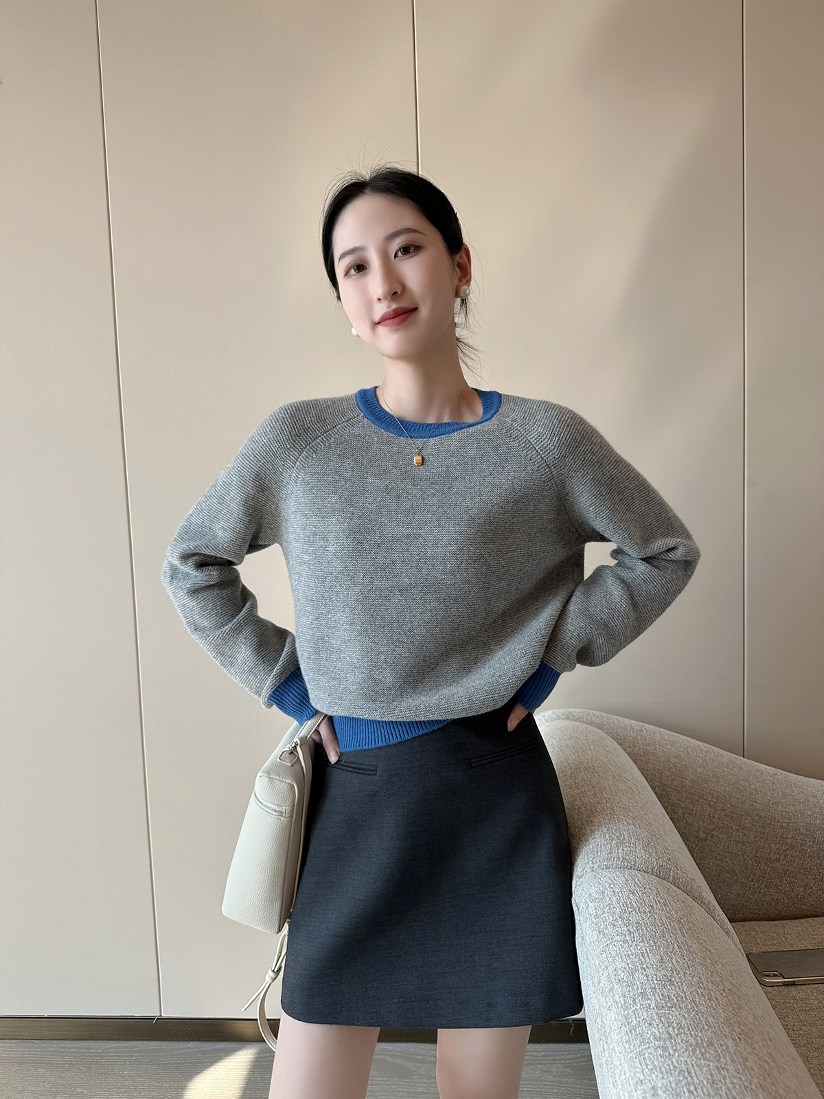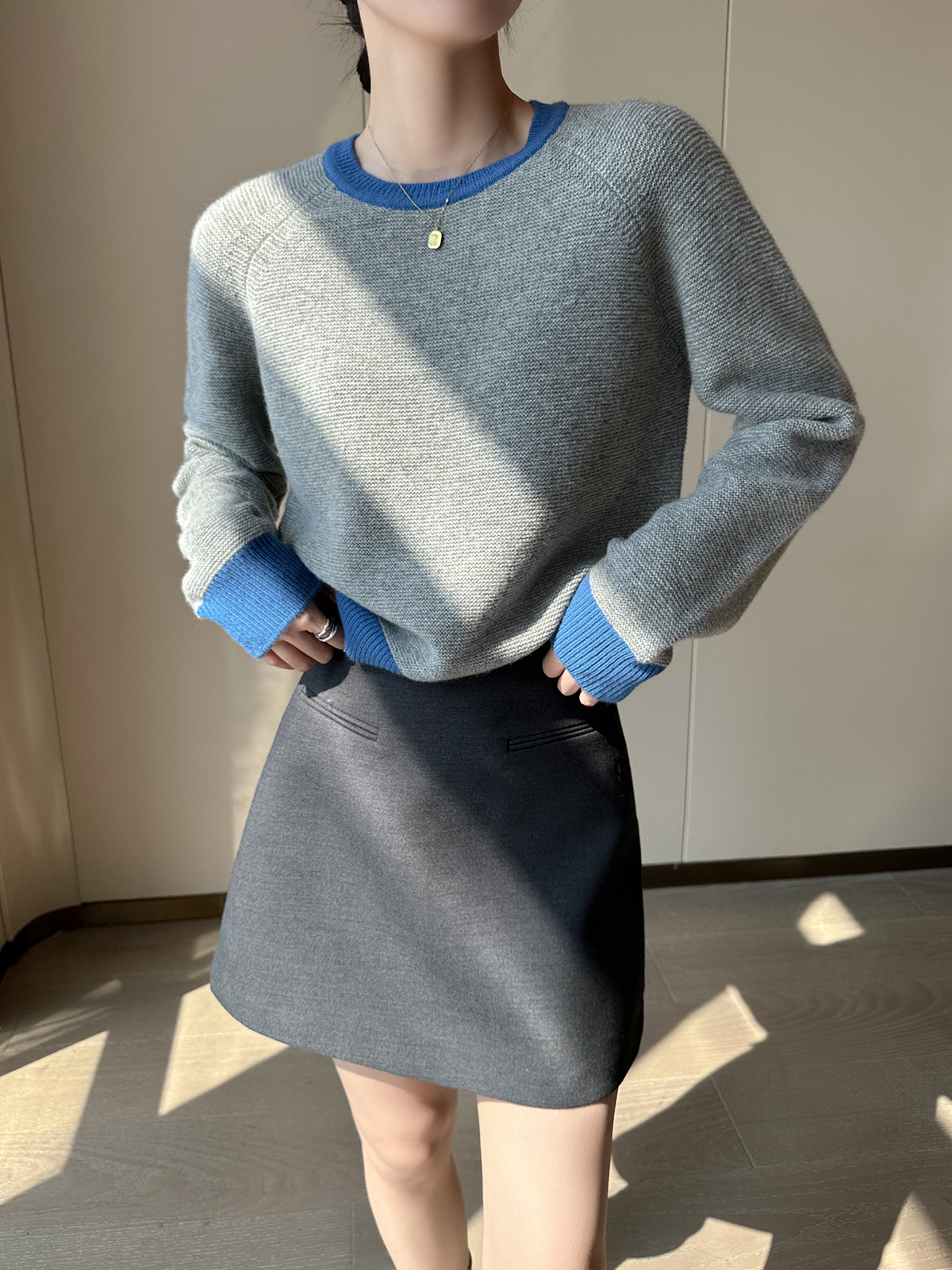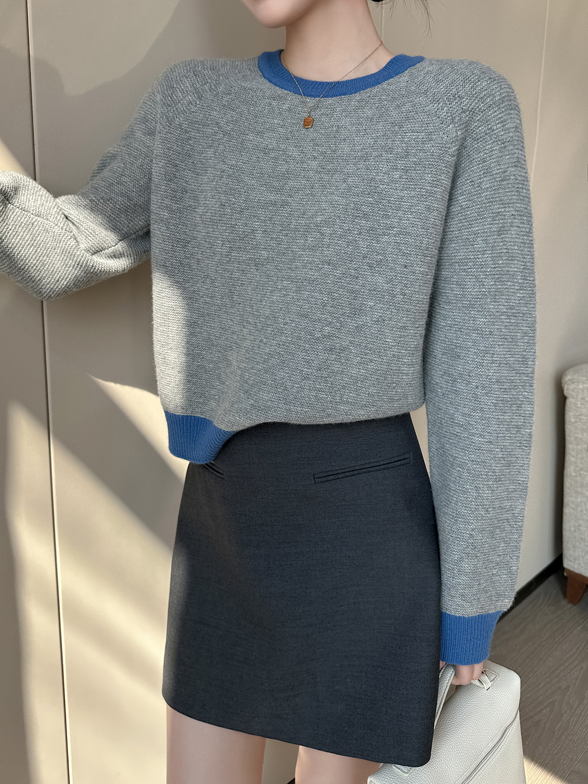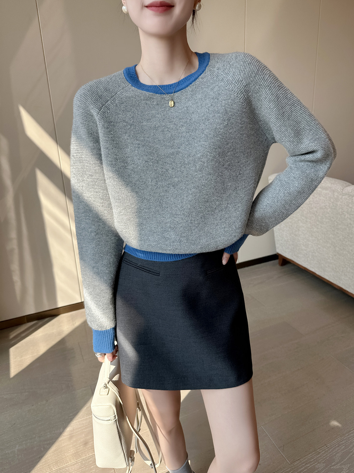 PINKEEN灰撞色圓領長袖針織衫女秋季2025新減齡舒適顯瘦套頭毛衣
