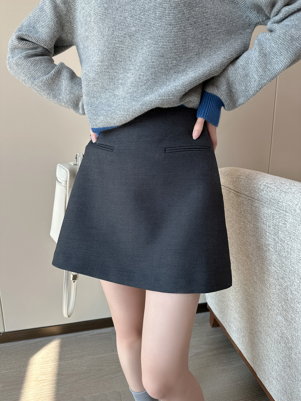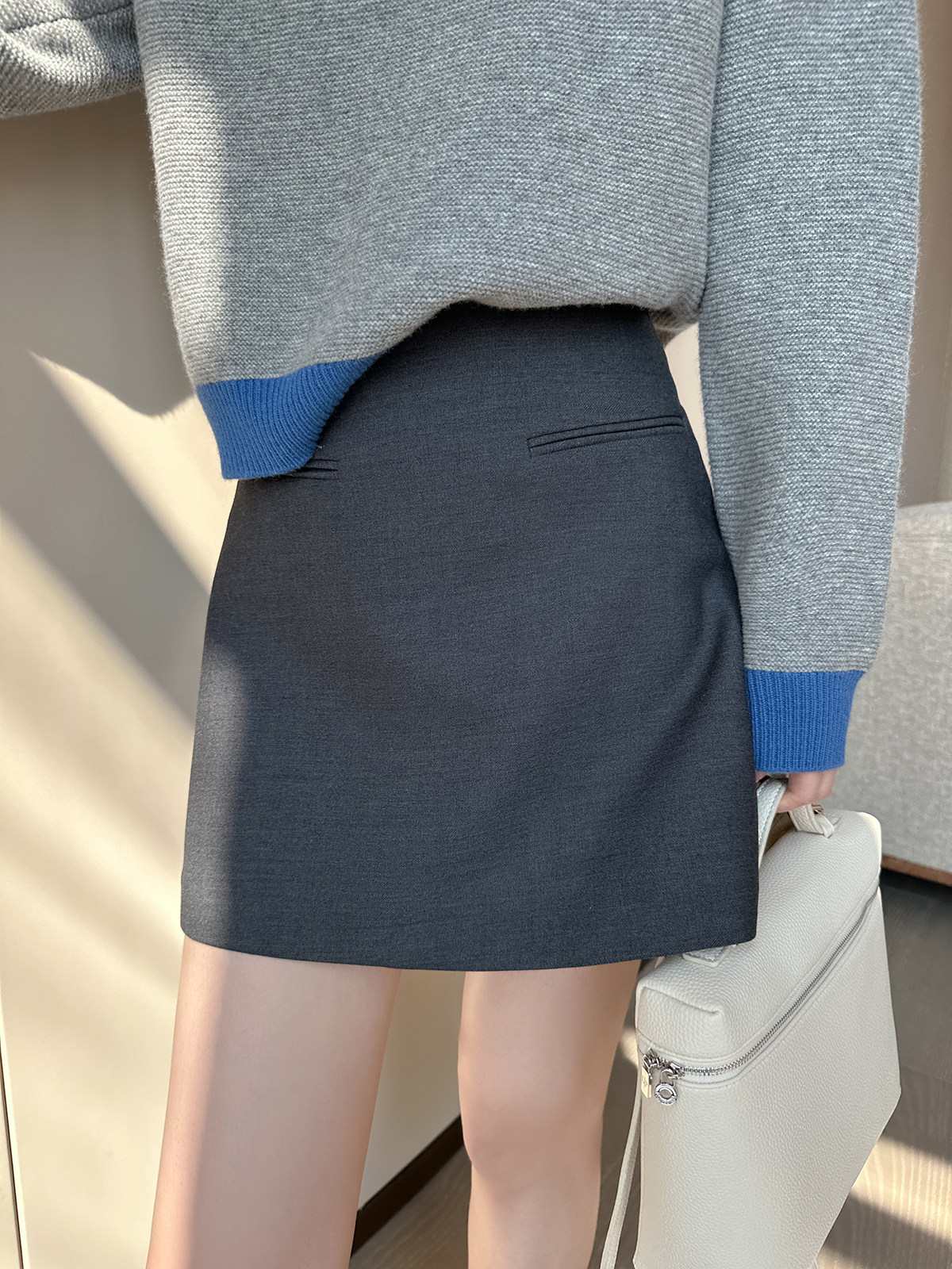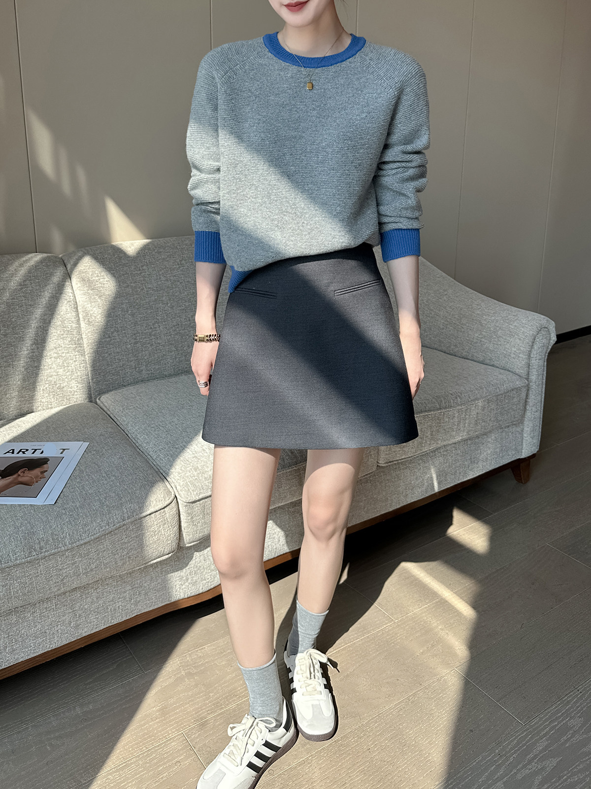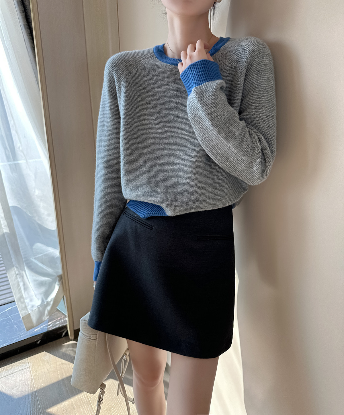 PINKEEN灰撞色圓領長袖針織衫女秋季2025新減齡舒適顯瘦套頭毛衣