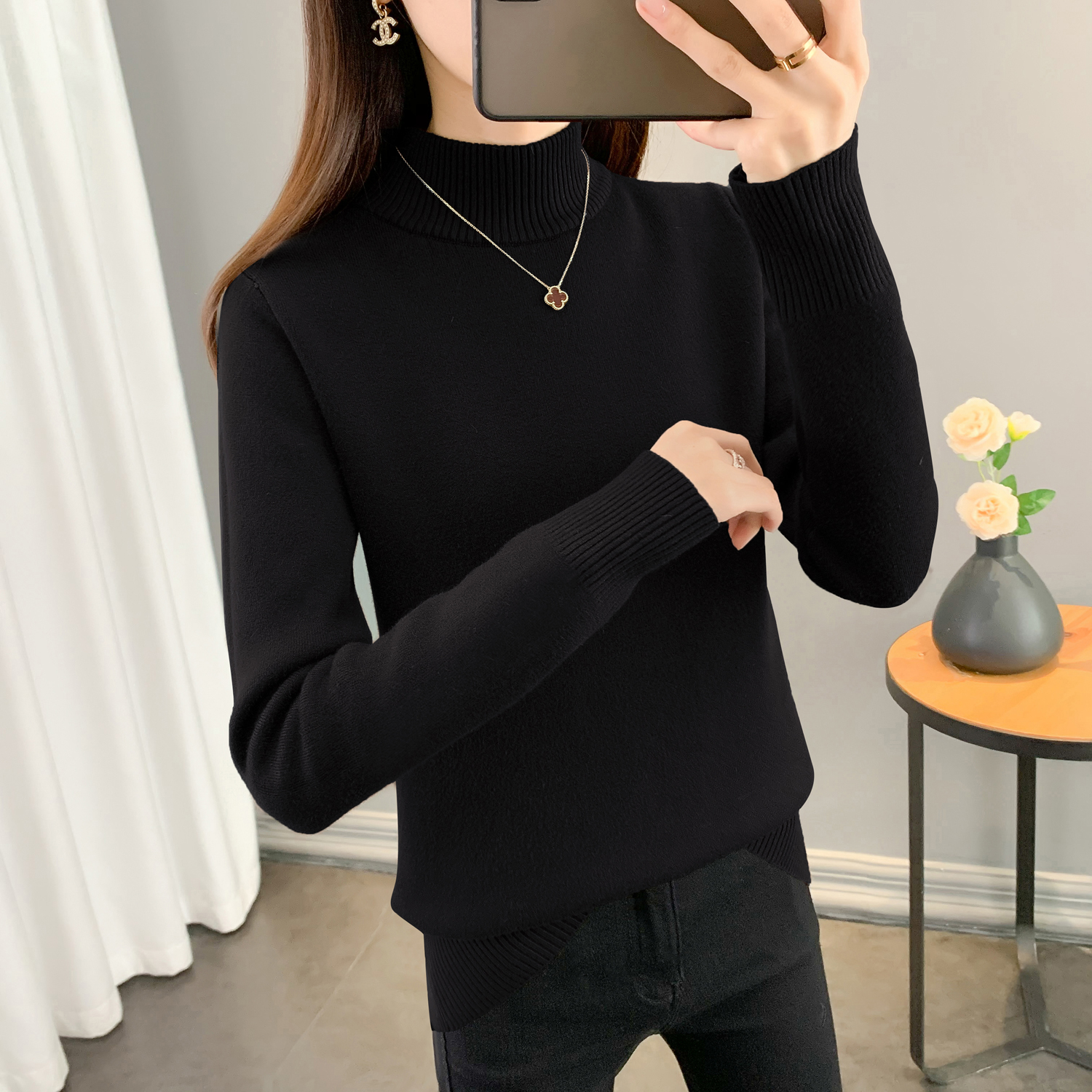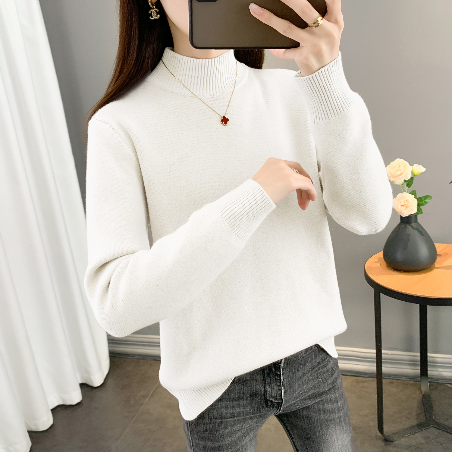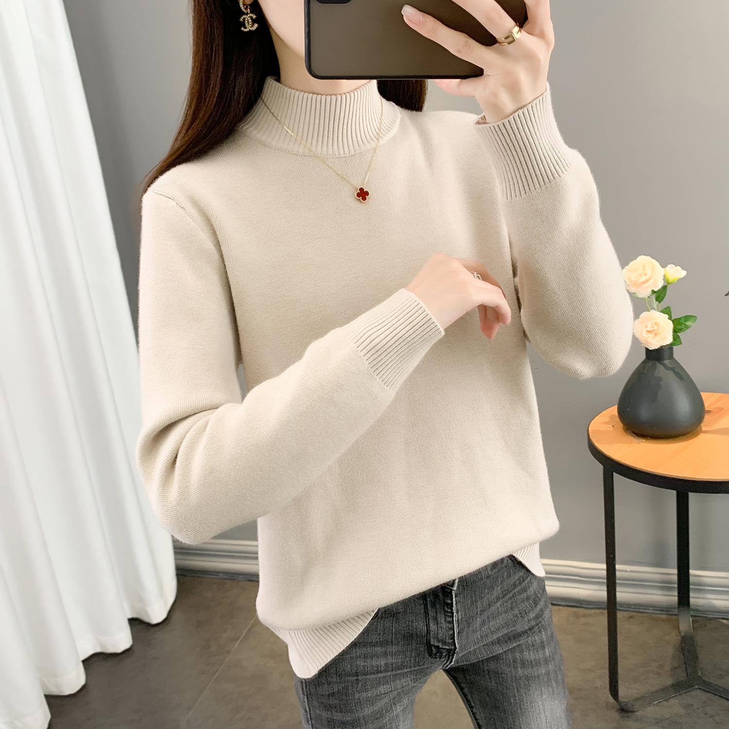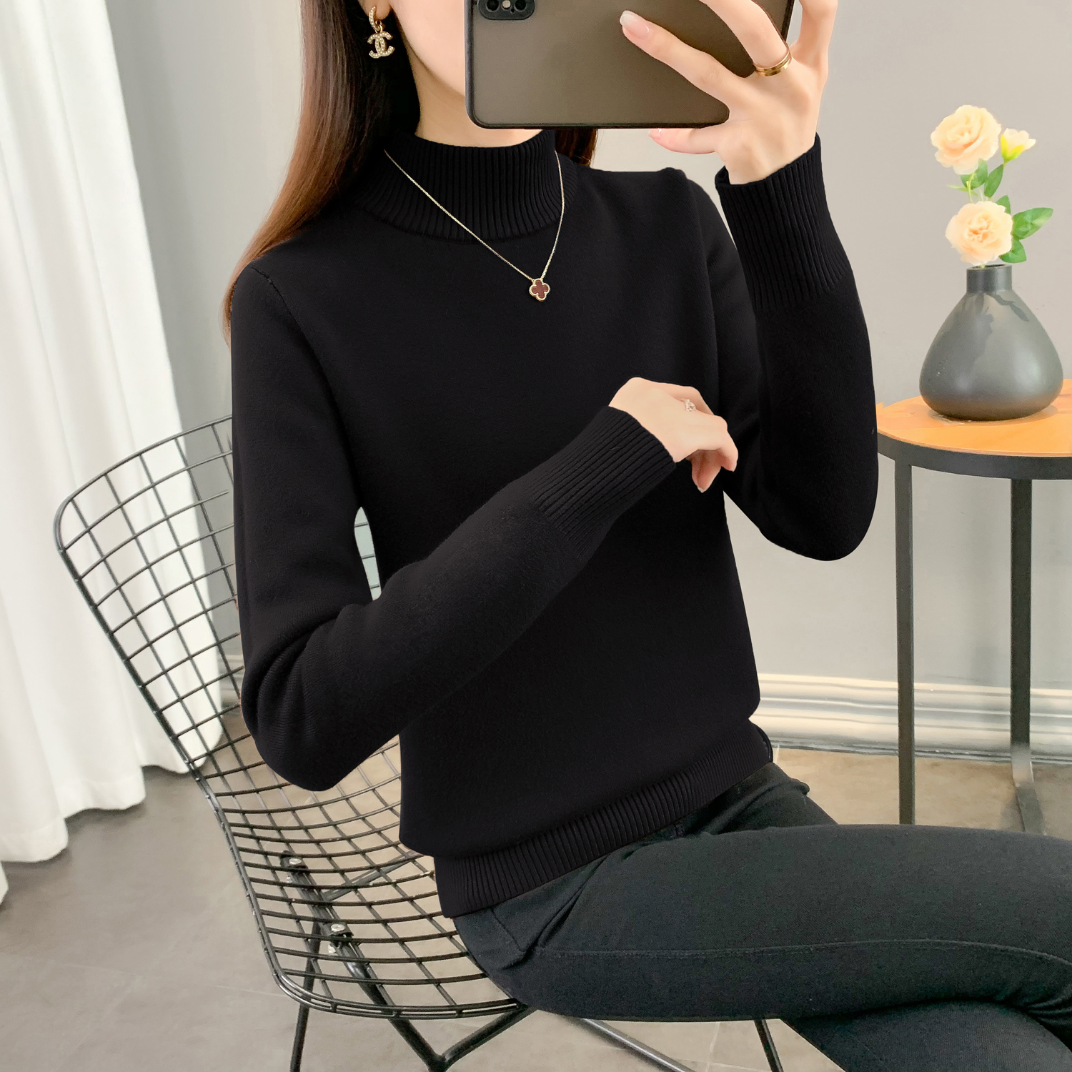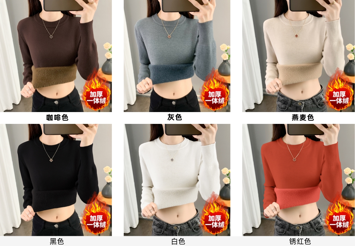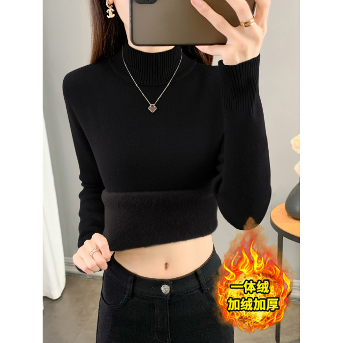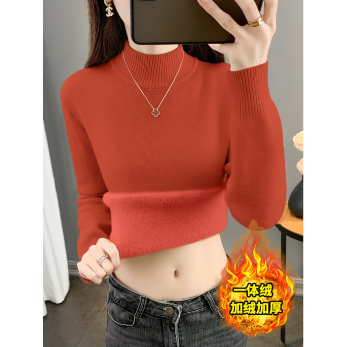 半高領加絨毛衣女加厚一體絨修身內搭秋冬大碼中領保暖針織打底衫