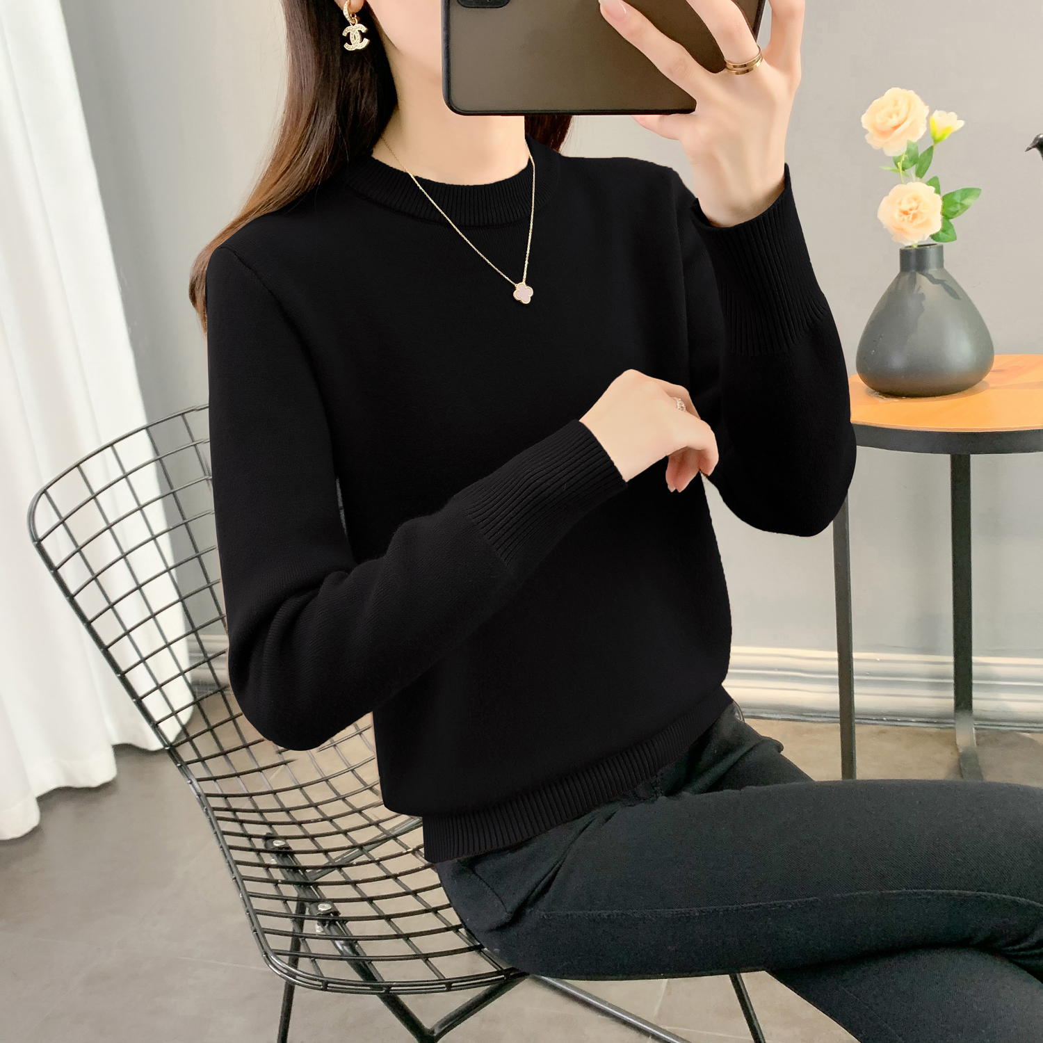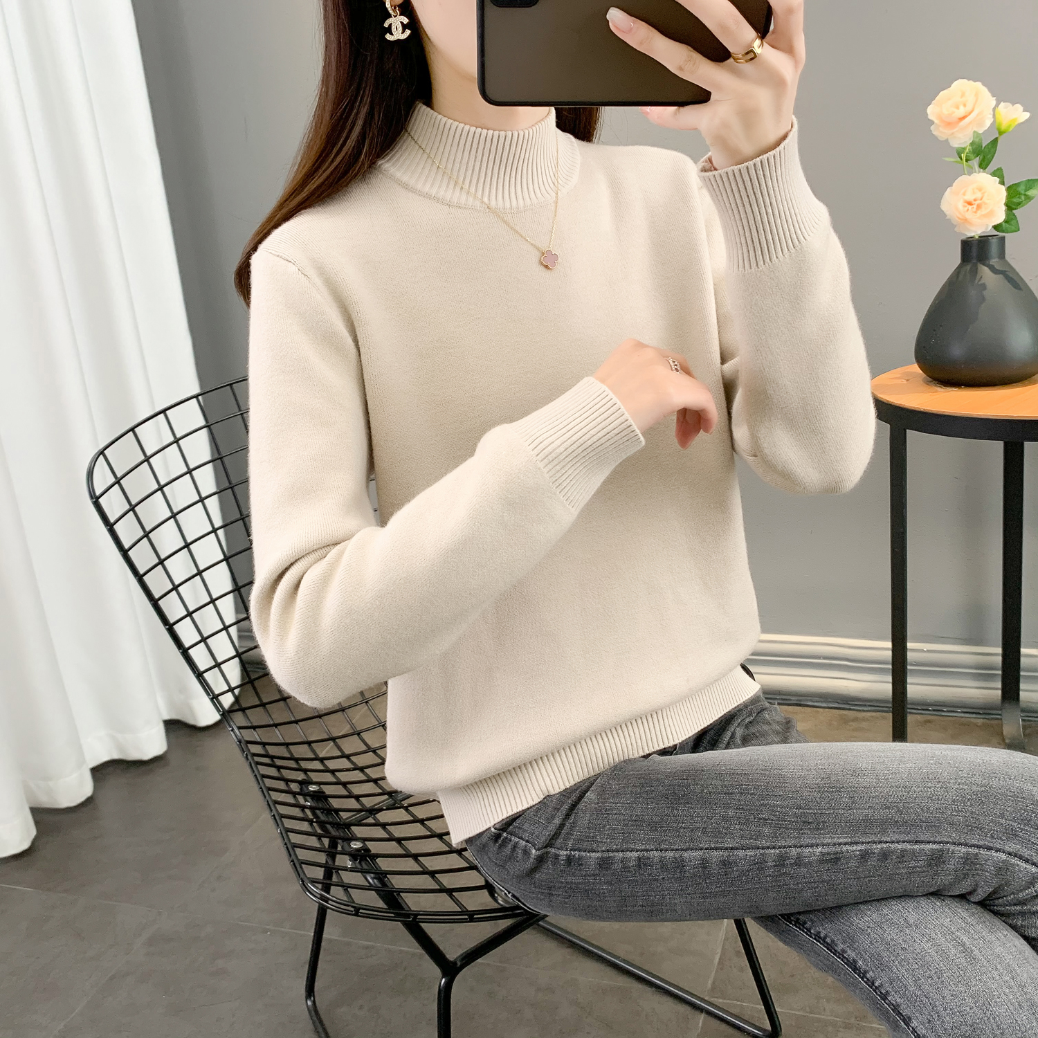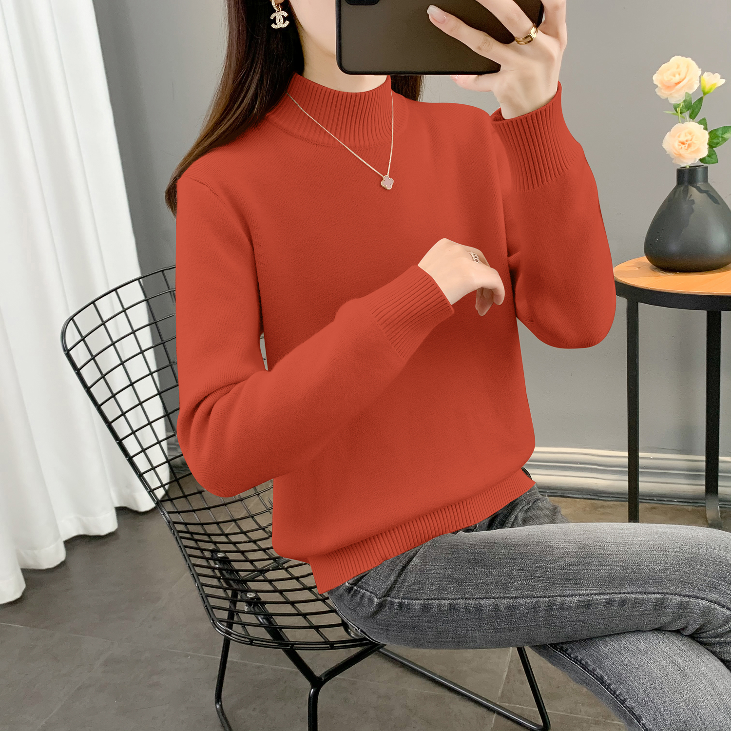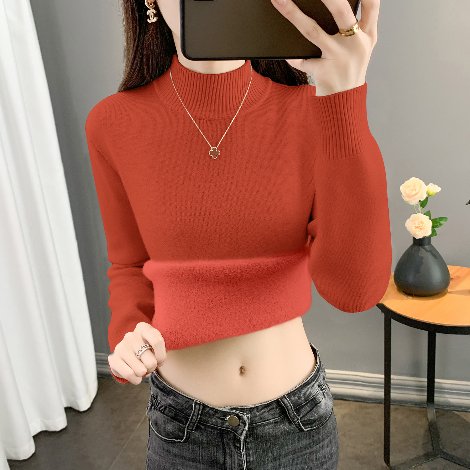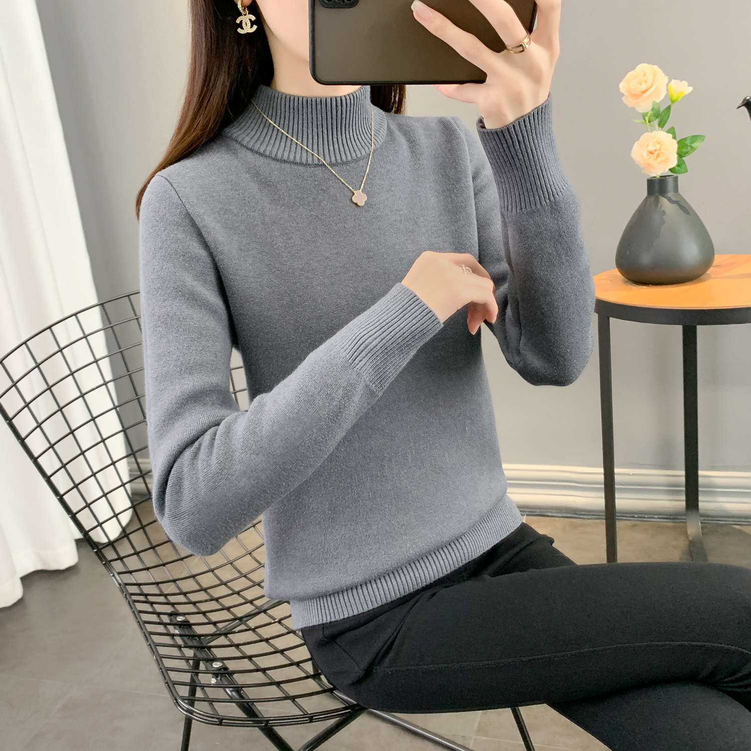 半高領加絨毛衣女加厚一體絨修身內搭秋冬大碼中領保暖針織打底衫