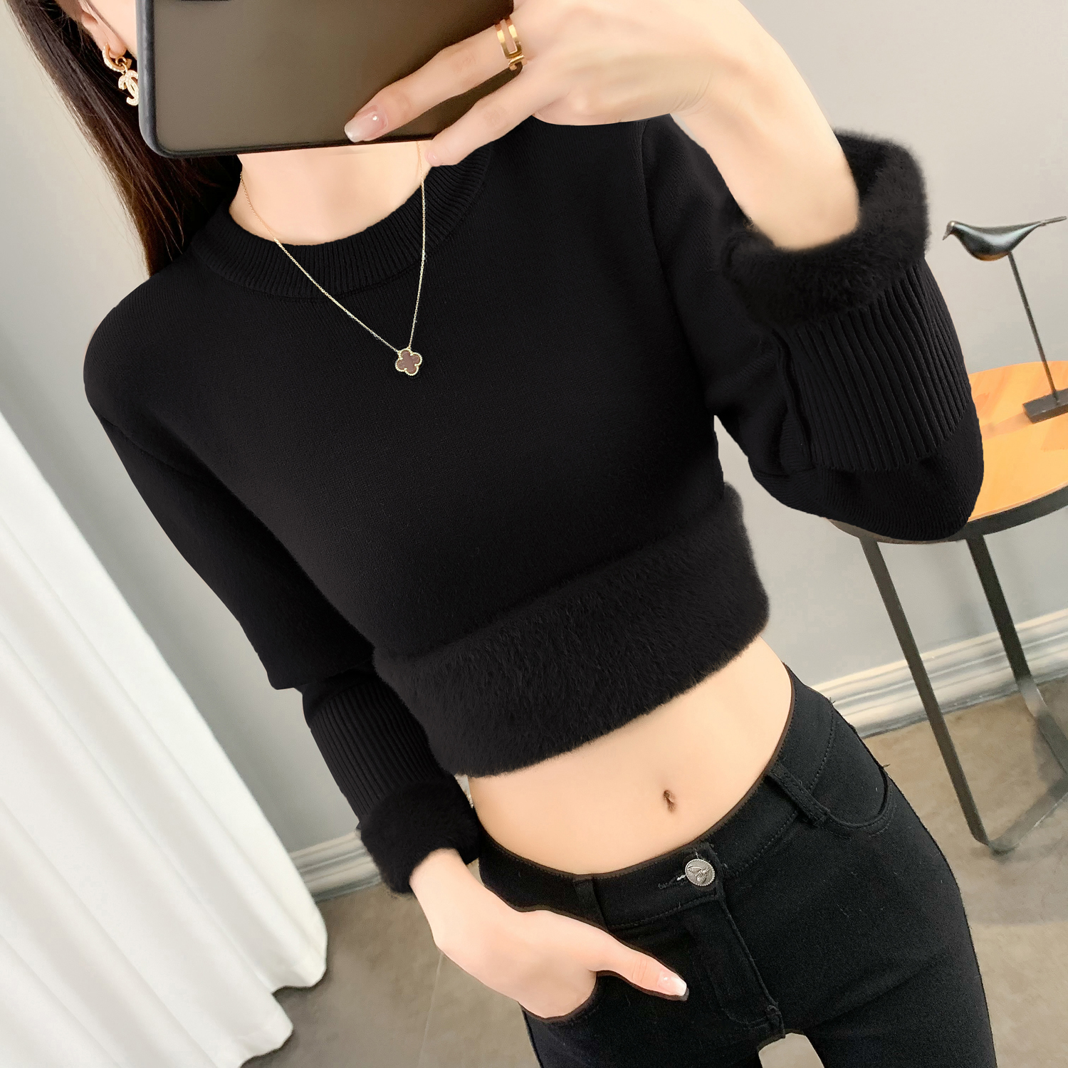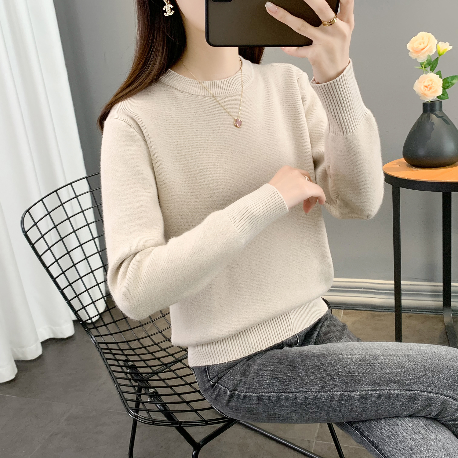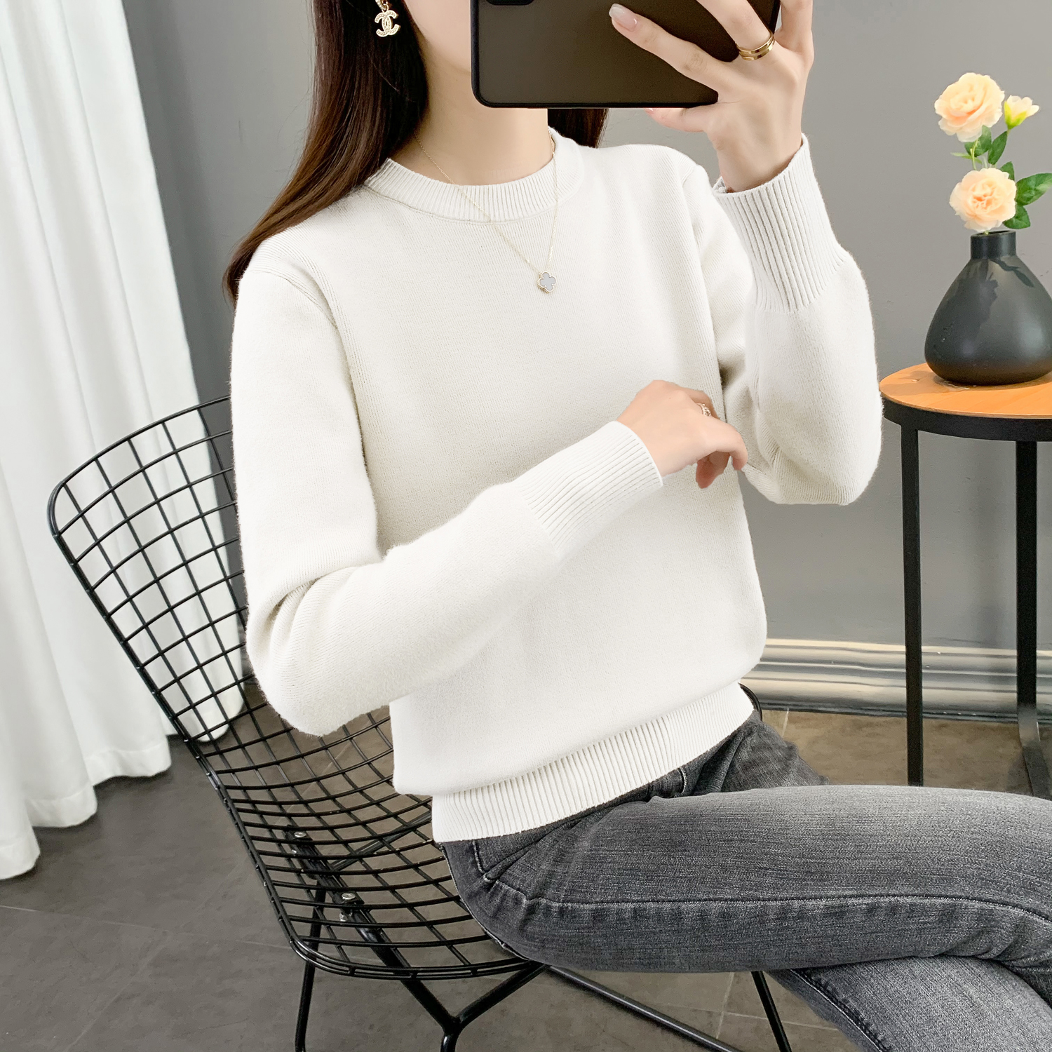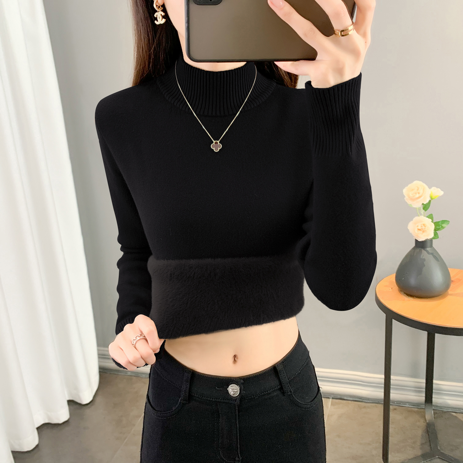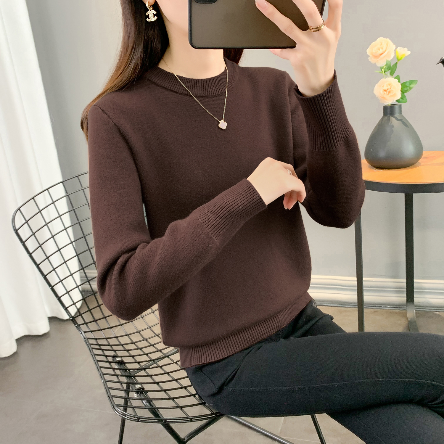 半高領加絨毛衣女加厚一體絨修身內搭秋冬大碼中領保暖針織打底衫