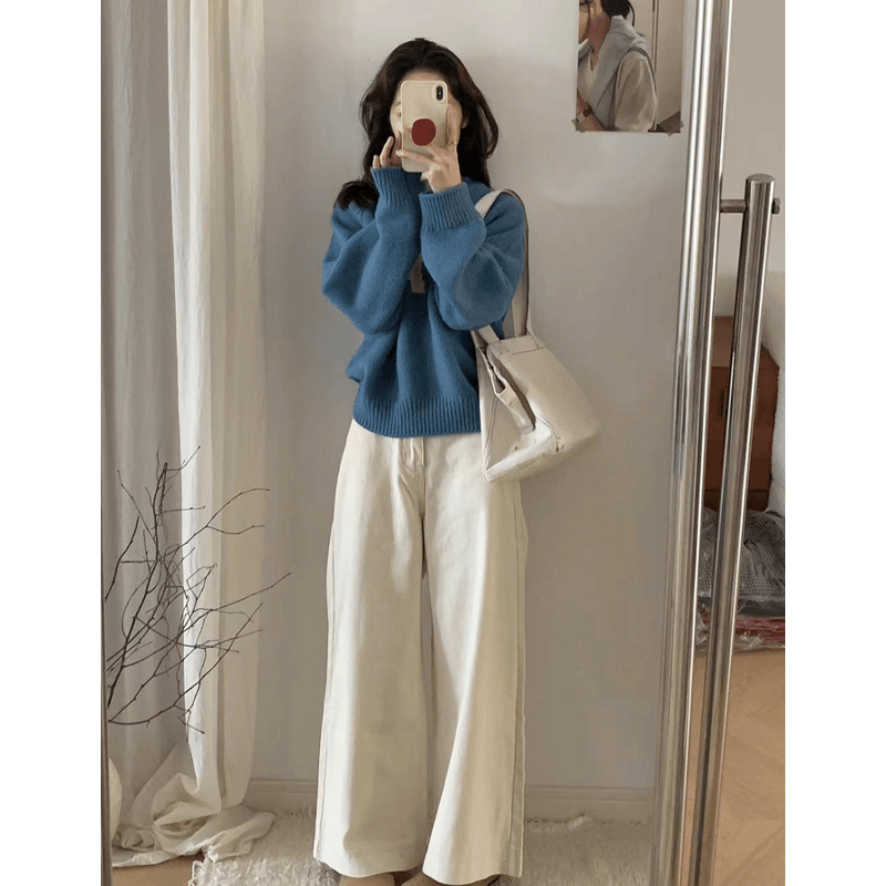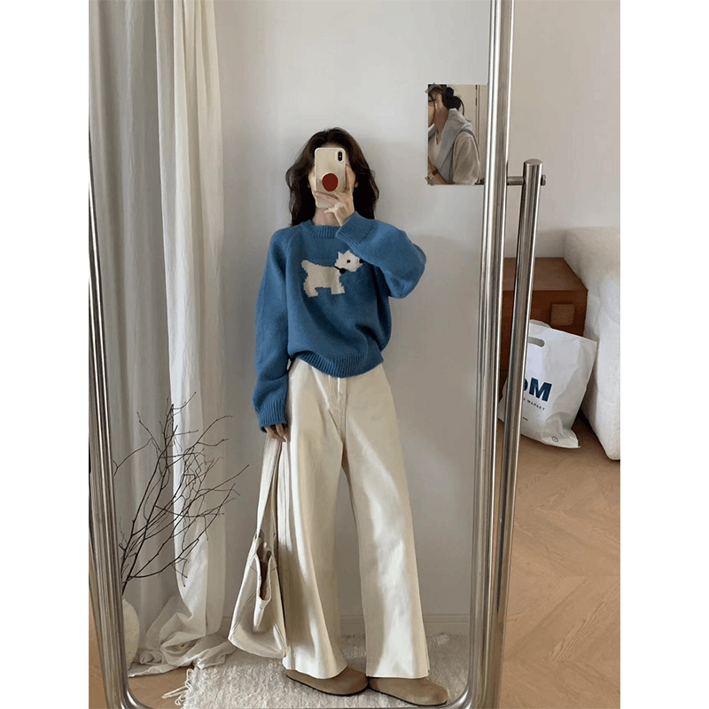 藍色圓領套頭軟糯卡通小狗毛衣女秋冬季加厚寬松慵懶風針織衫上衣