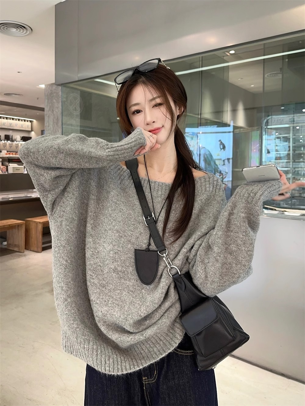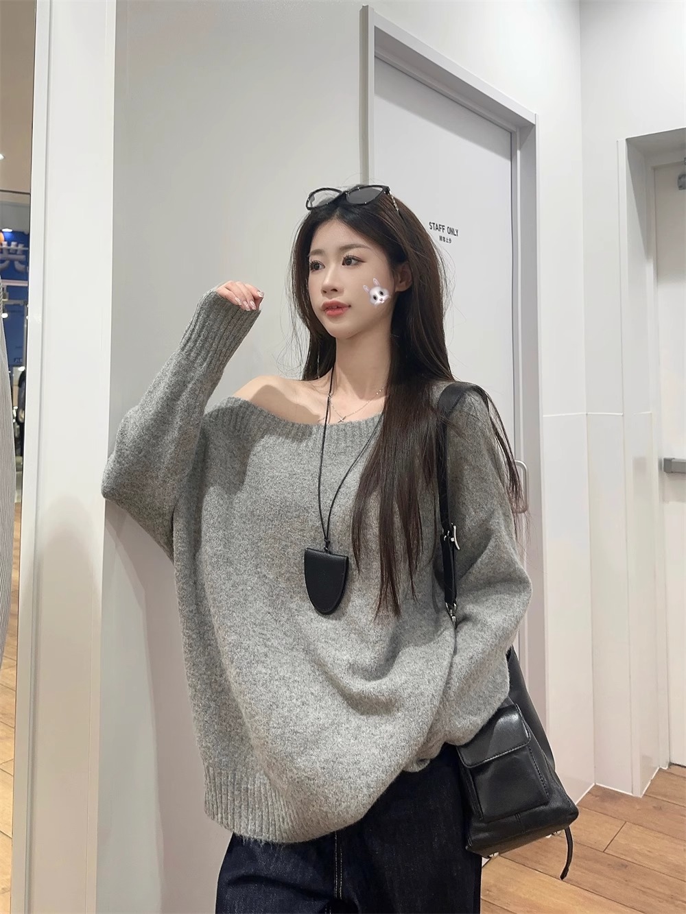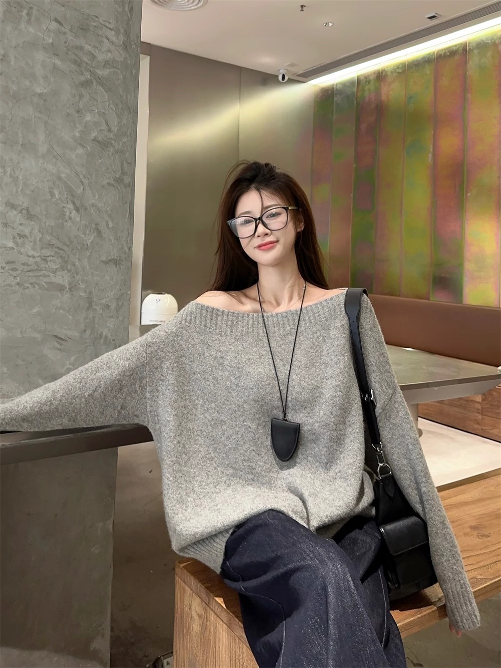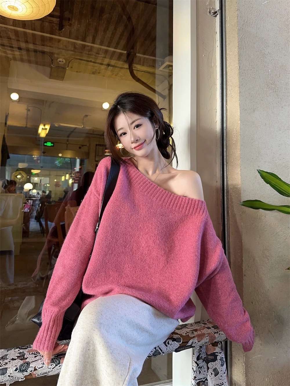 韓系慵懶風露肩套頭毛衣女2024秋季新款寬松加厚長袖針織衫上衣潮