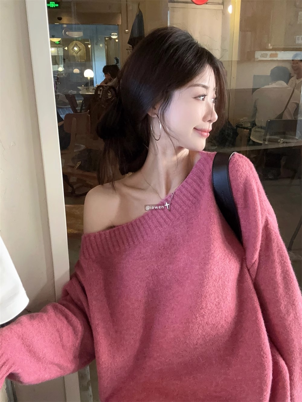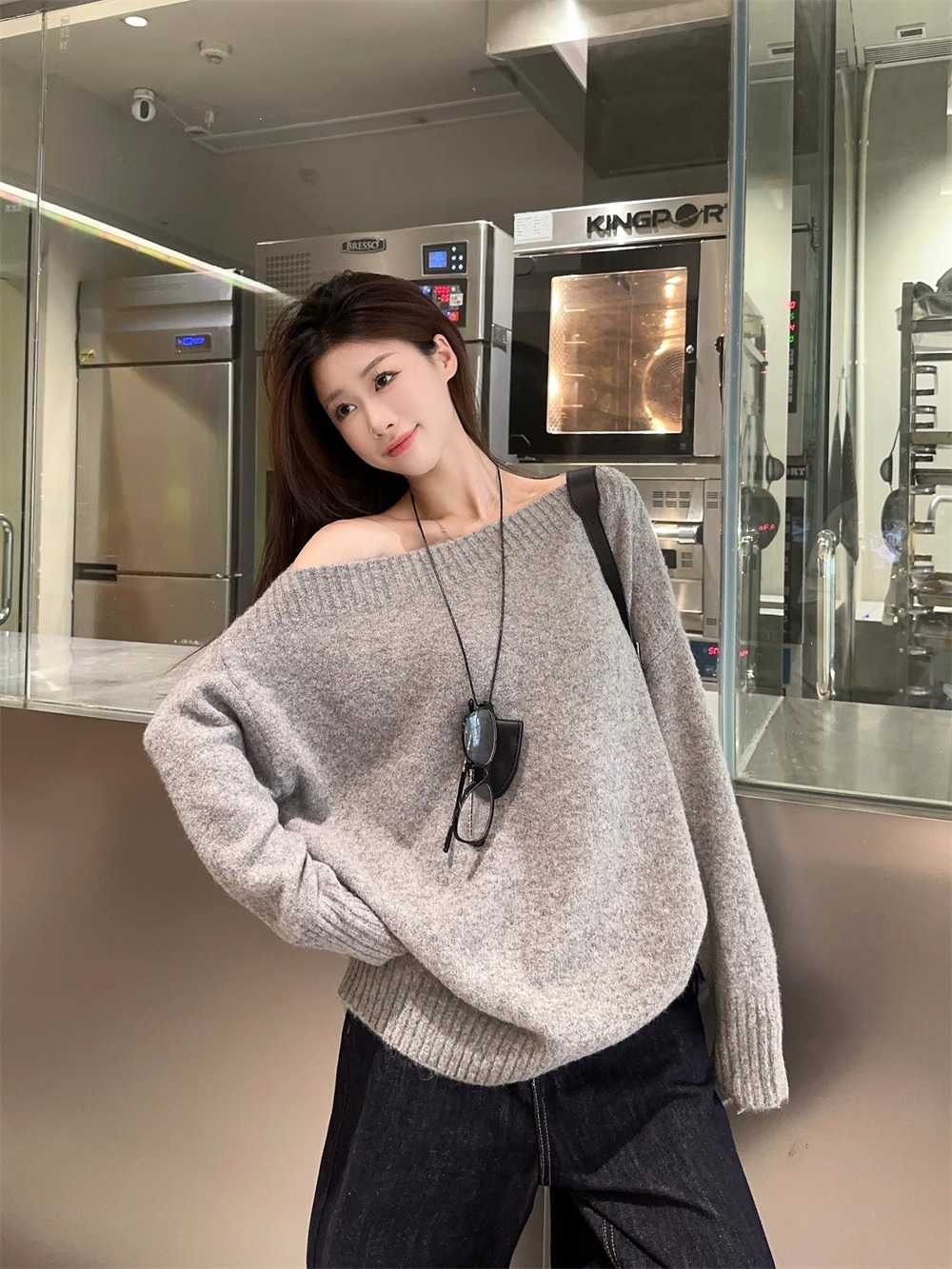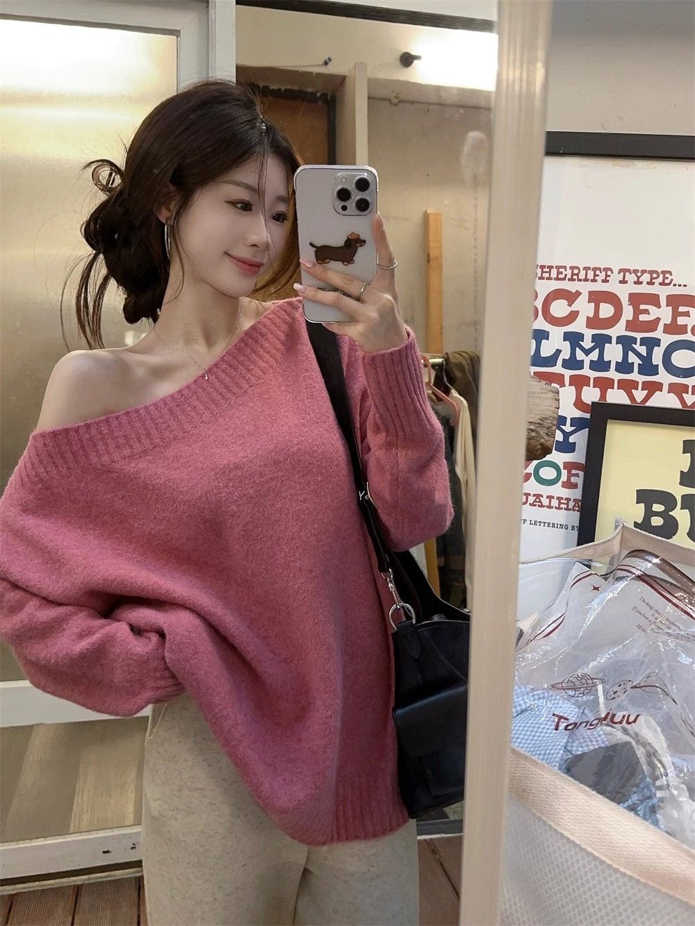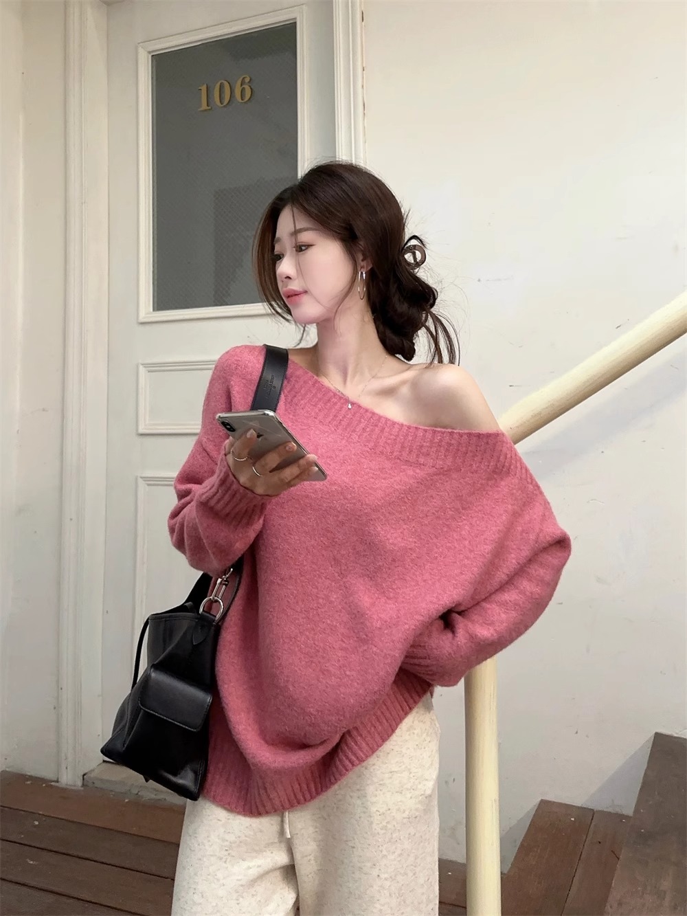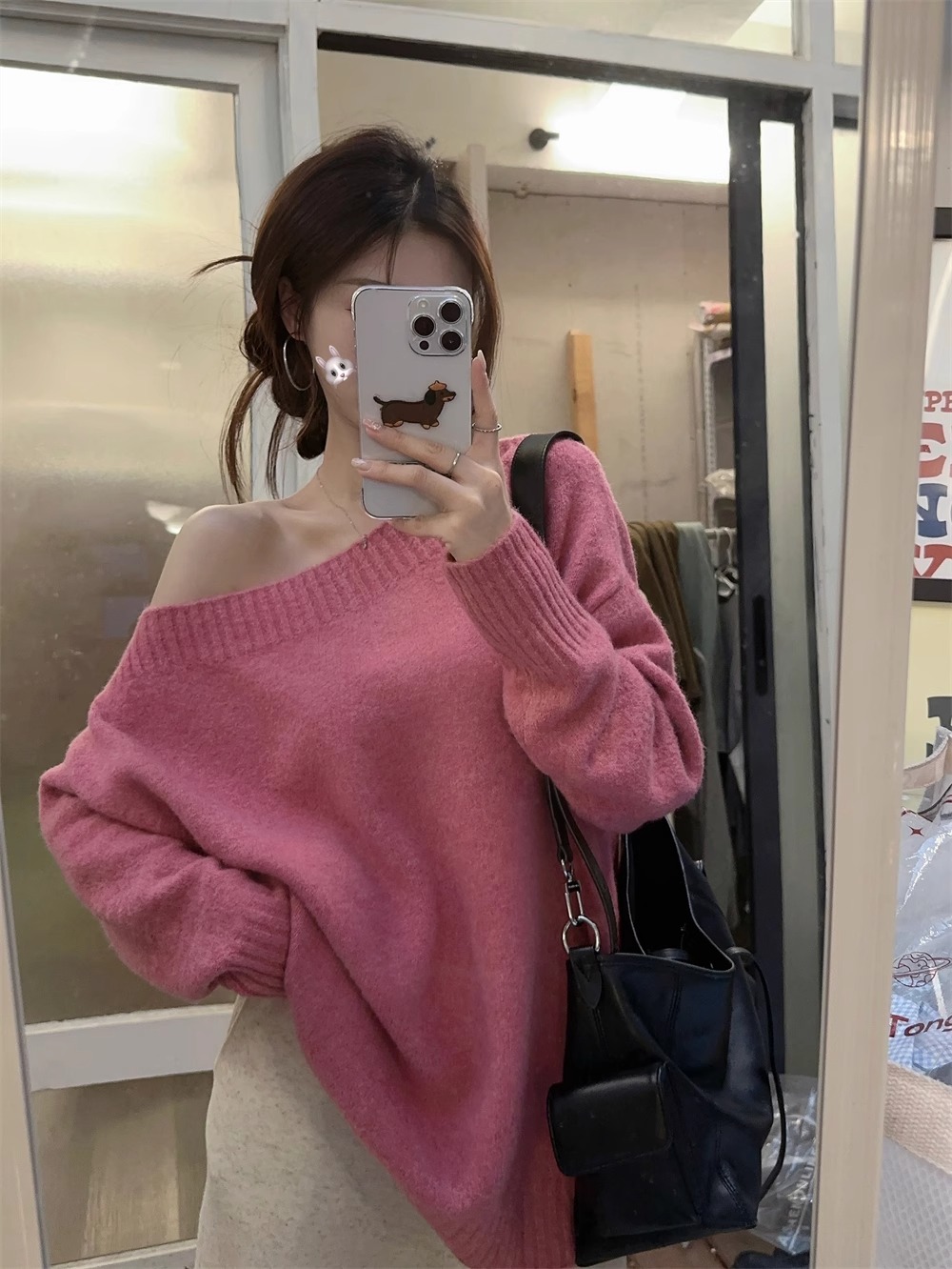 韓系慵懶風露肩套頭毛衣女2024秋季新款寬松加厚長袖針織衫上衣潮