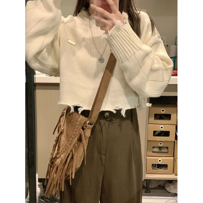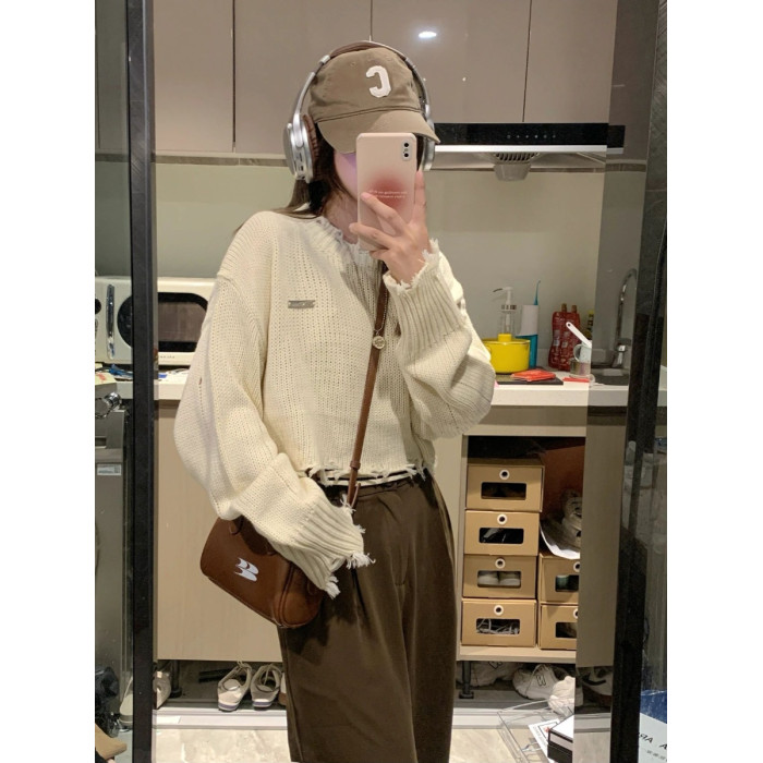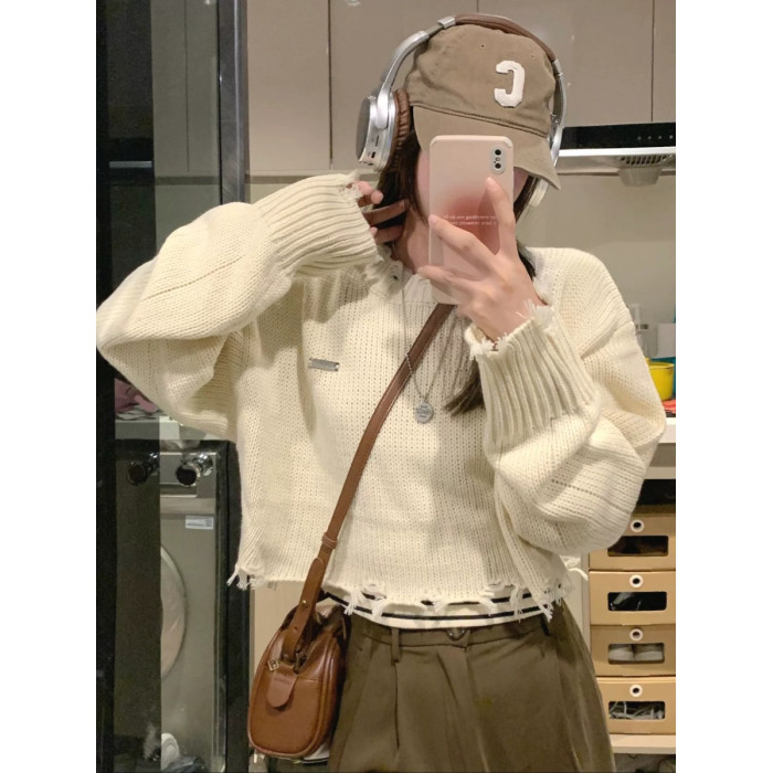 2025春秋新款辣妹破洞毛衣女大碼胖mm設計感外穿針織衫短款上衣冬