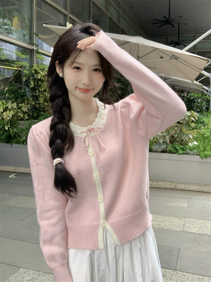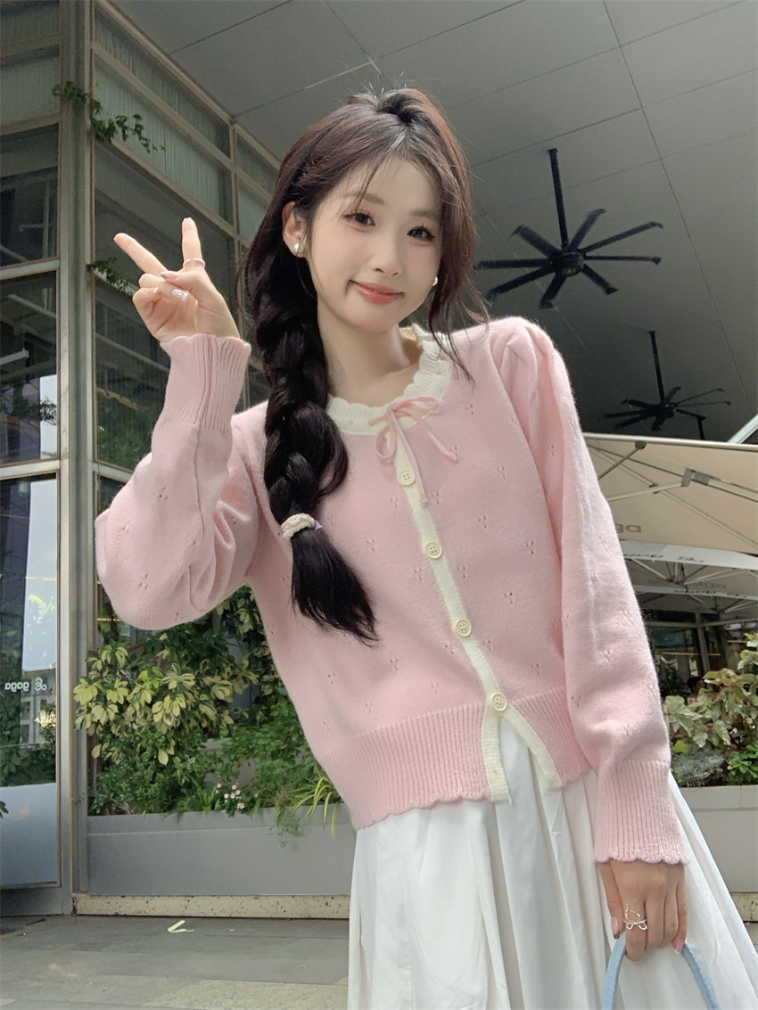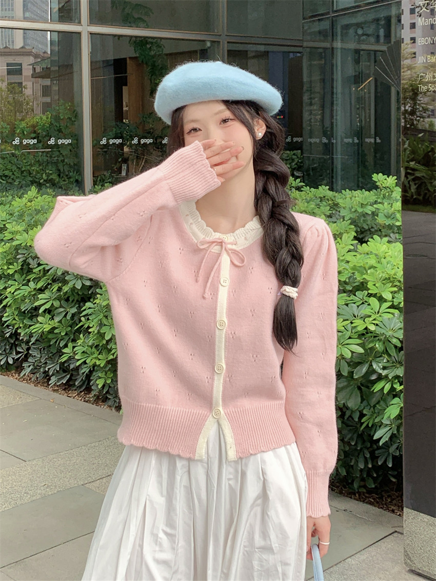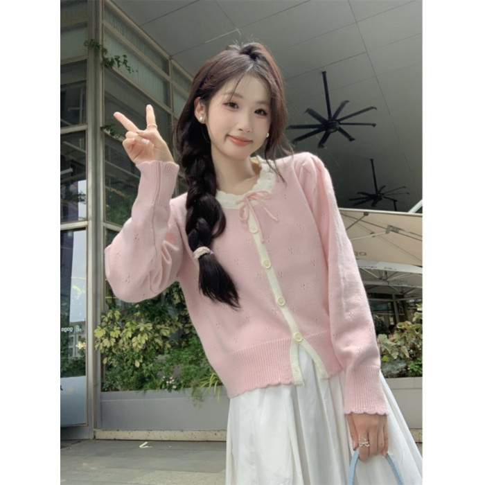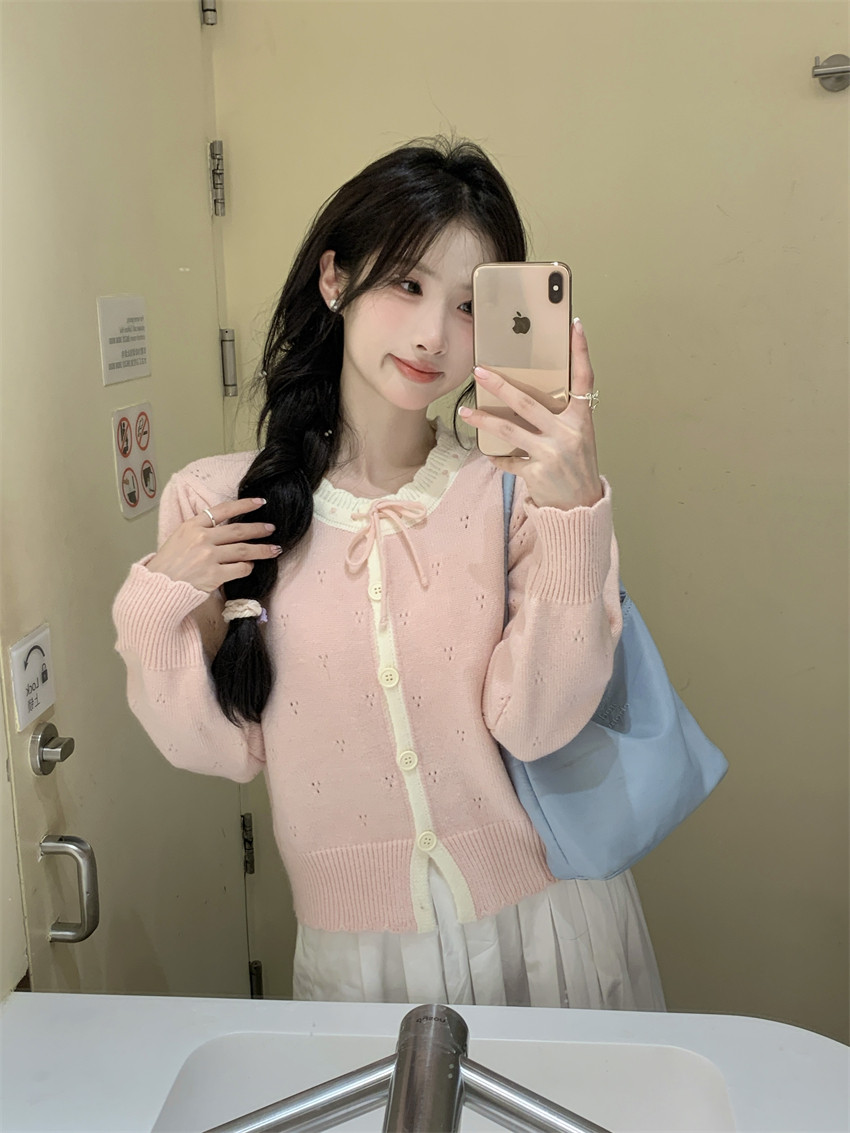 時尚溫柔粉色毛衣外套女秋季2025新款蝴蝶結寬鬆軟糯甜美針織開衫