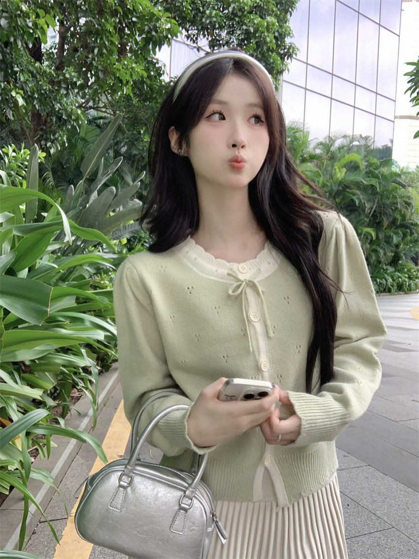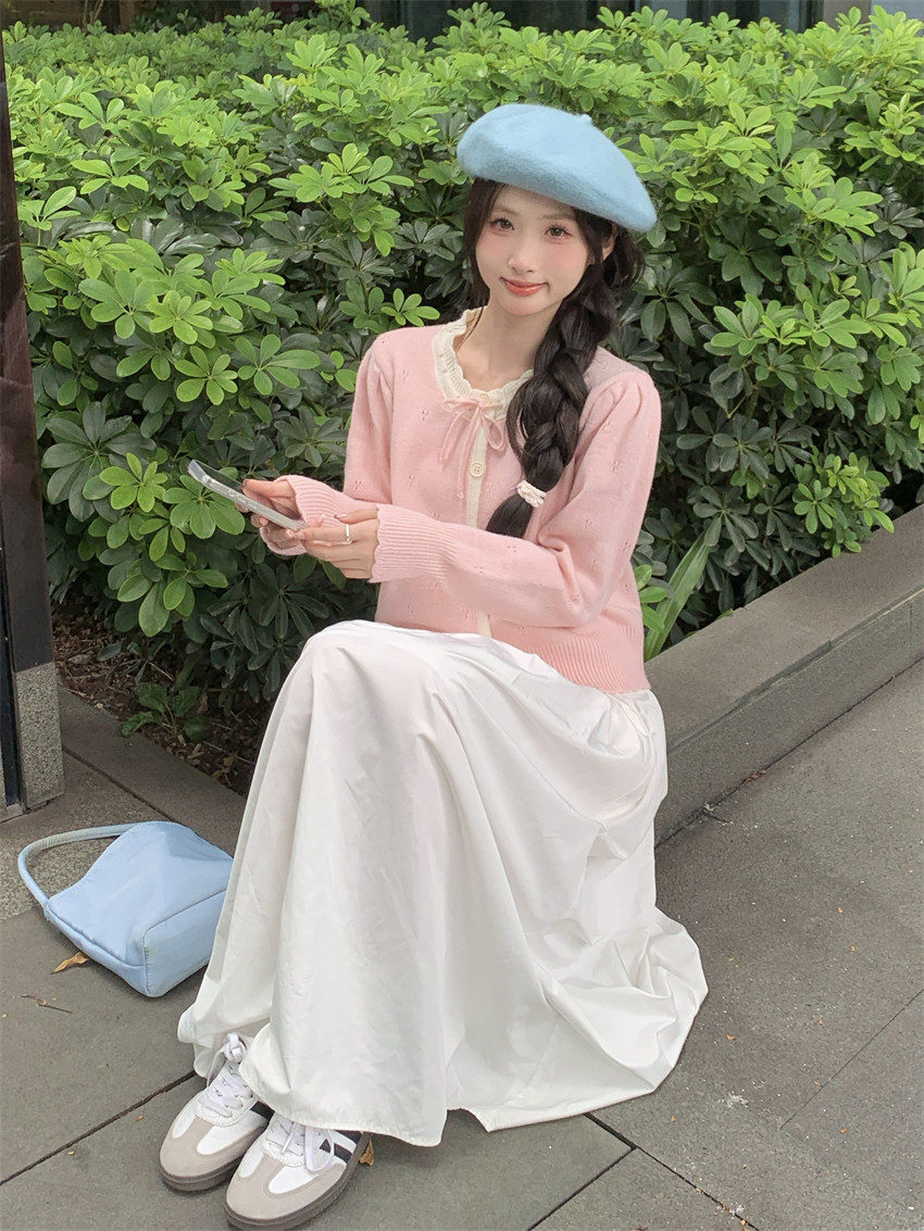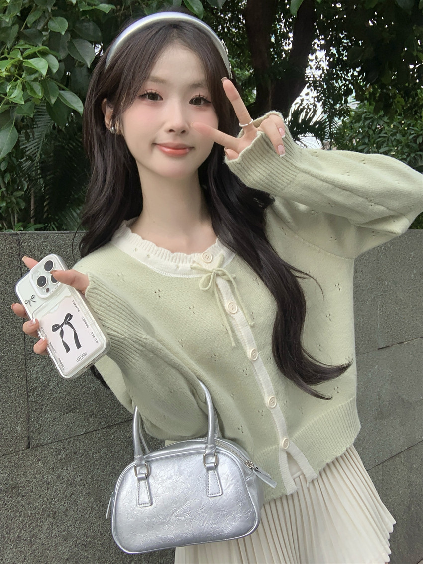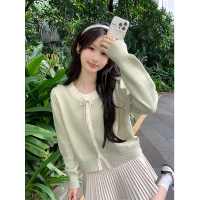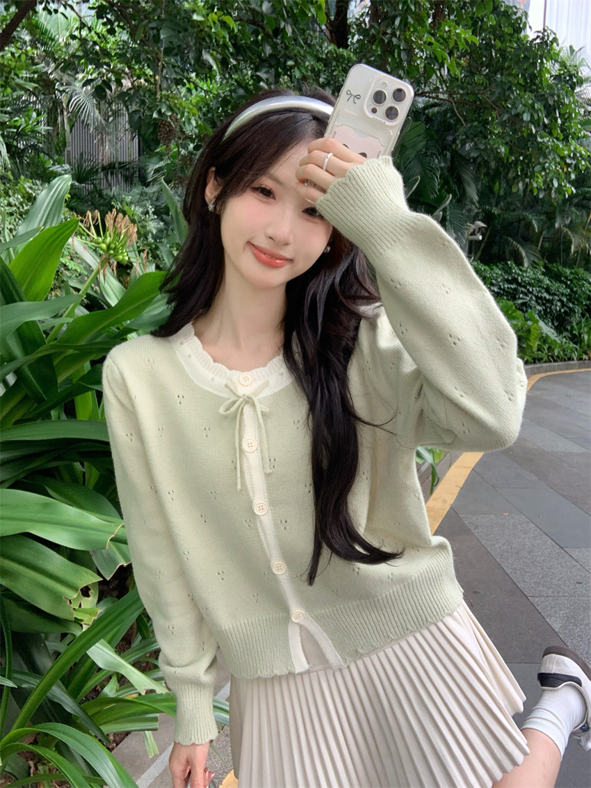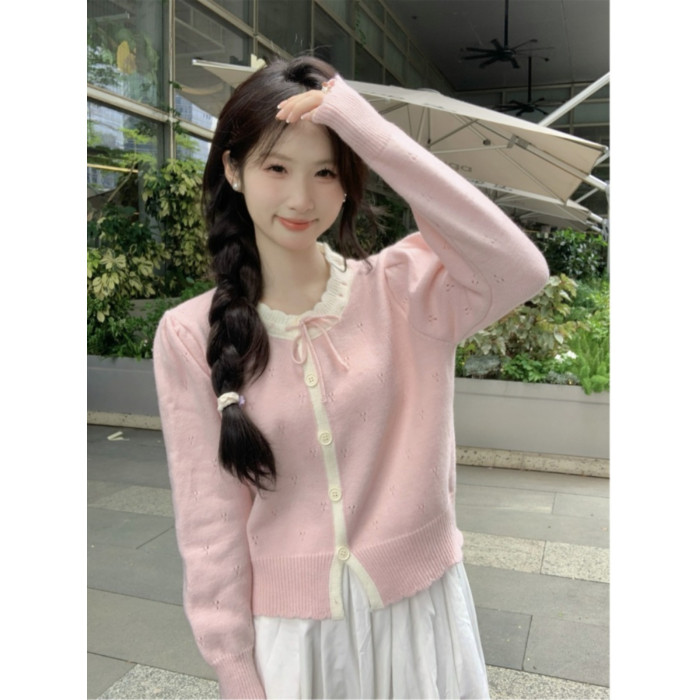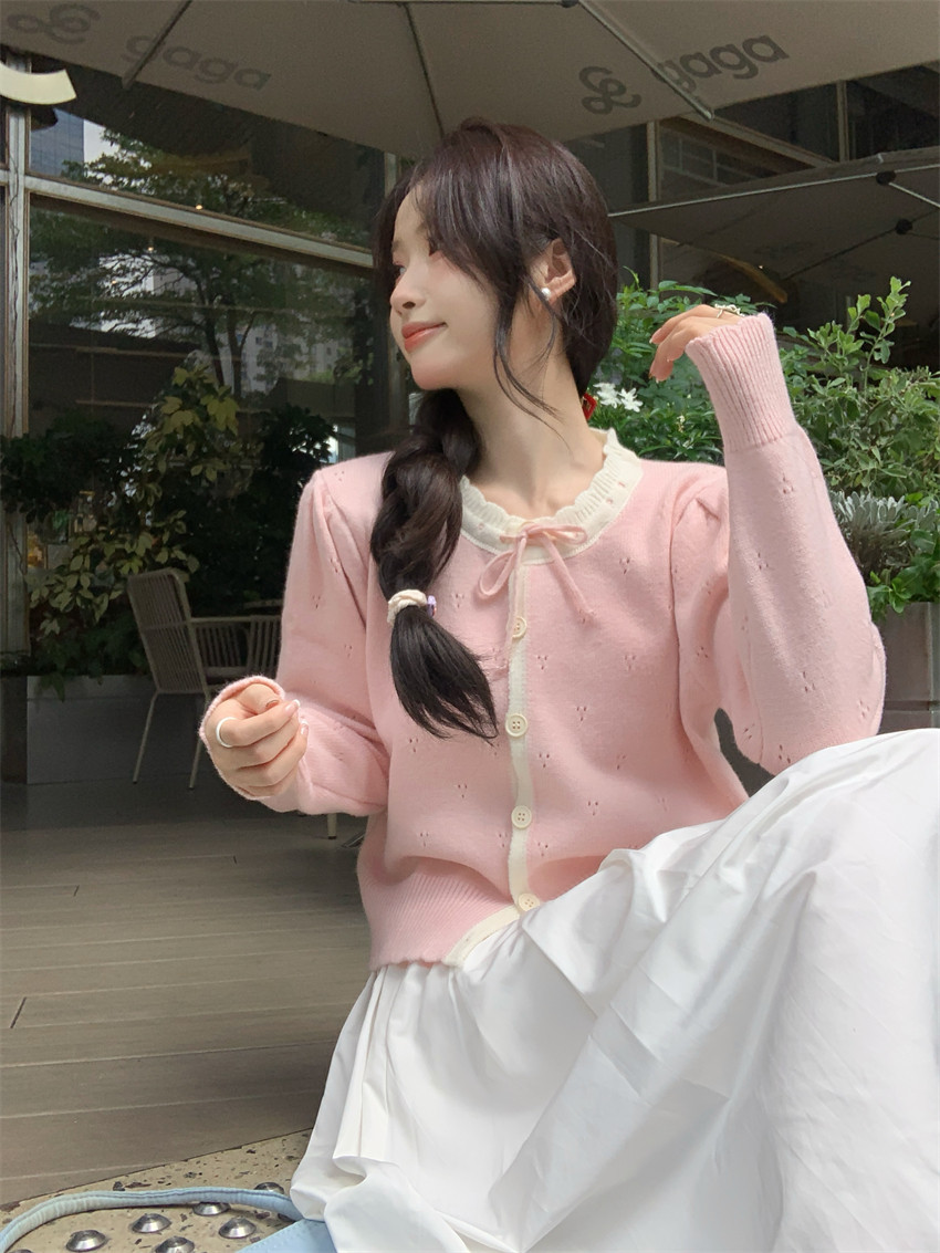 時尚溫柔粉色毛衣外套女秋季2025新款蝴蝶結寬鬆軟糯甜美針織開衫