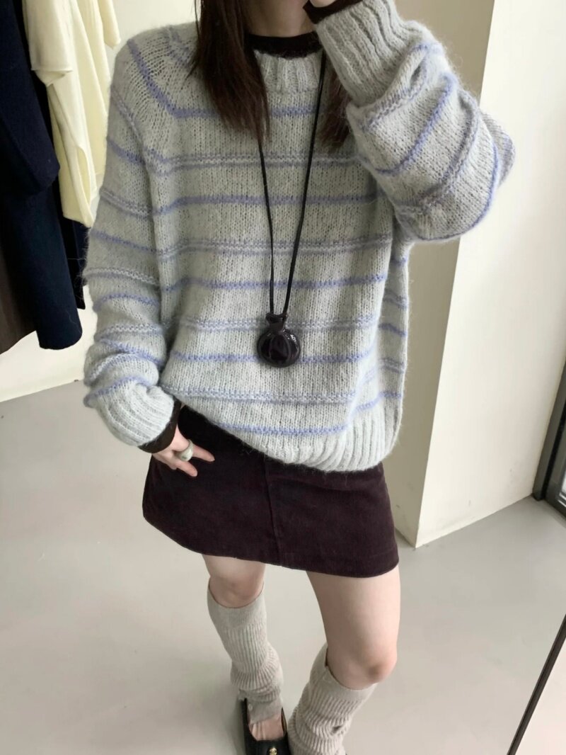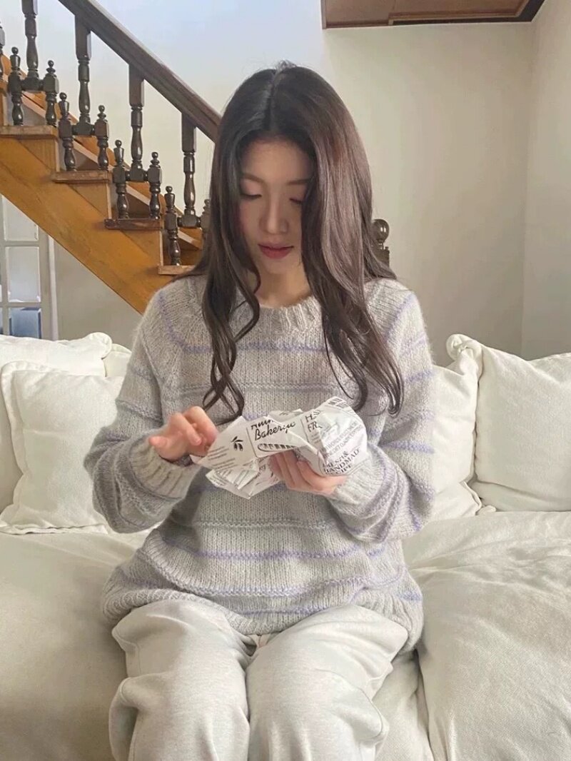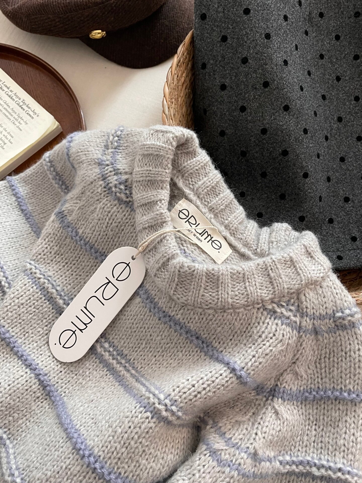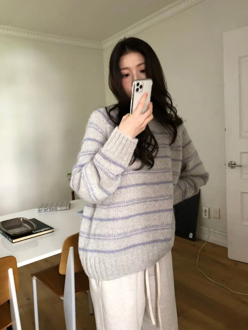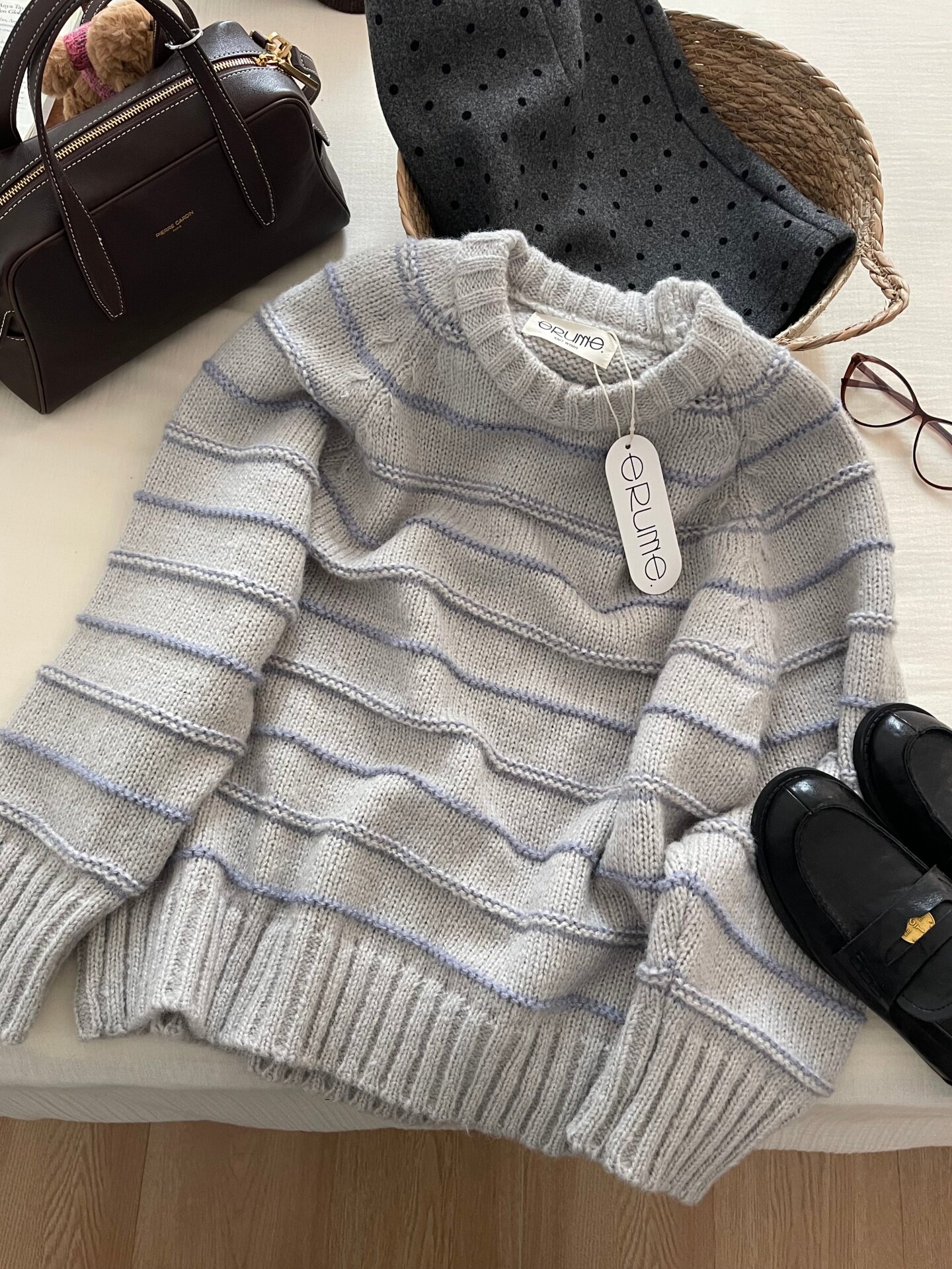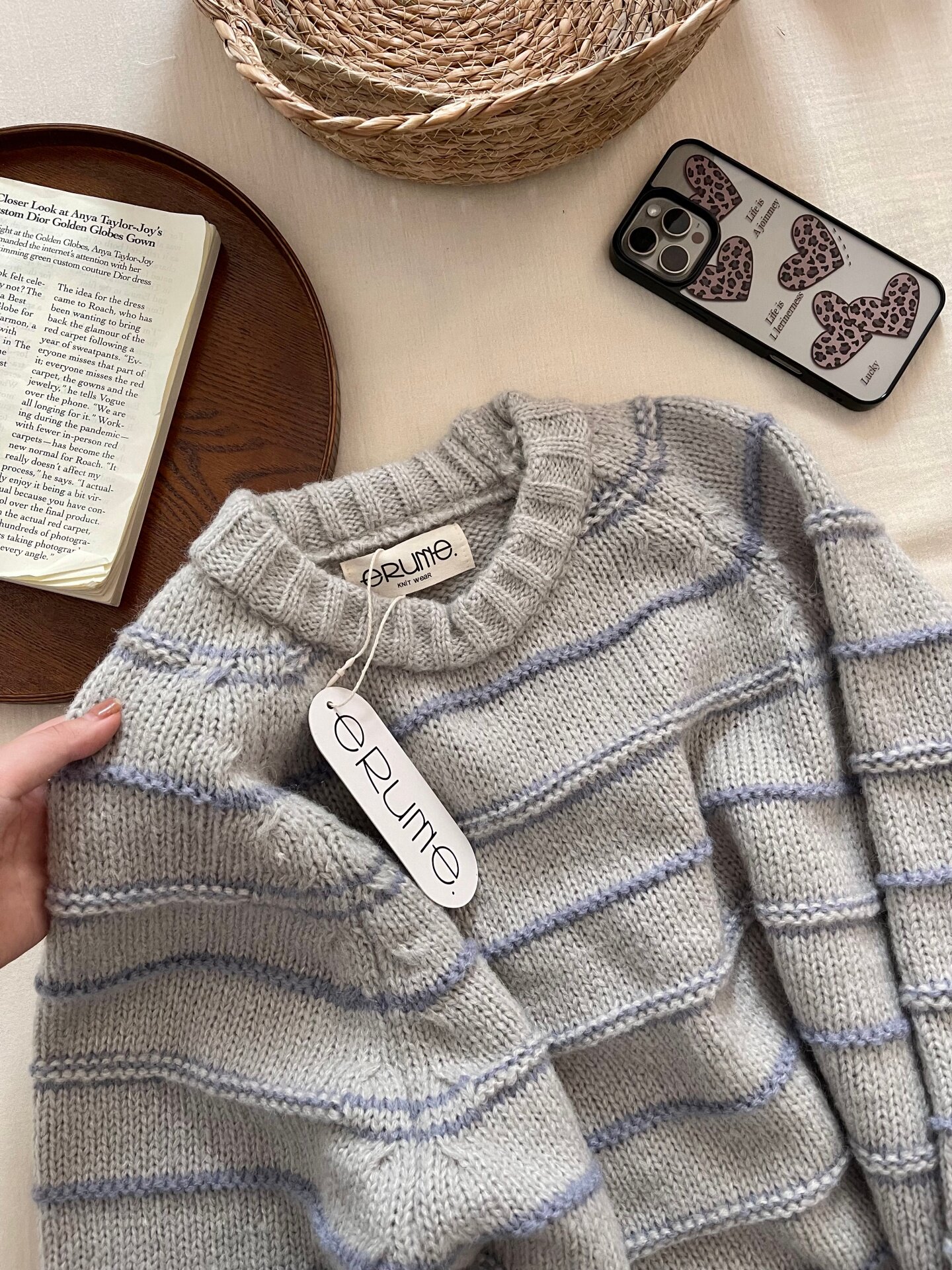 韓代@eru*e 超美的霧霾灰藍色!溫柔韓系氛圍感寬松圓領條紋毛衣