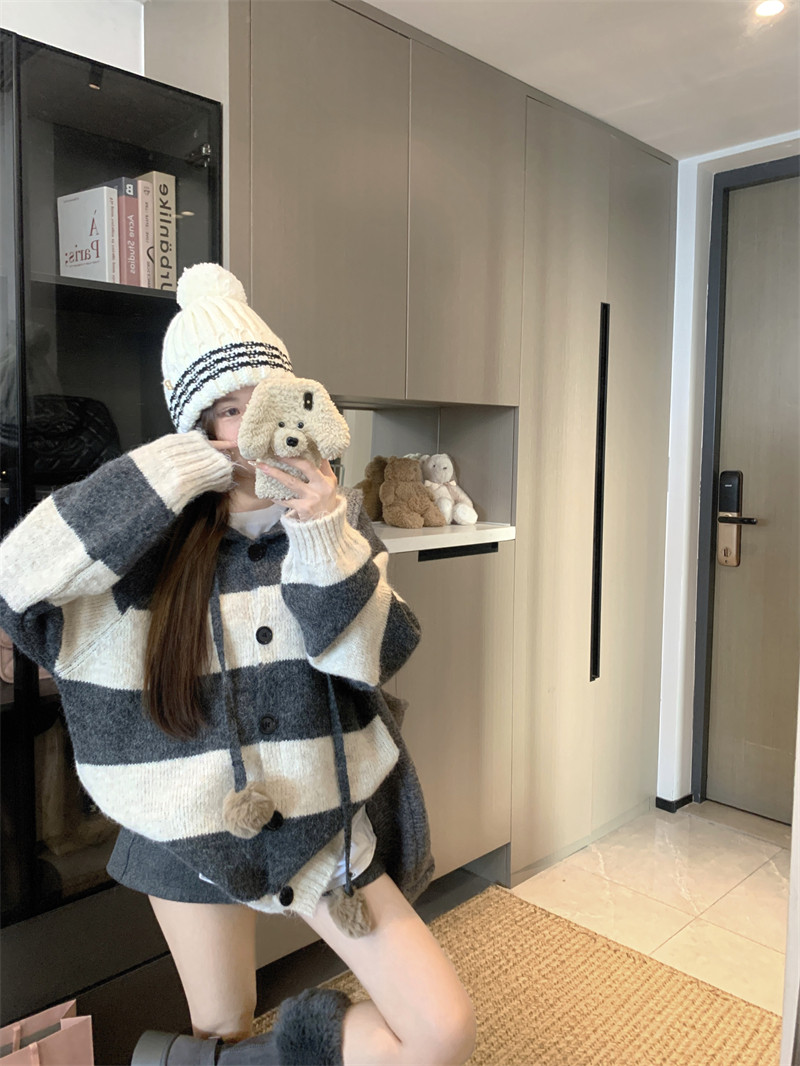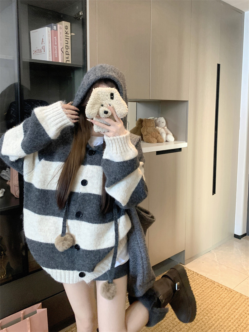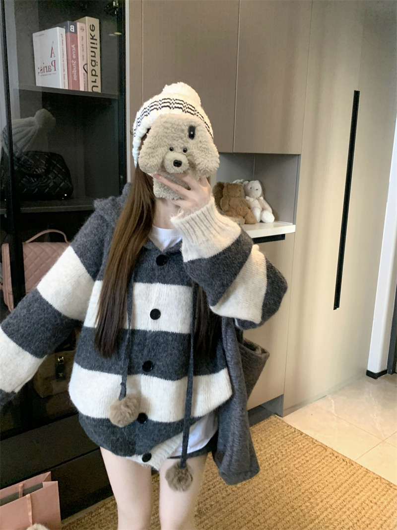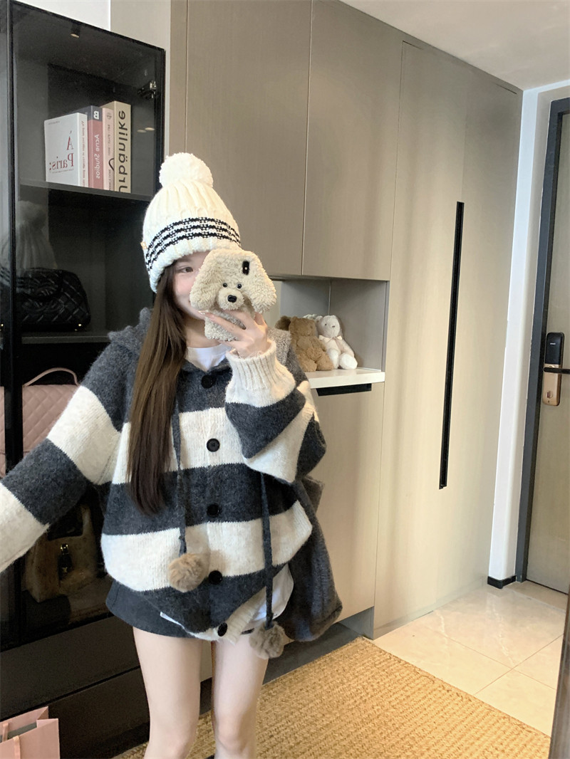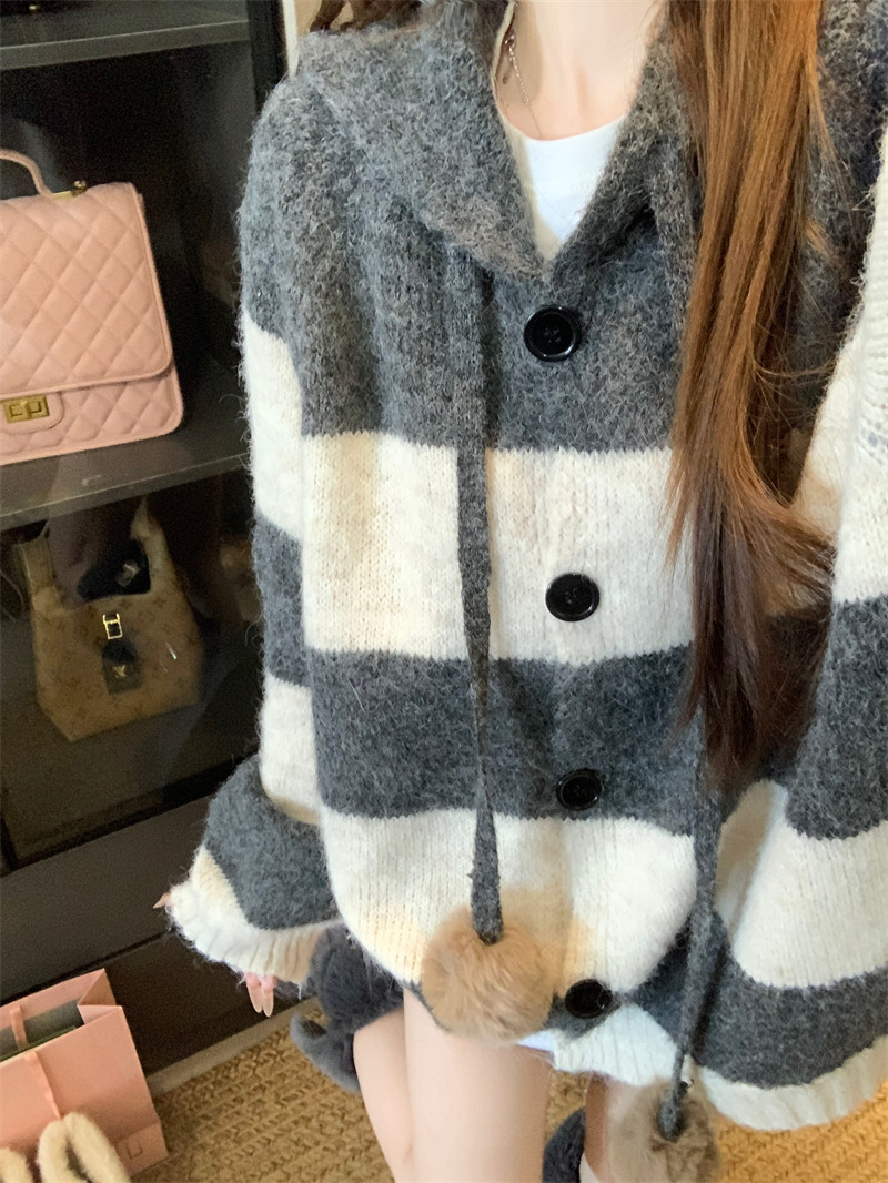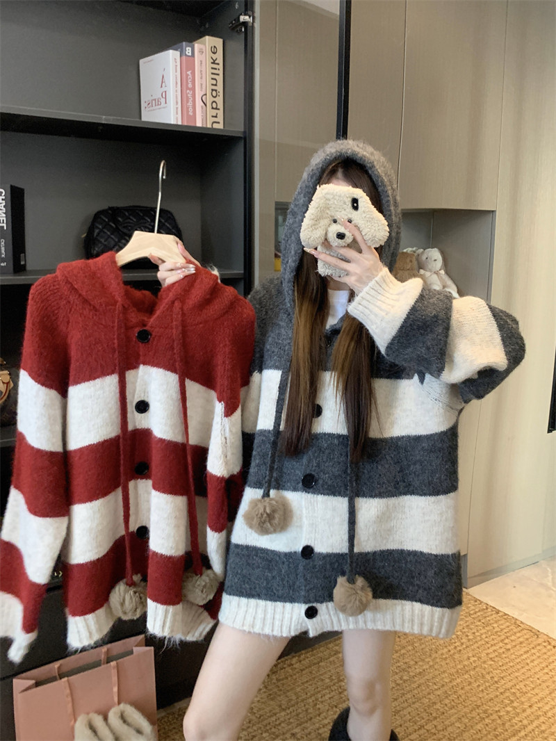 復古條紋連帽毛球開衫毛衣外套女秋季2025新款軟糯針織中長款上衣