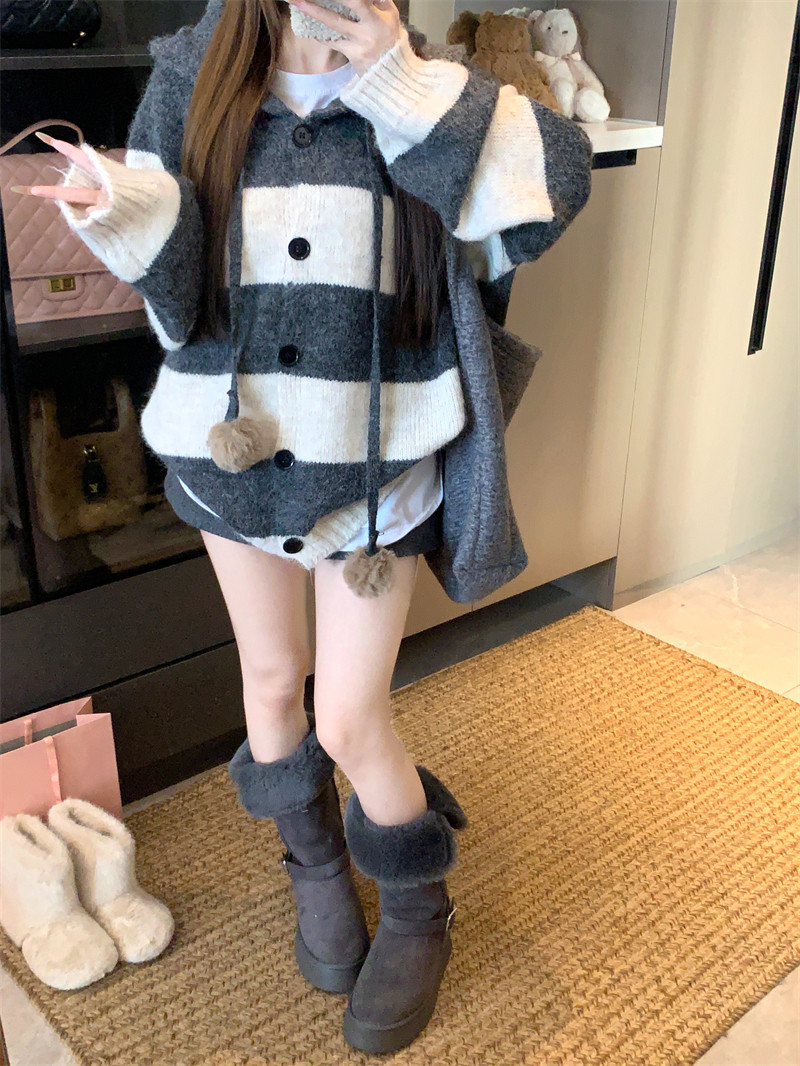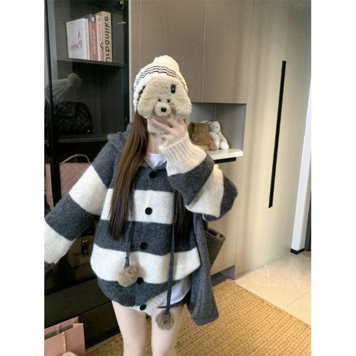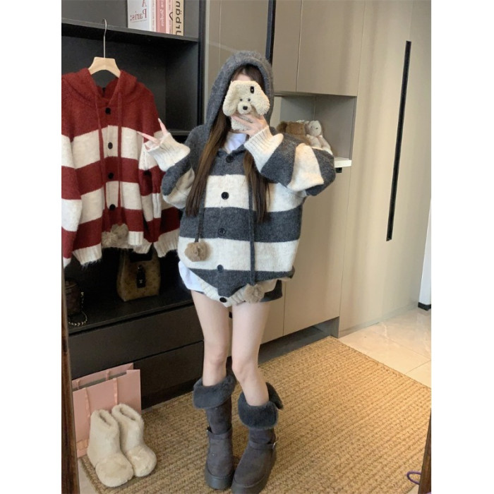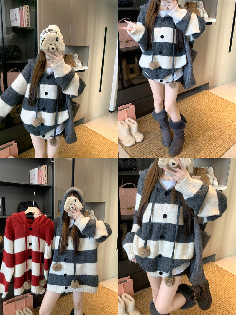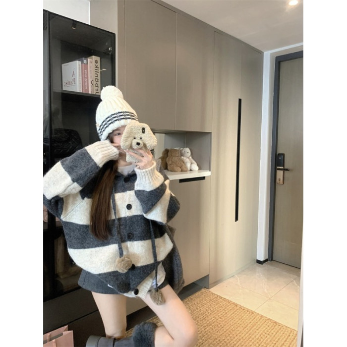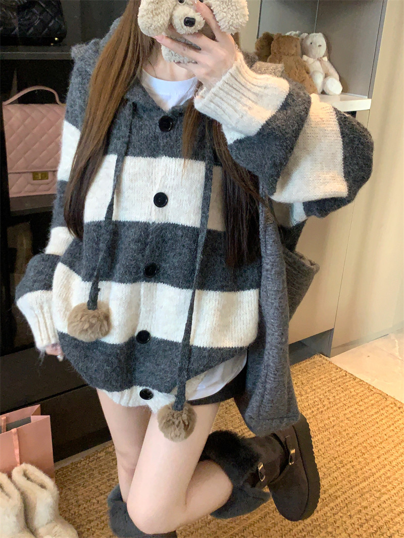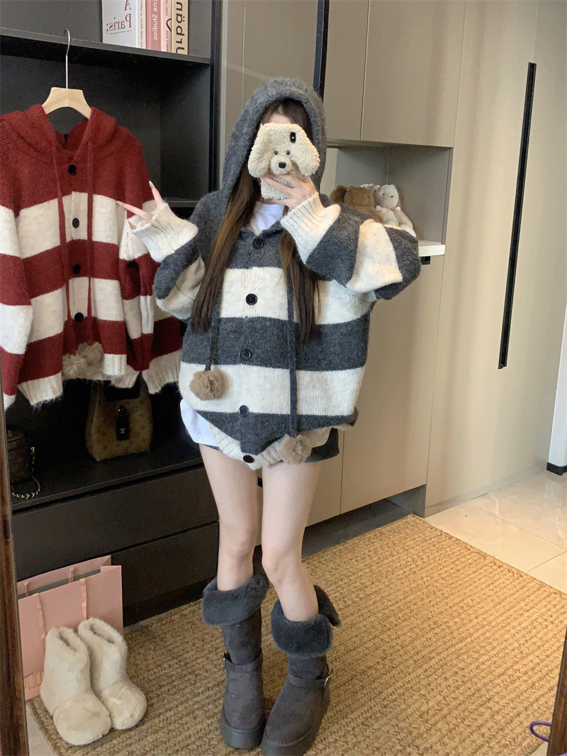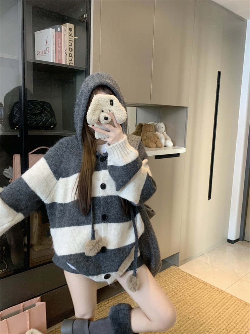 復古條紋連帽毛球開衫毛衣外套女秋季2025新款軟糯針織中長款上衣